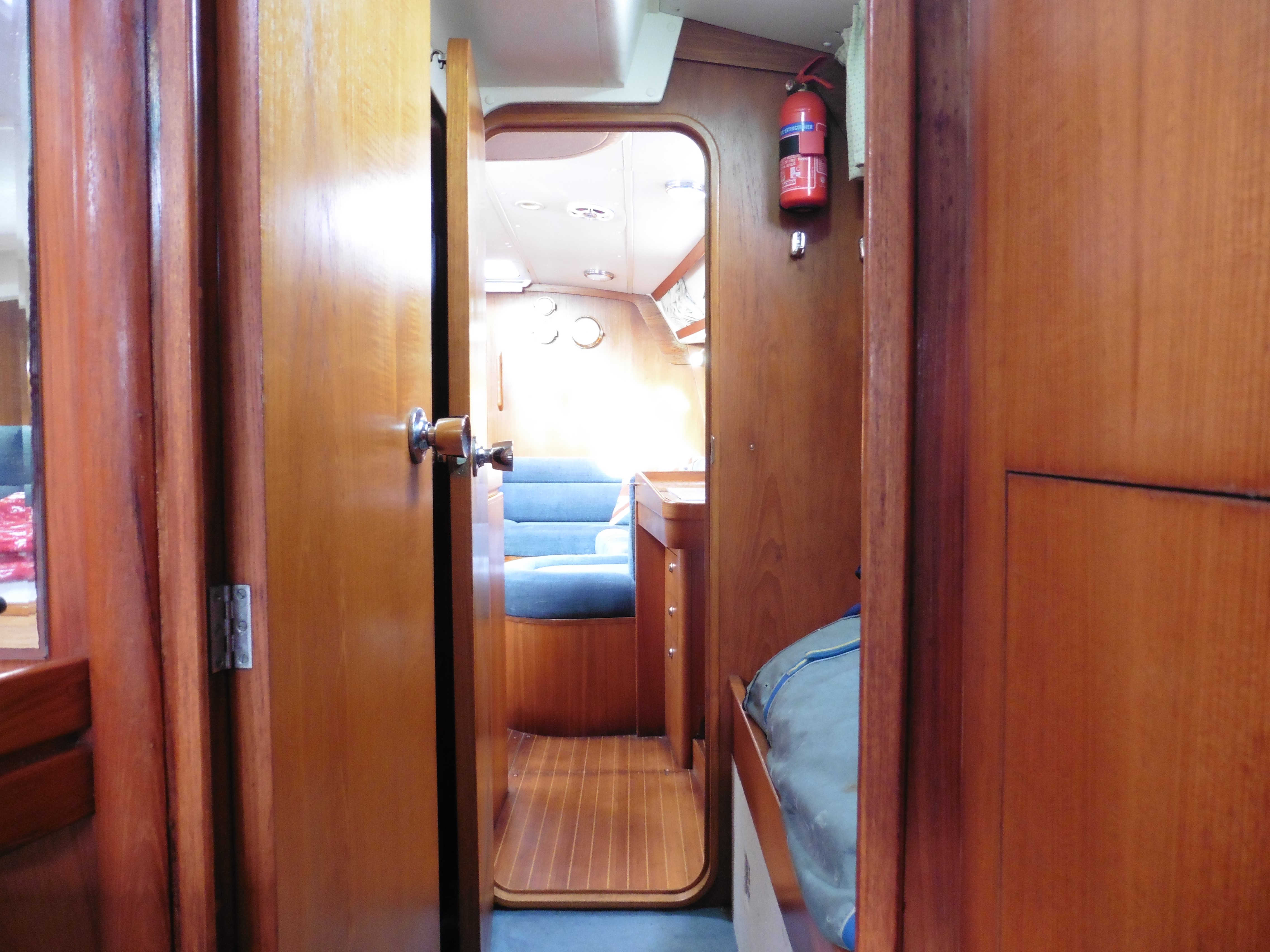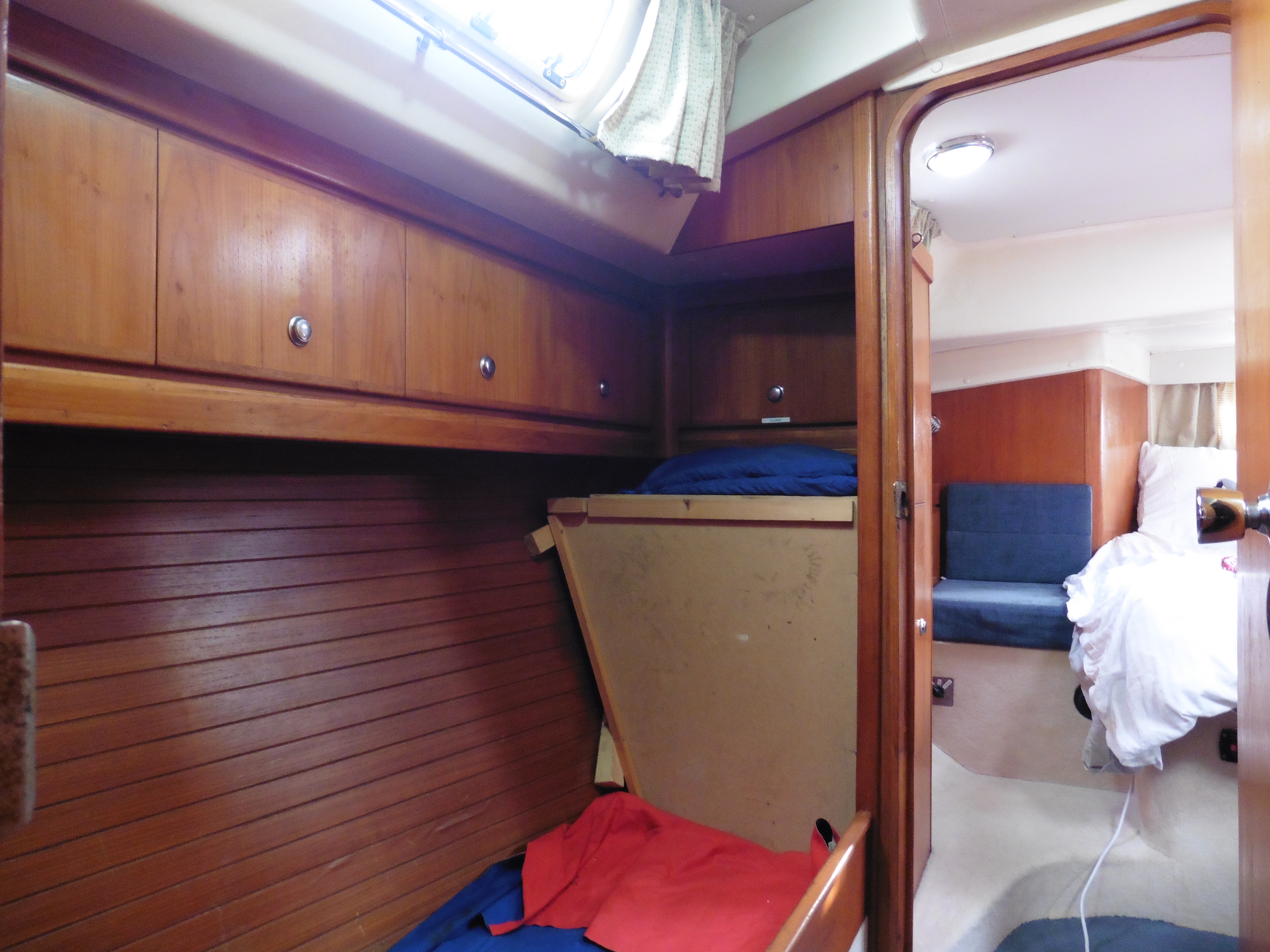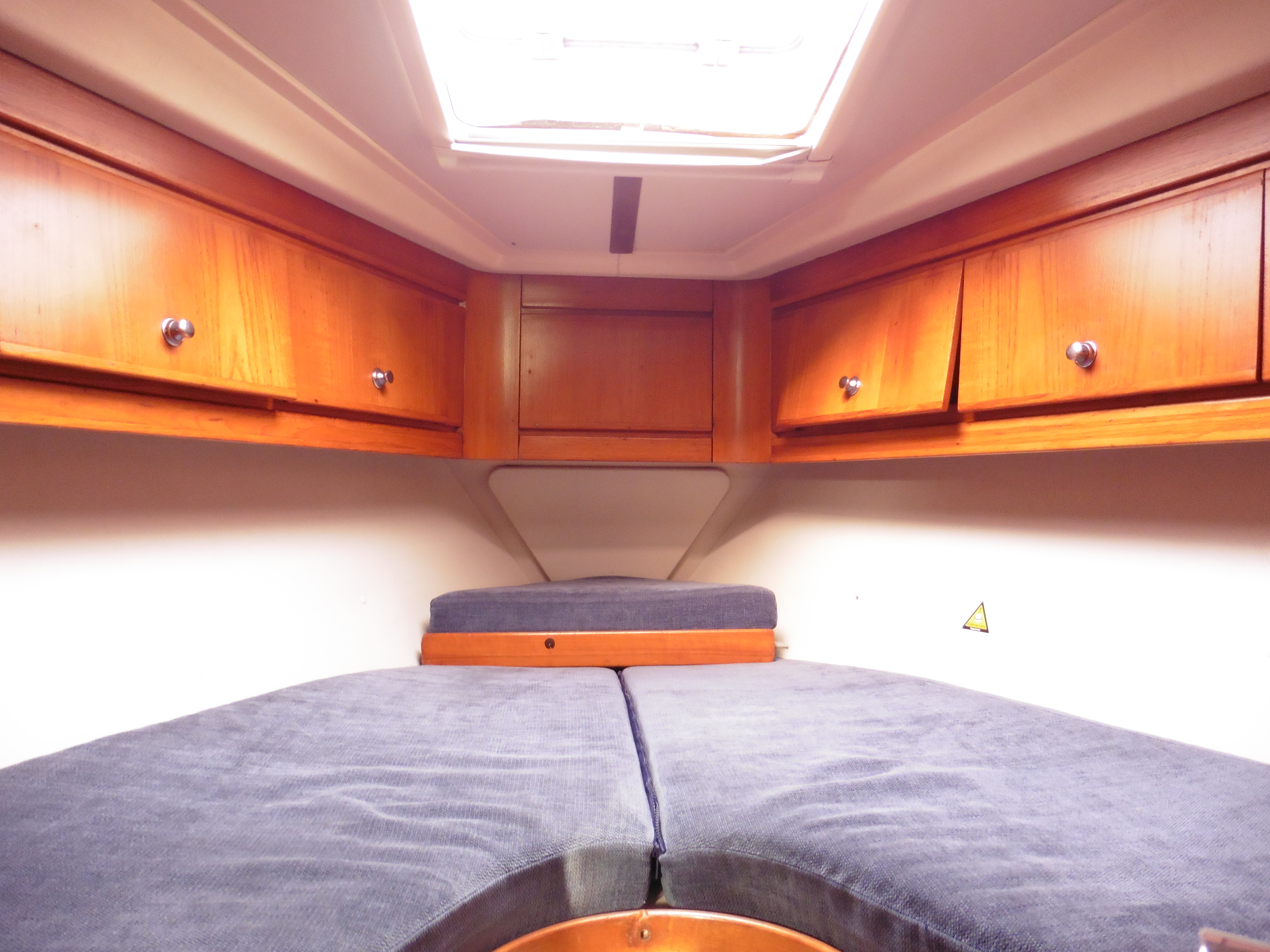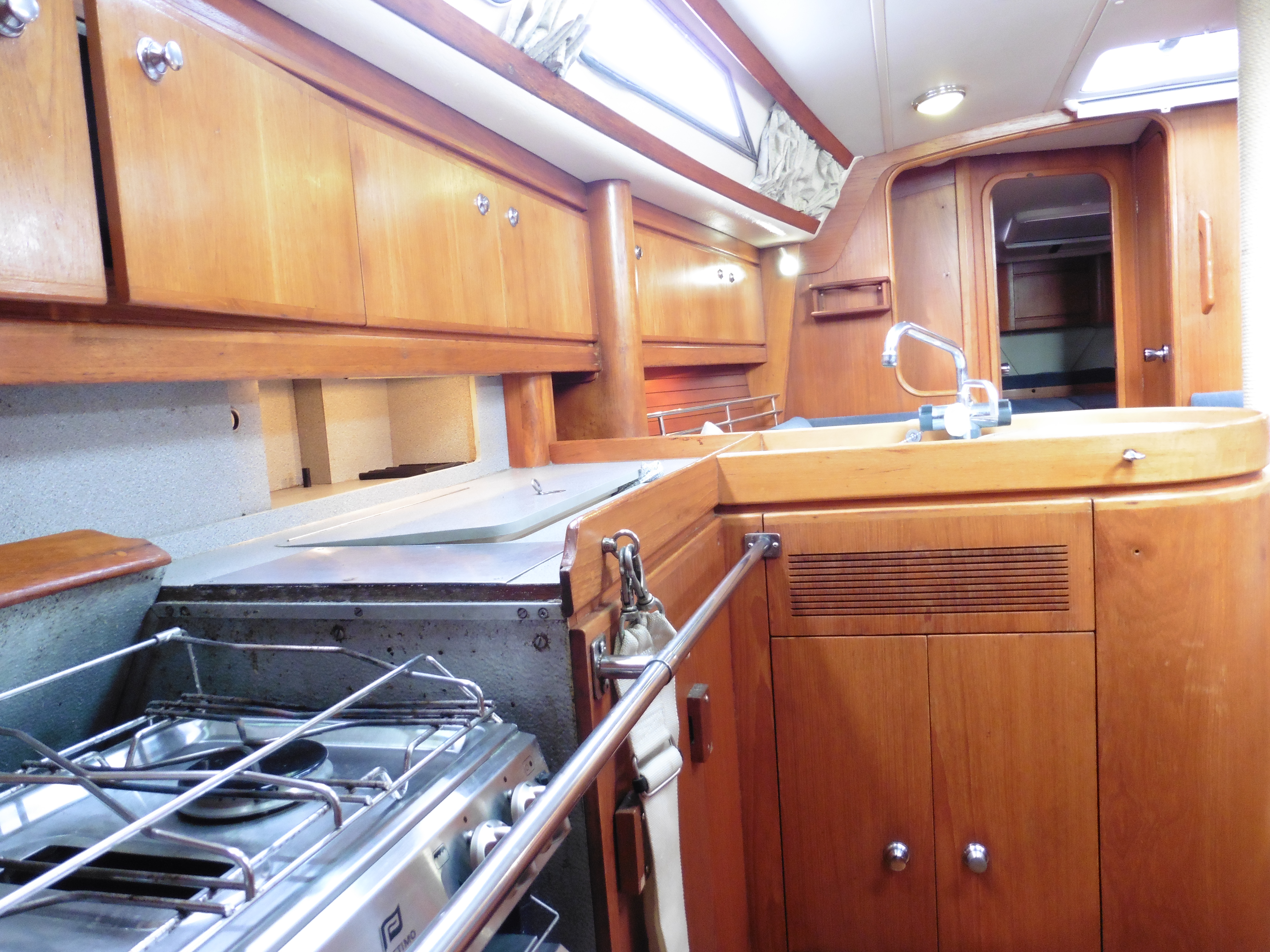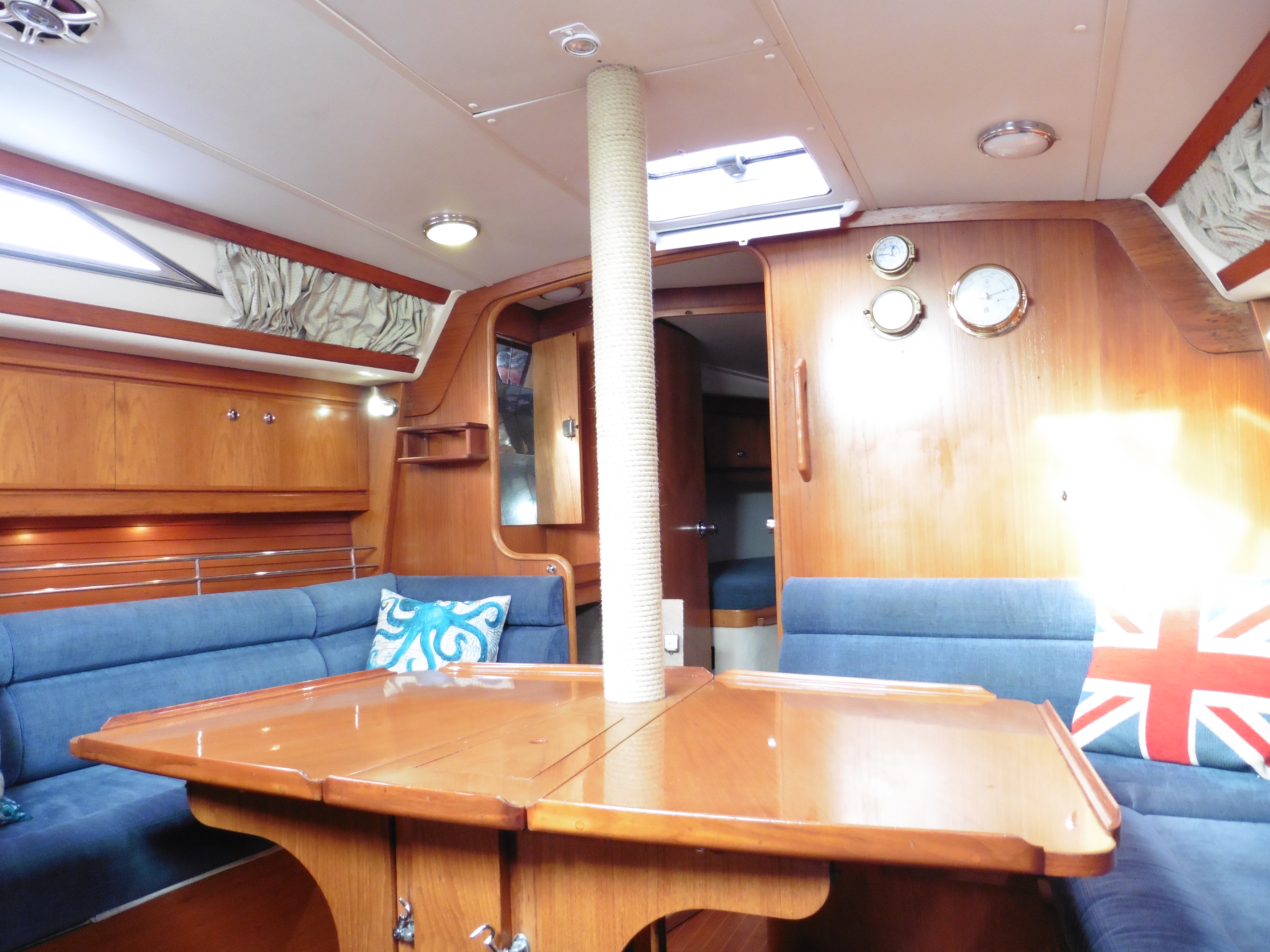 The Moody 38 was designed by Bill Dixon, a partnership with Moody Yachts that started in the early eighties. As with any centre cockpit yacht there is a very secure feeling when sailing, plenty of protection from the elements but the ability to access and move around the wide decks is easily achieved. The interior is spacious and comfortable with ample storage around every part of the boat, the large aft master with central island bed is impressive and the saloon is a generous size with large table and seating. These are well regarded as strongly built yachts that can handle coastal cruising as well as ocean crossings.