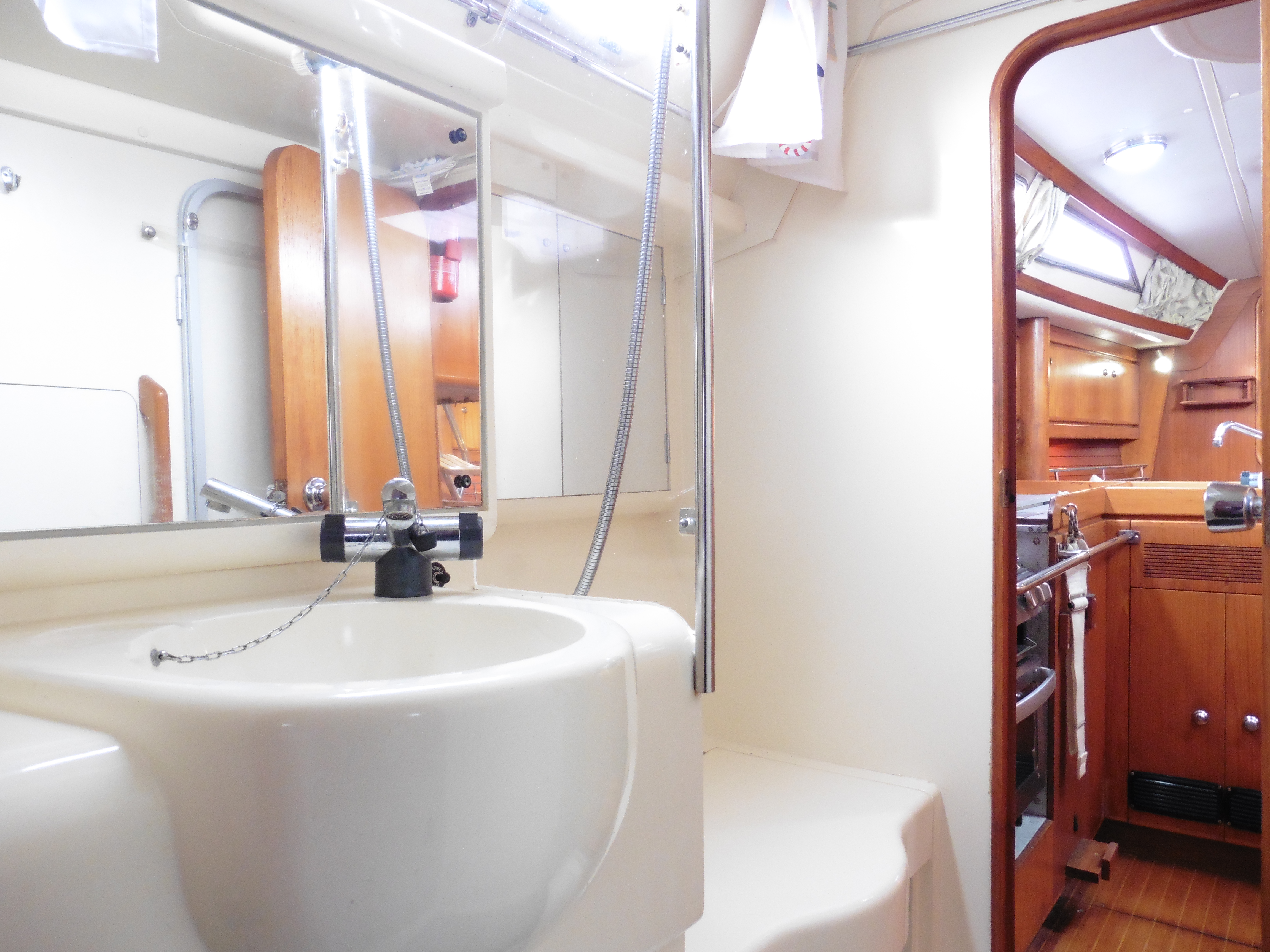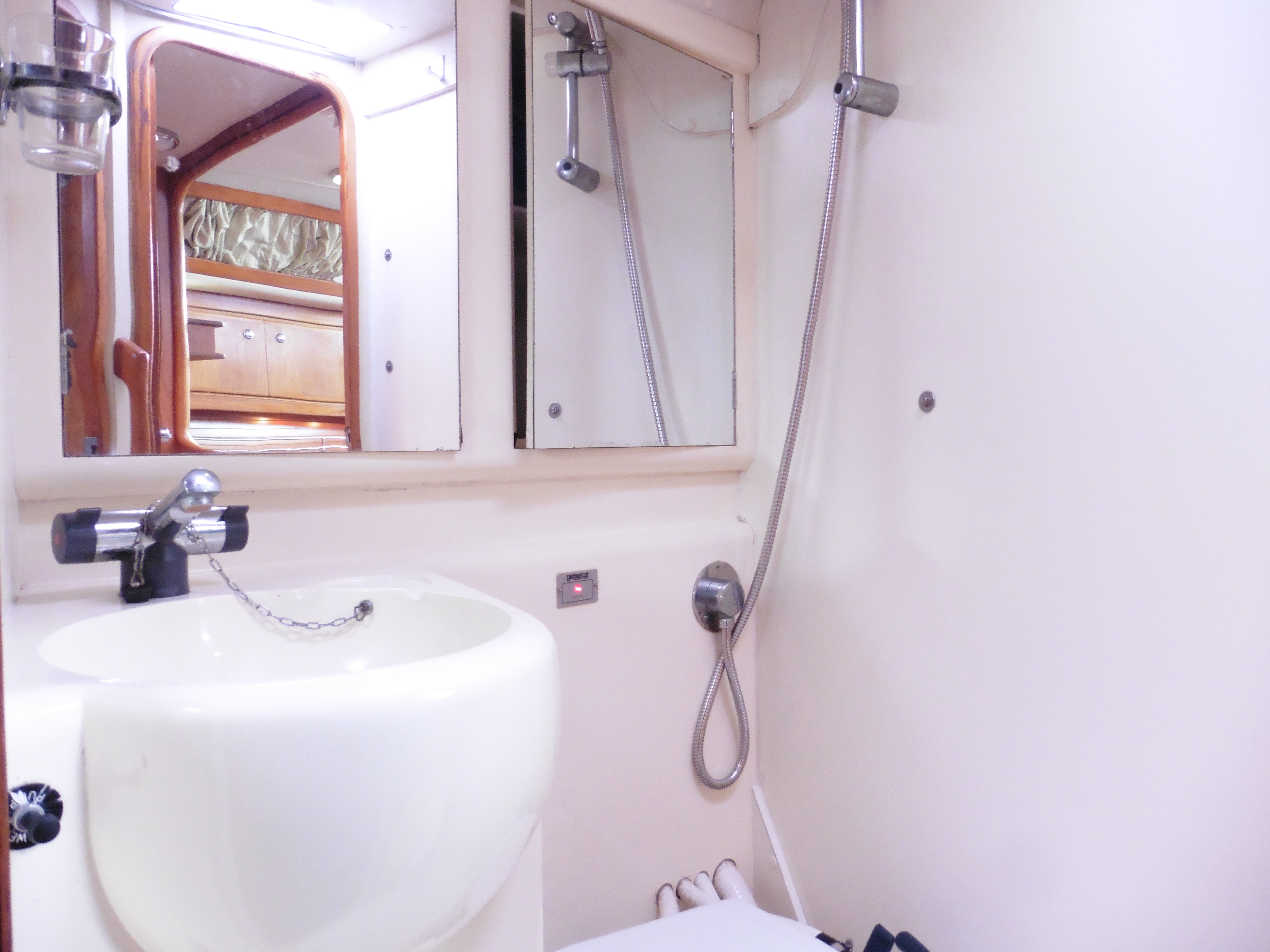 Passageway heads from galley to cabin with shower, toilet and basin with mixer tap