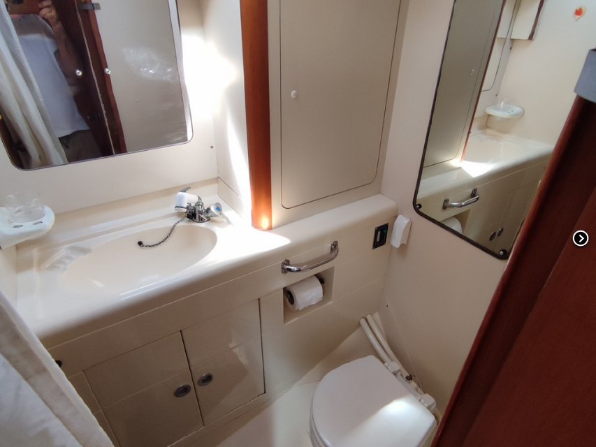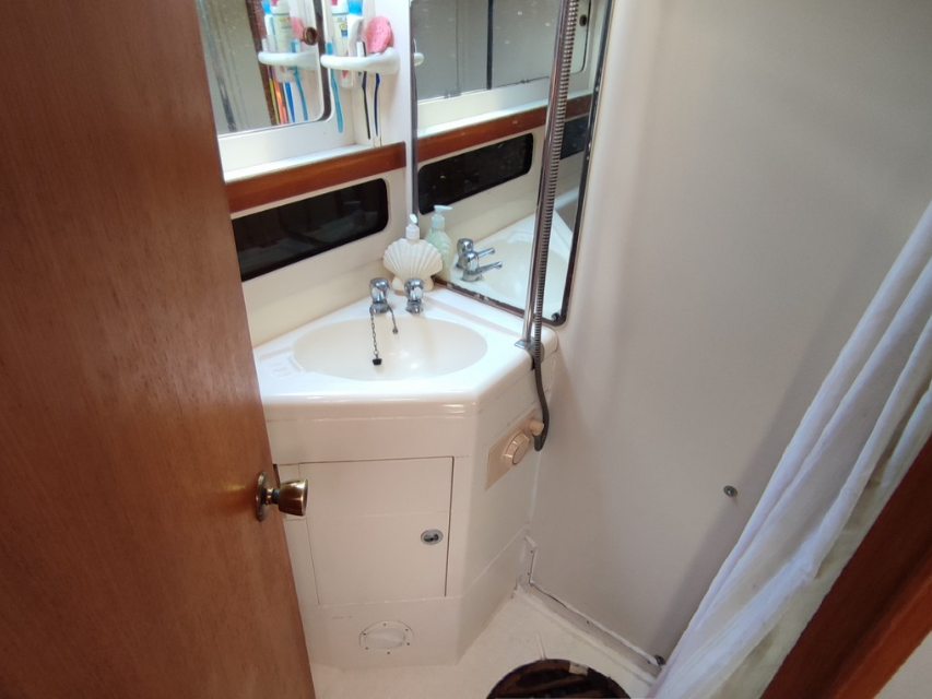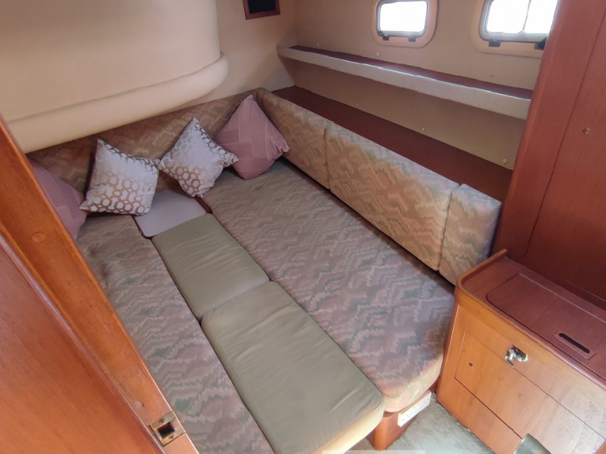 The aft cabin features a double berth with its own wash basin. All cabins have hanging lockers and extensive storage space.