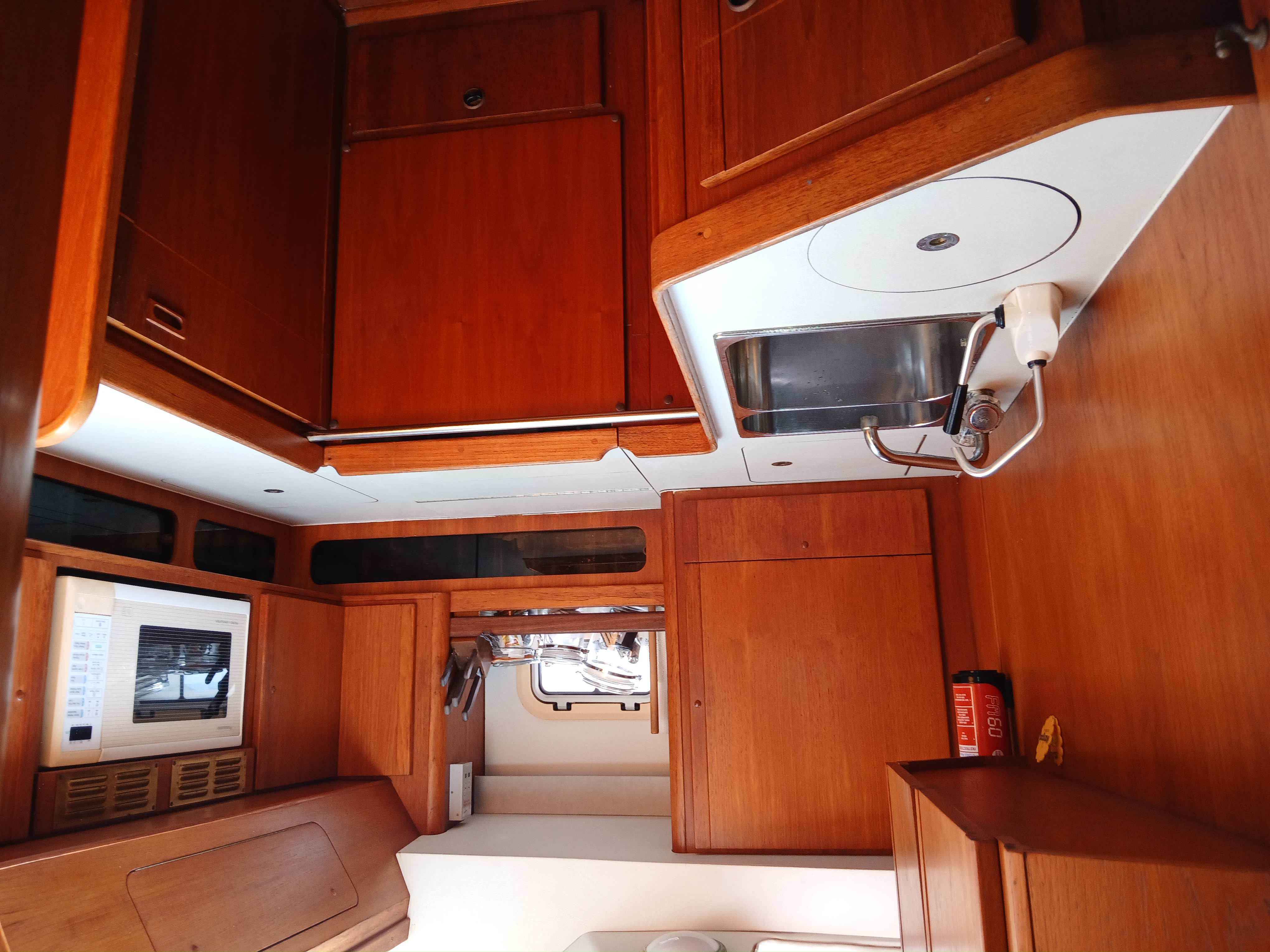 The teak trimmed galley is positioned low and mid ship to minimise movement at sea. It is comprehensively equipped