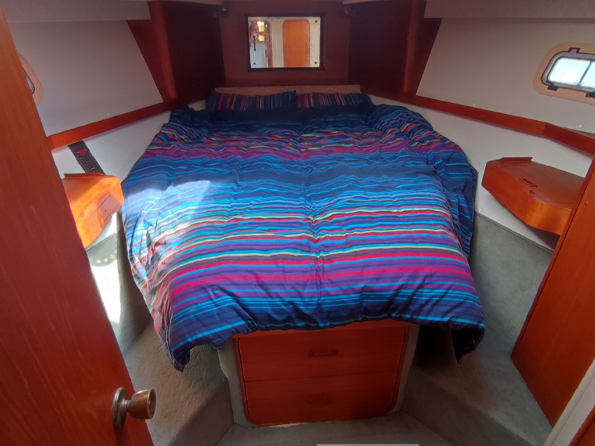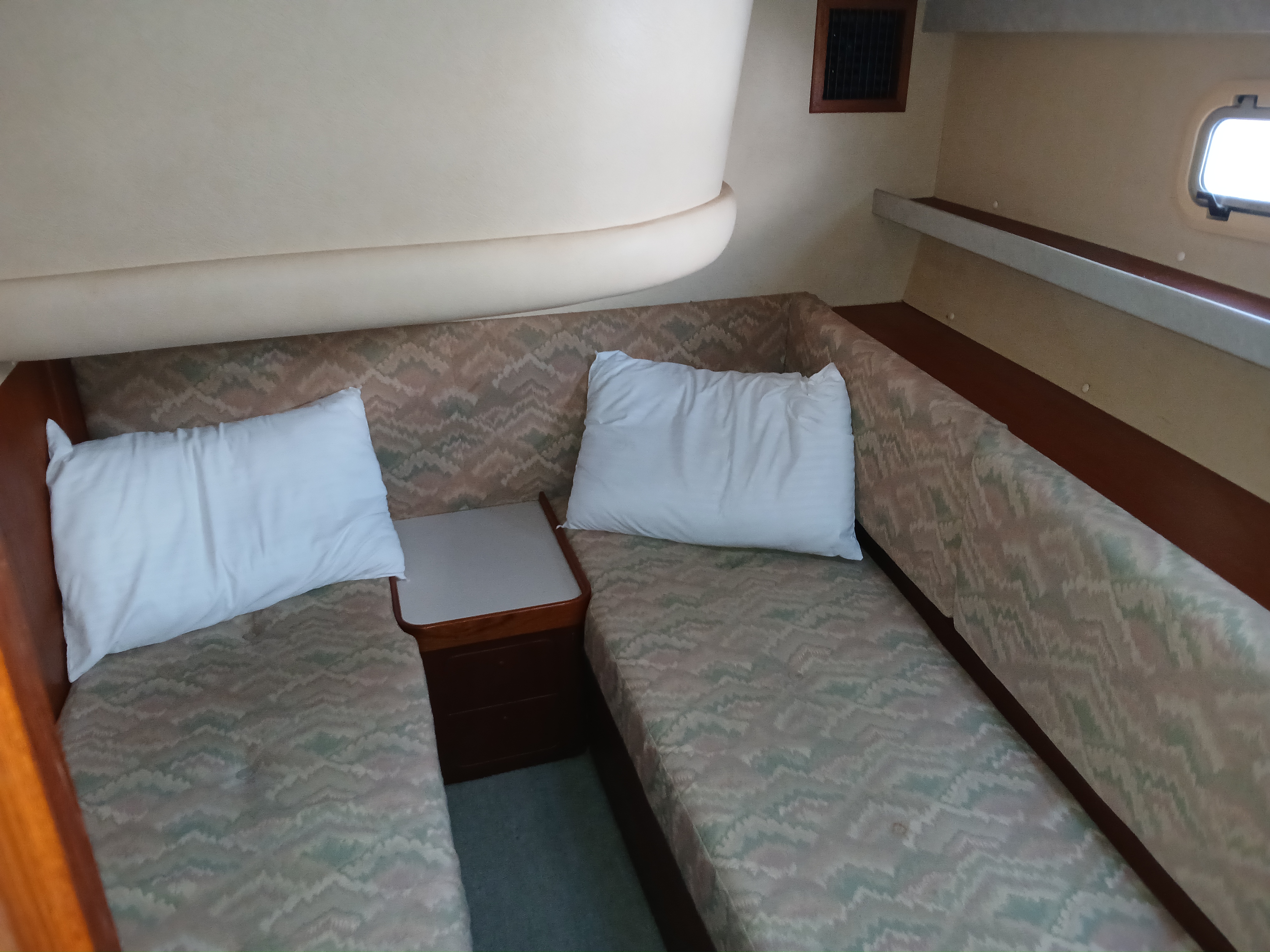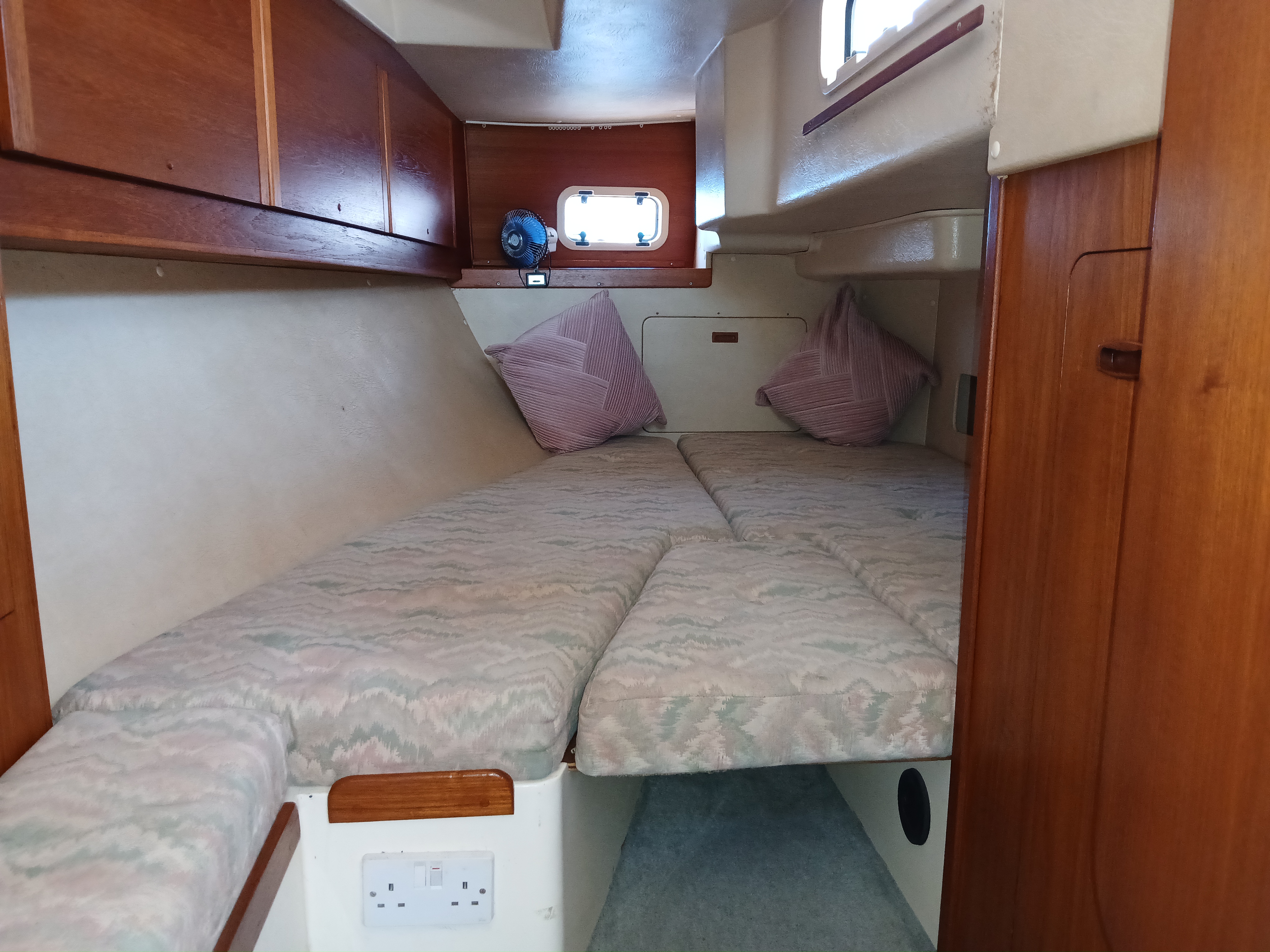 The guest cabin to port has two single berths with infill to create a comfortable double berth and its own ensuite.
