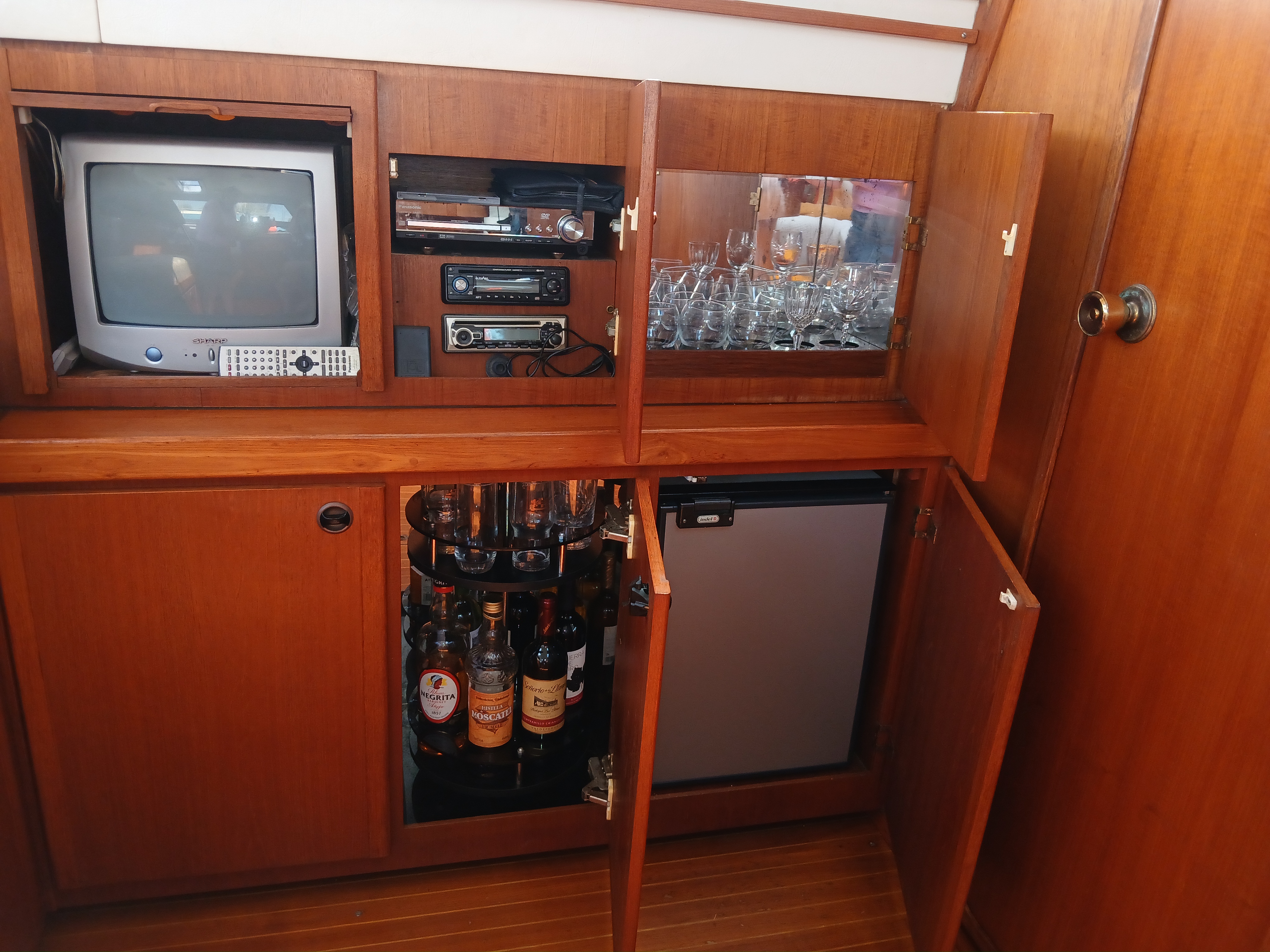Saloon has large U shaped seating to port with range of lockers on starboard containing a cocktail cabinet, and additional storage space for entertainment centre. Starboard side lower helm station with a double seat.