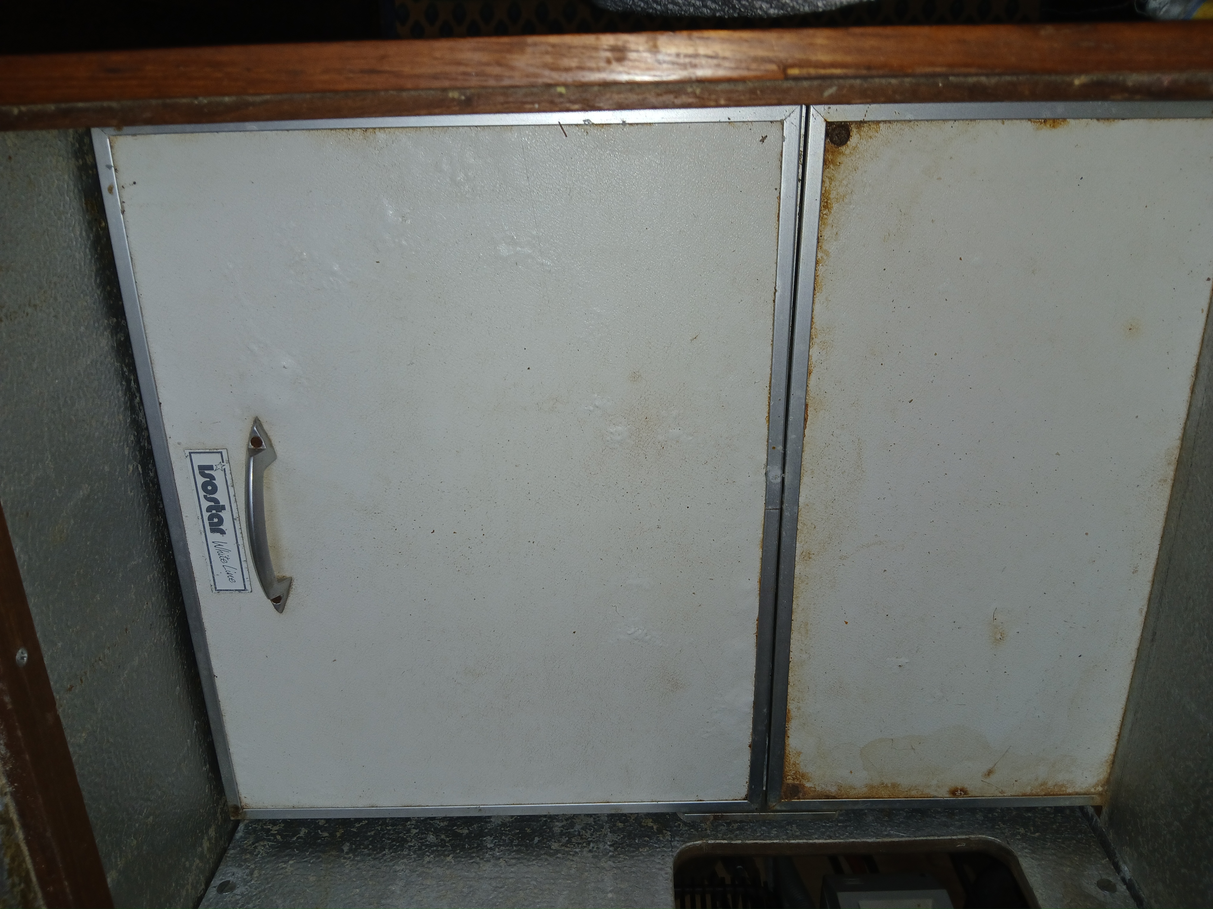 The galley is forward of the helm on starboard side, and is a U shaped arrangement comprising of: Gas hob, and microwave oven, fridge with freezer compartment, top loading freezer unit, twin stainless steel sinks, pressurised hot water system with mixer tap, plenty of stowage and laminate worktop areas.