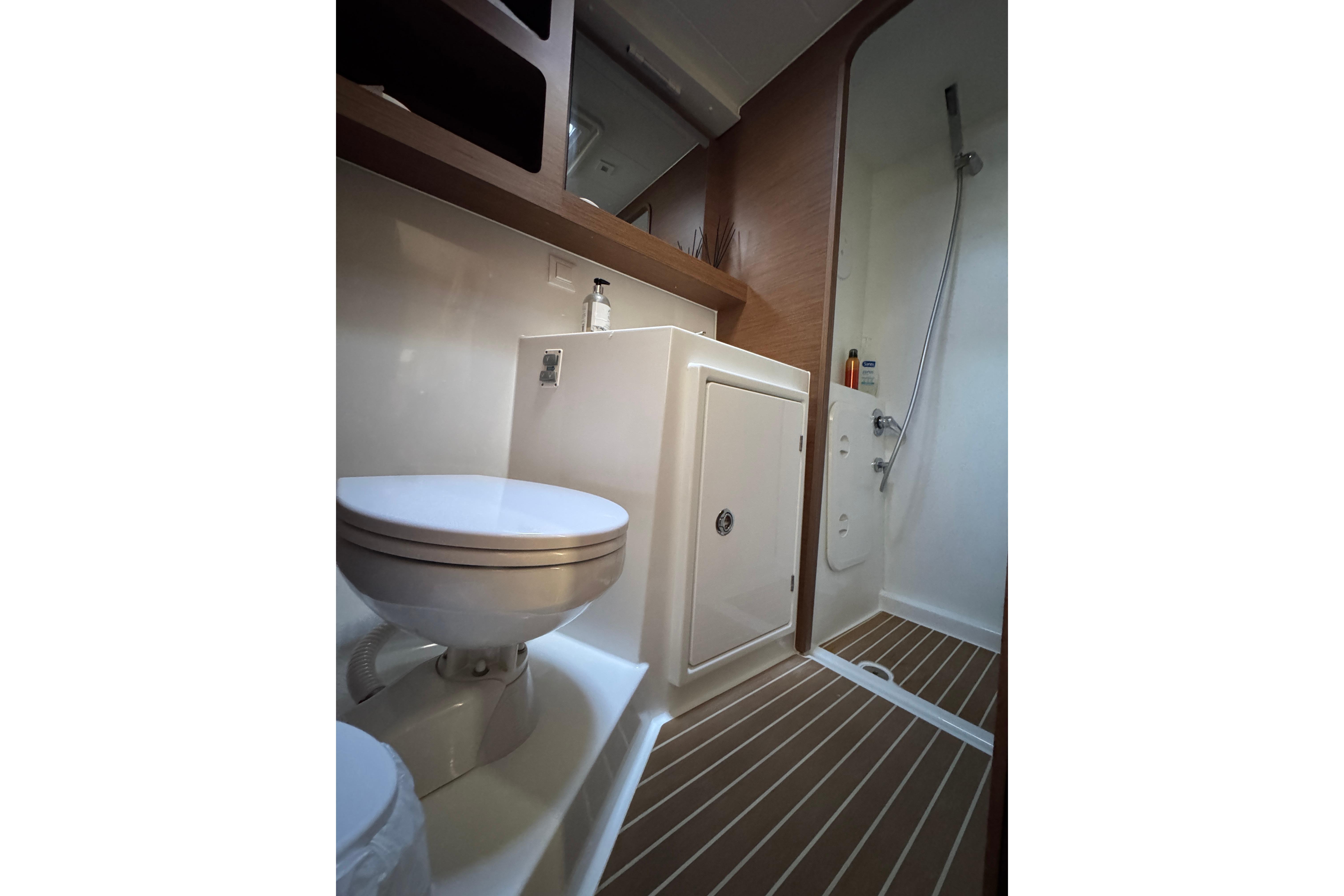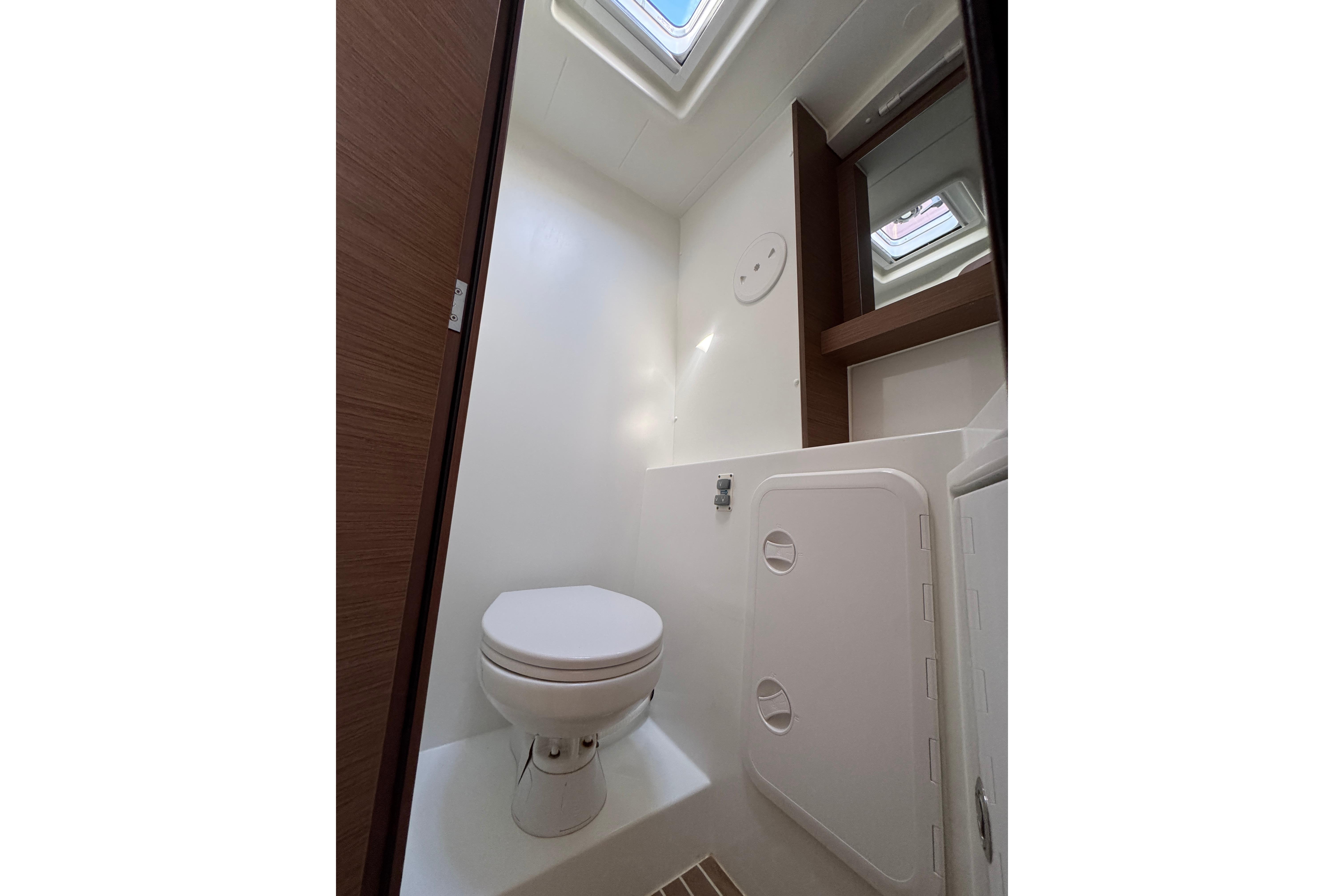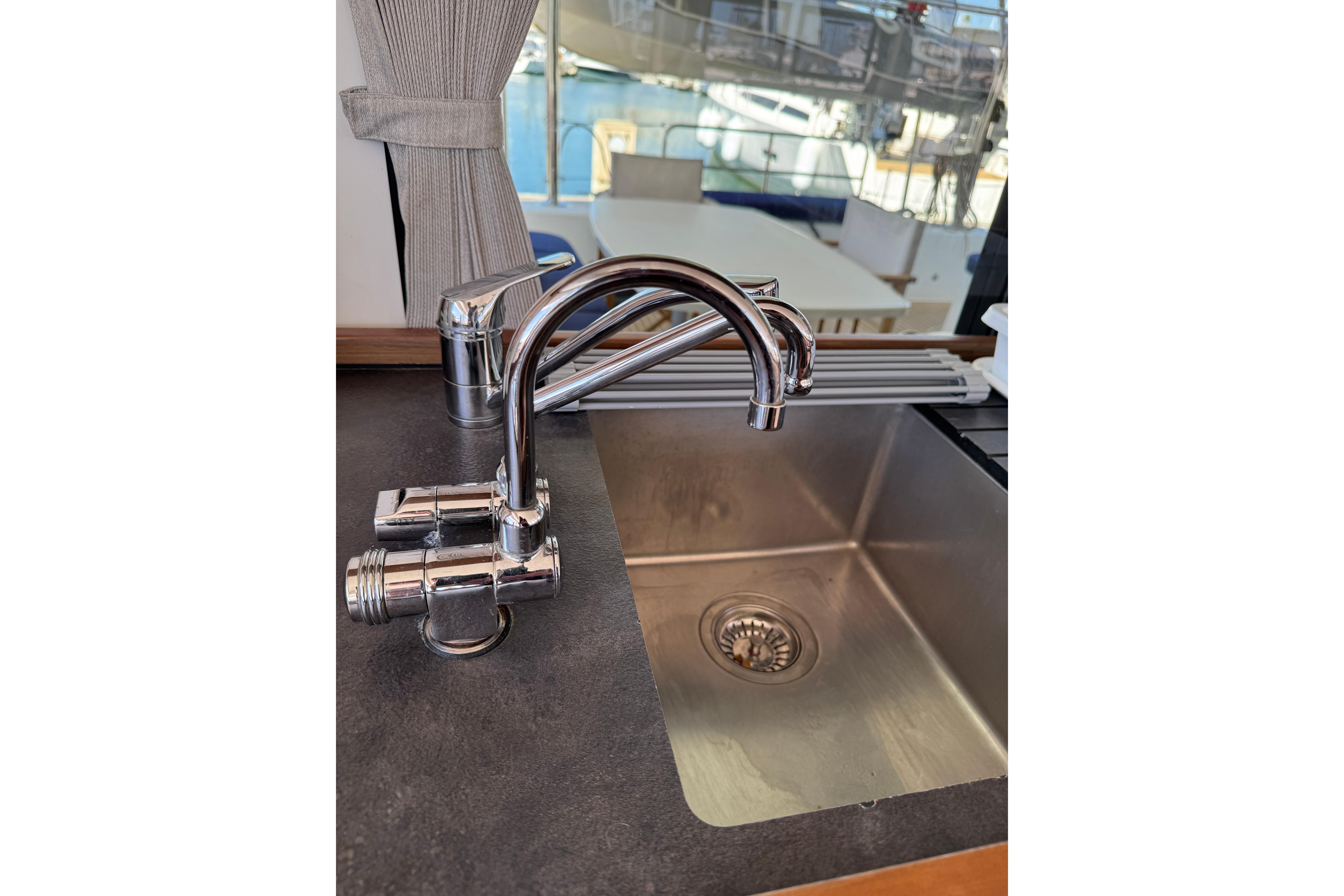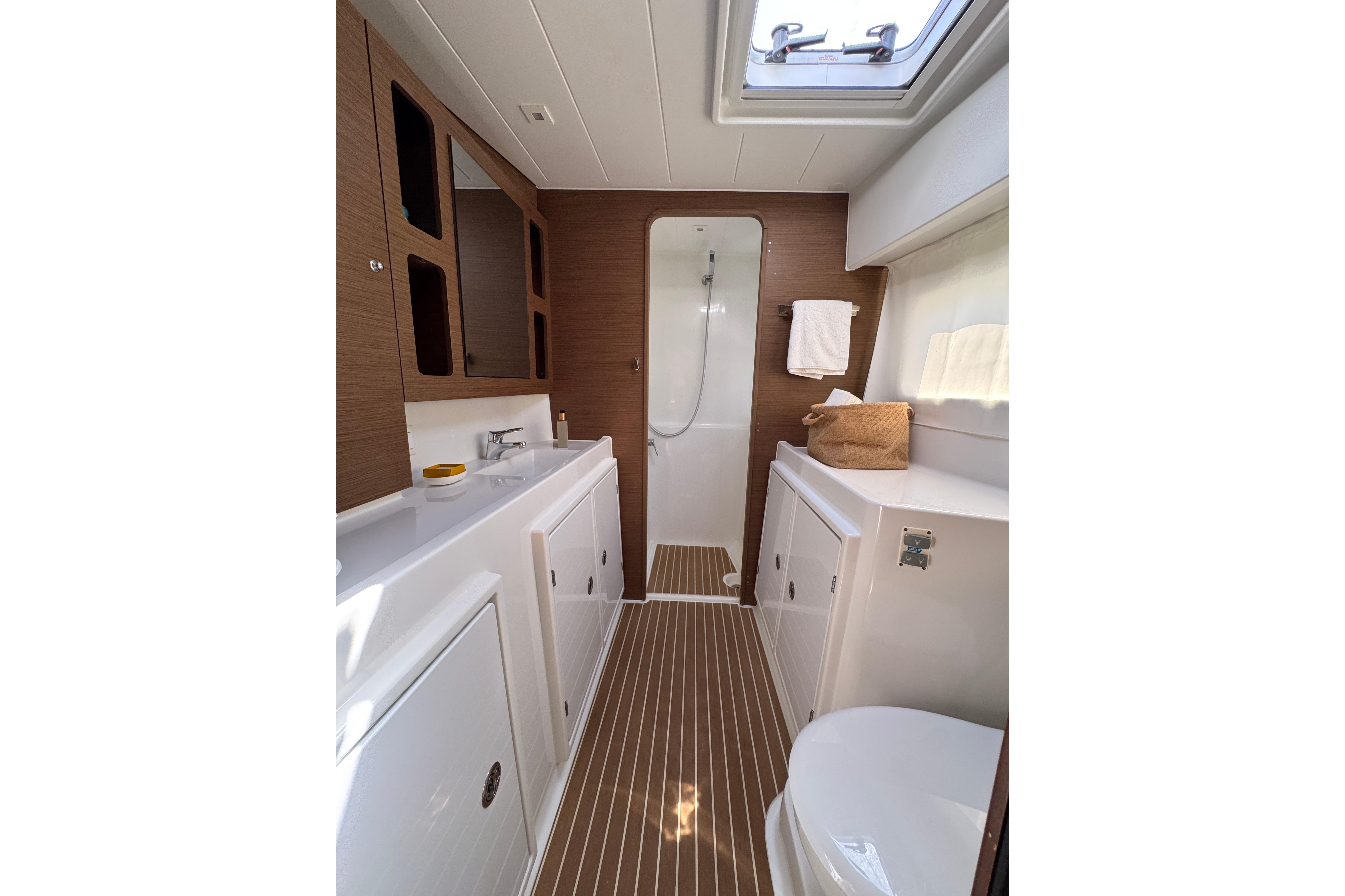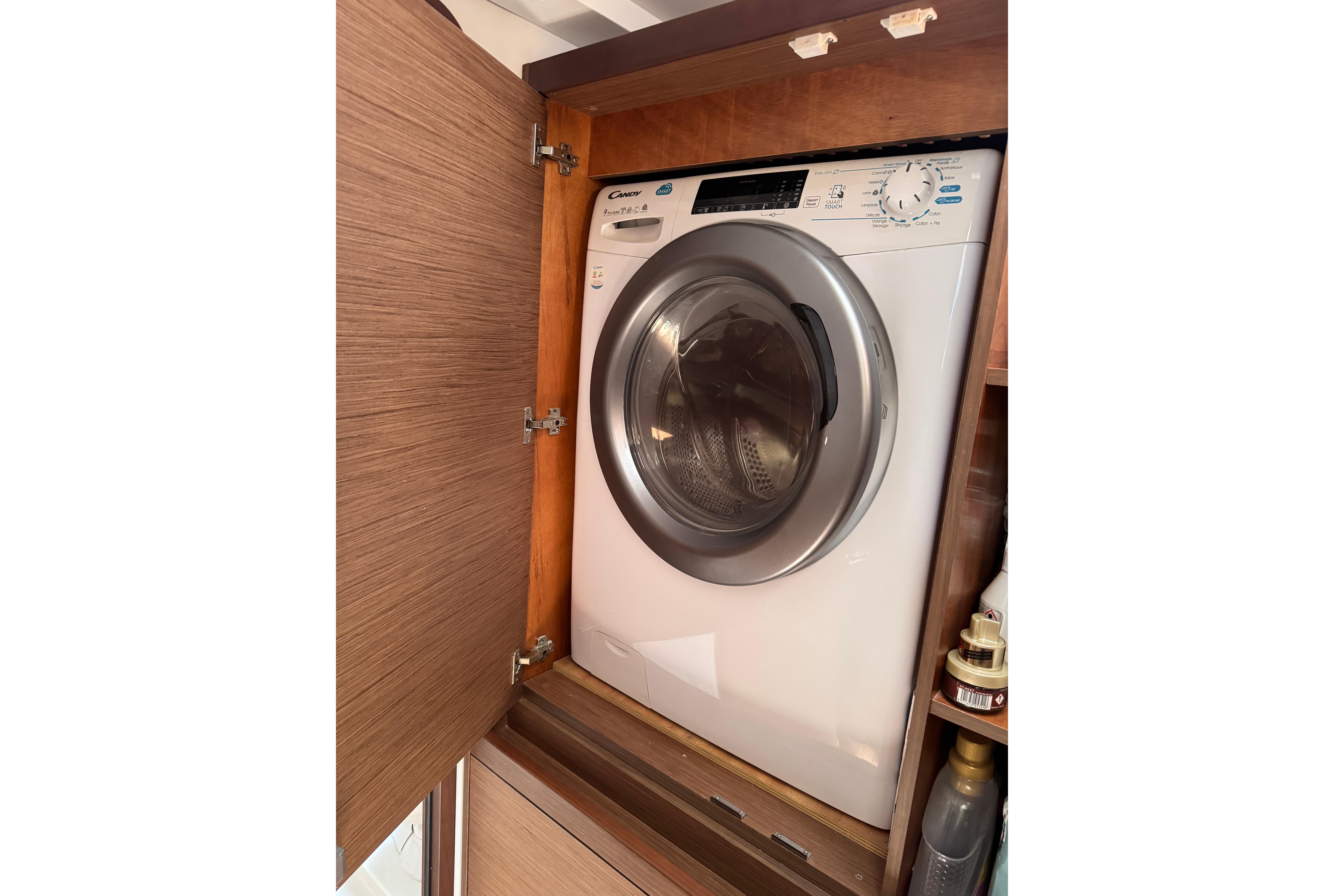 Dessalator watermaker, 100 L/h Refrigeration: 2 × fridges (galley + cockpit), 1 × freezer (galley) Gas stove (3 burners + oven) Washing machine (Candy Smart) Rigid bimini with side enclosures Full exterior cushions (anthracite) Owner’s suite with desk, wardrobes, private bathroom Fans in cabins (2024) 3 electric toilets, switchable fresh/salt water Slatted bed bases