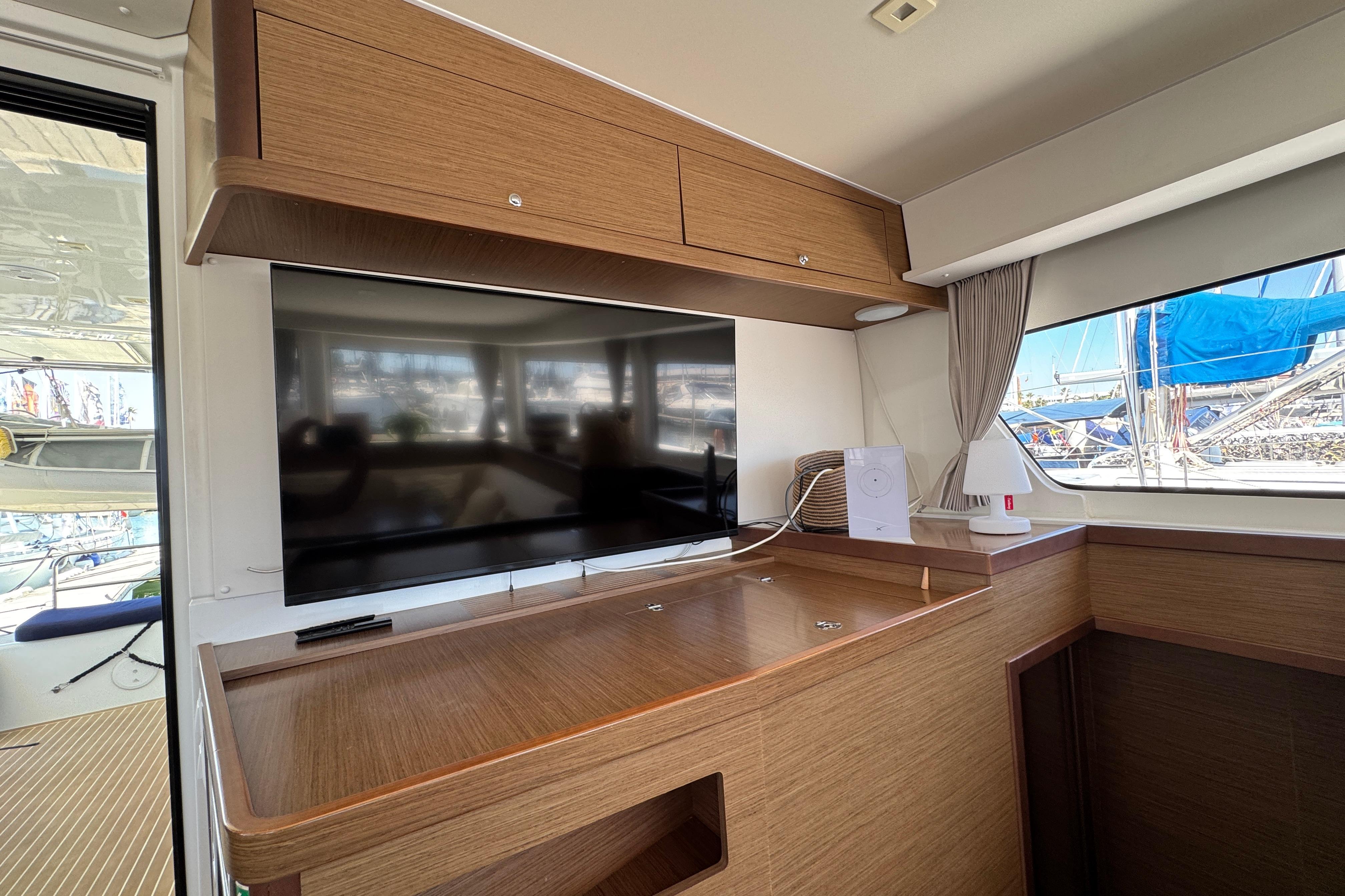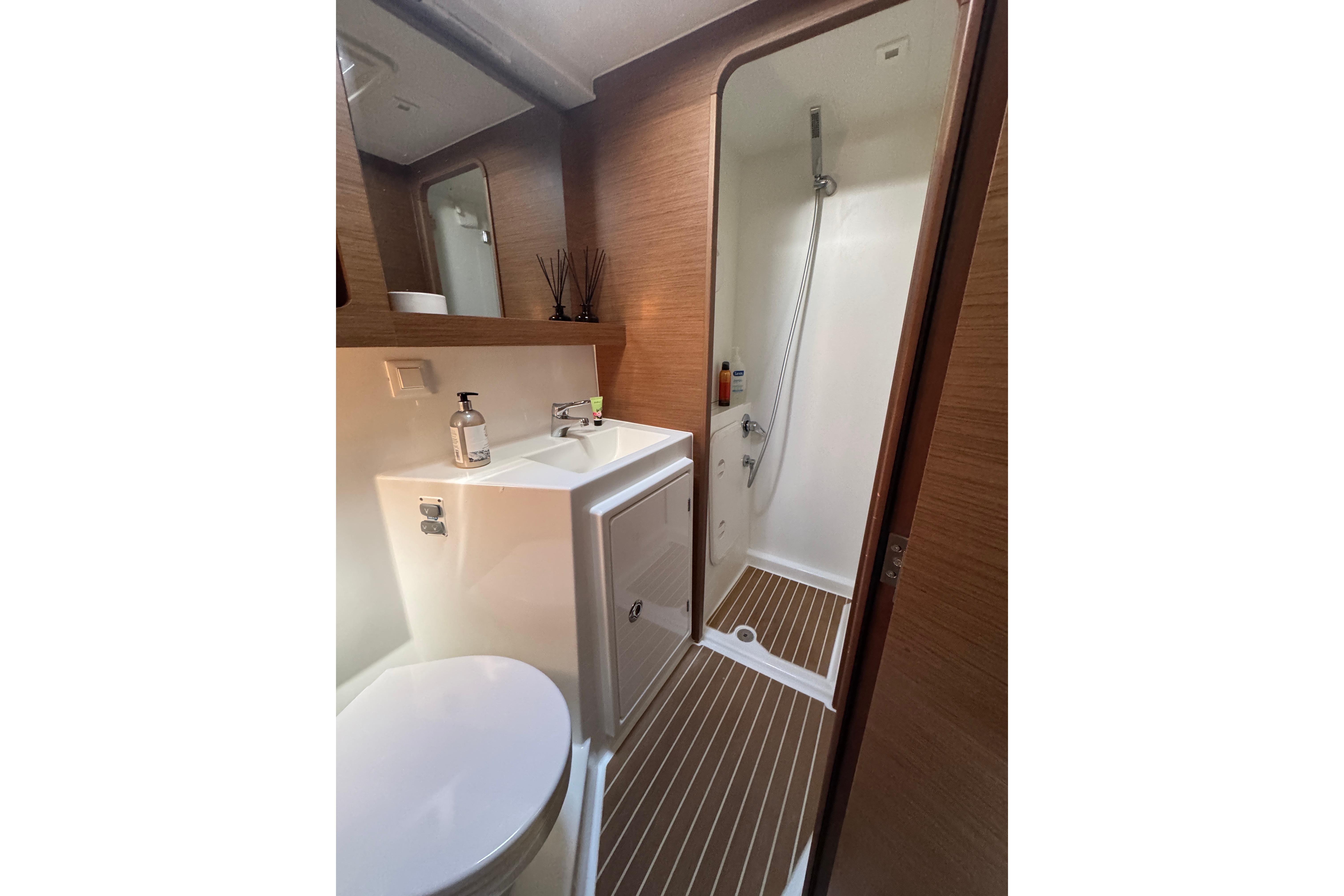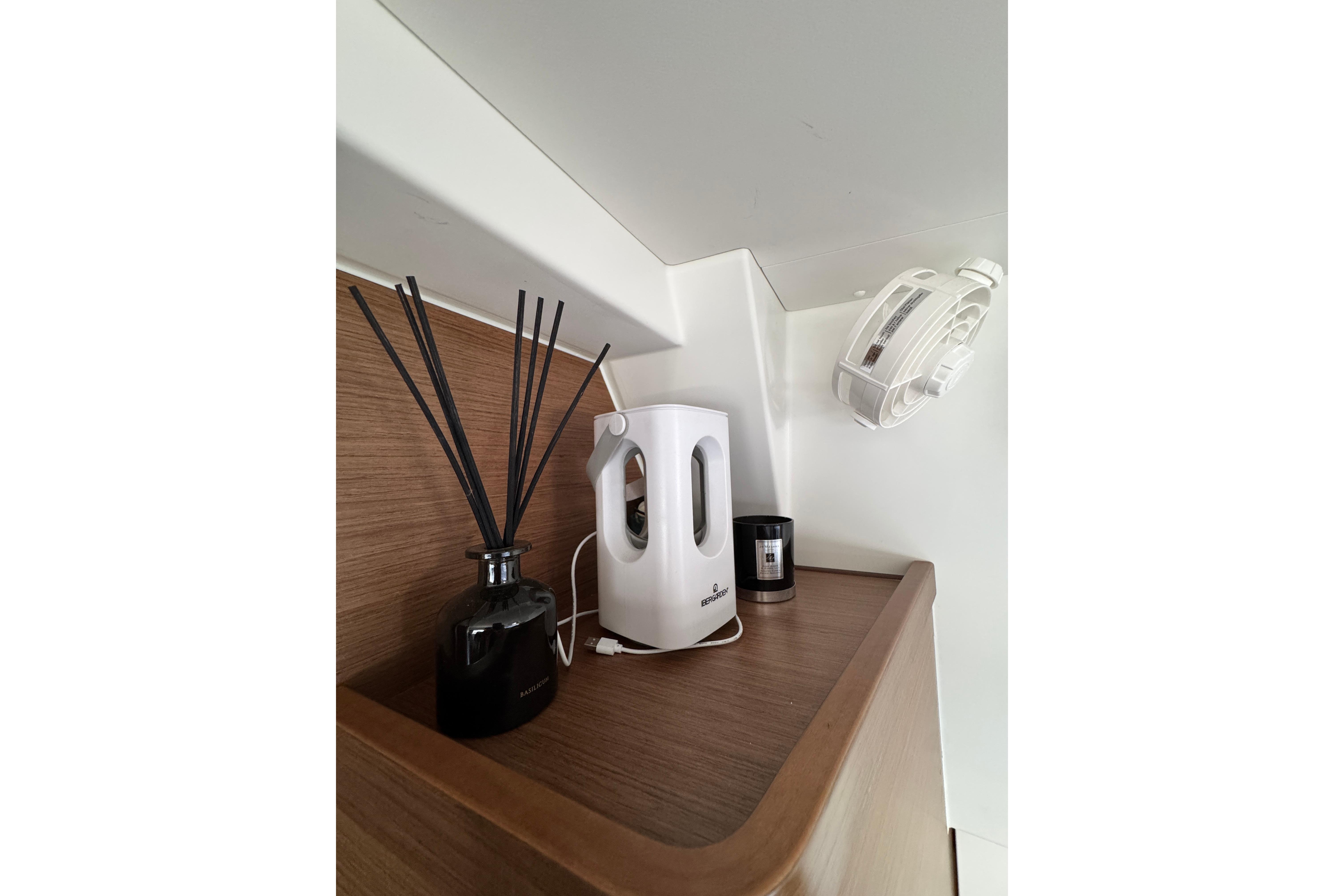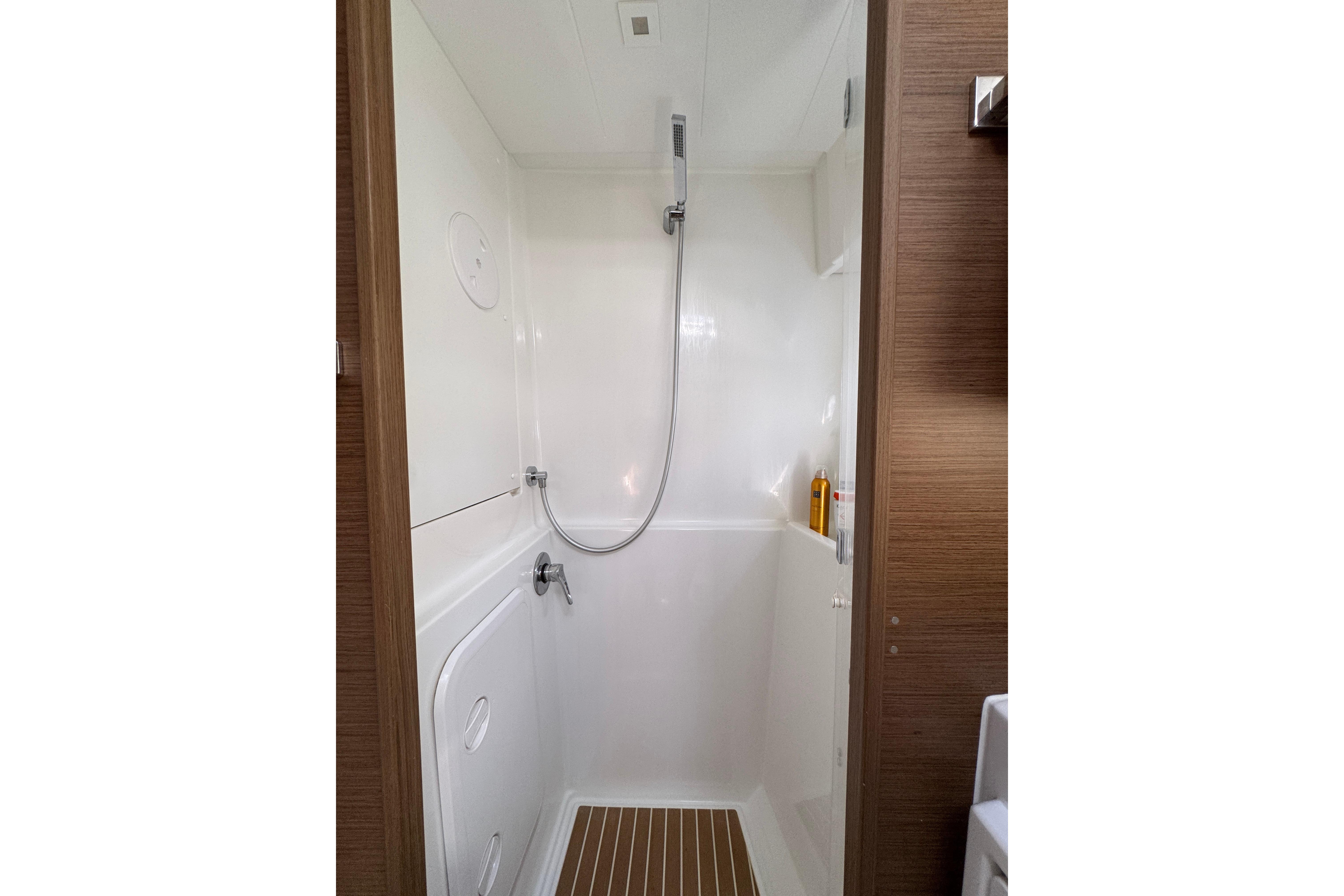 Dessalator watermaker, 100 L/h Refrigeration: 2 × fridges (galley + cockpit), 1 × freezer (galley) Gas stove (3 burners + oven) Washing machine (Candy Smart) Rigid bimini with side enclosures Full exterior cushions (anthracite) Owner’s suite with desk, wardrobes, private bathroom Fans in cabins (2024) 3 electric toilets, switchable fresh/salt water Slatted bed bases
