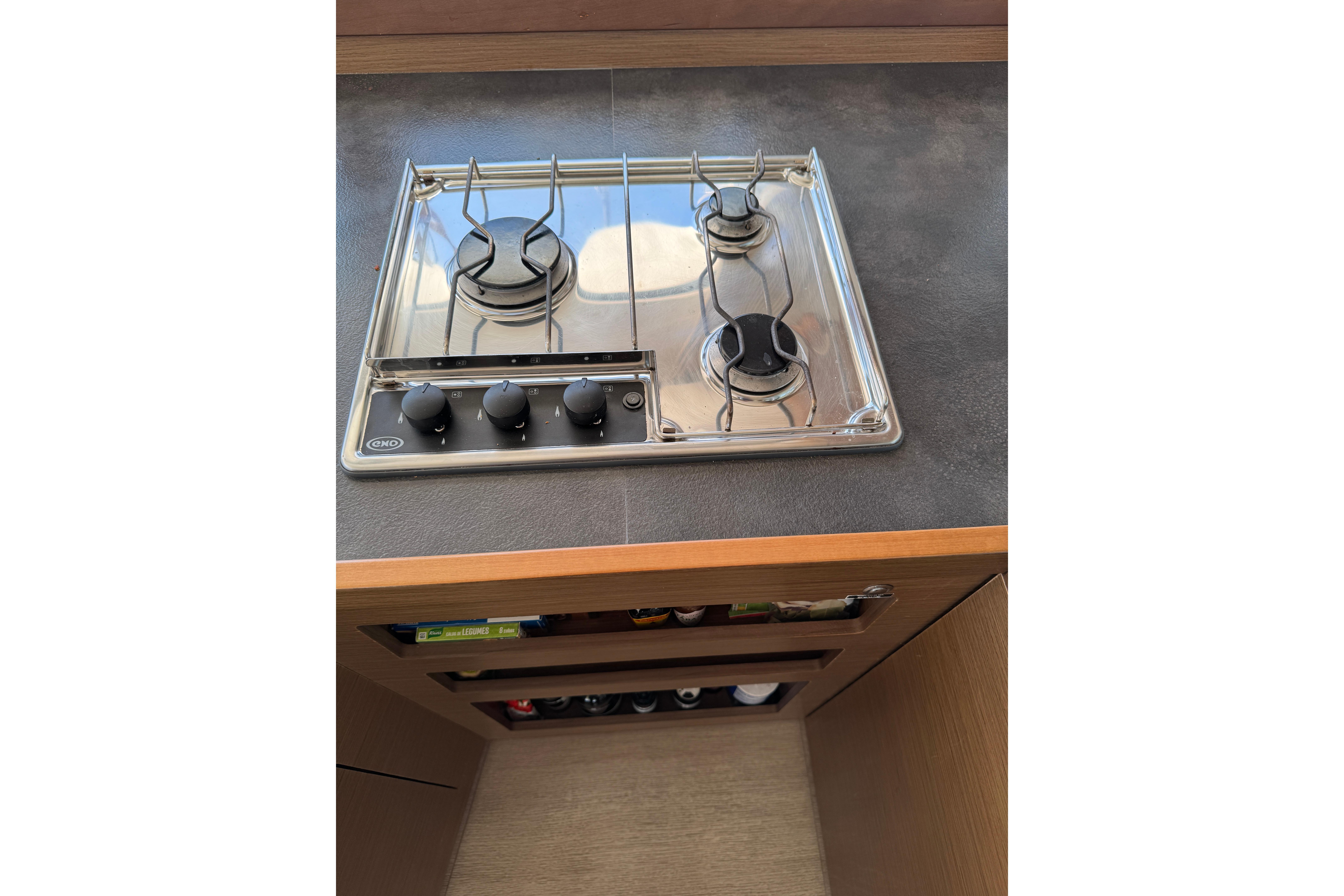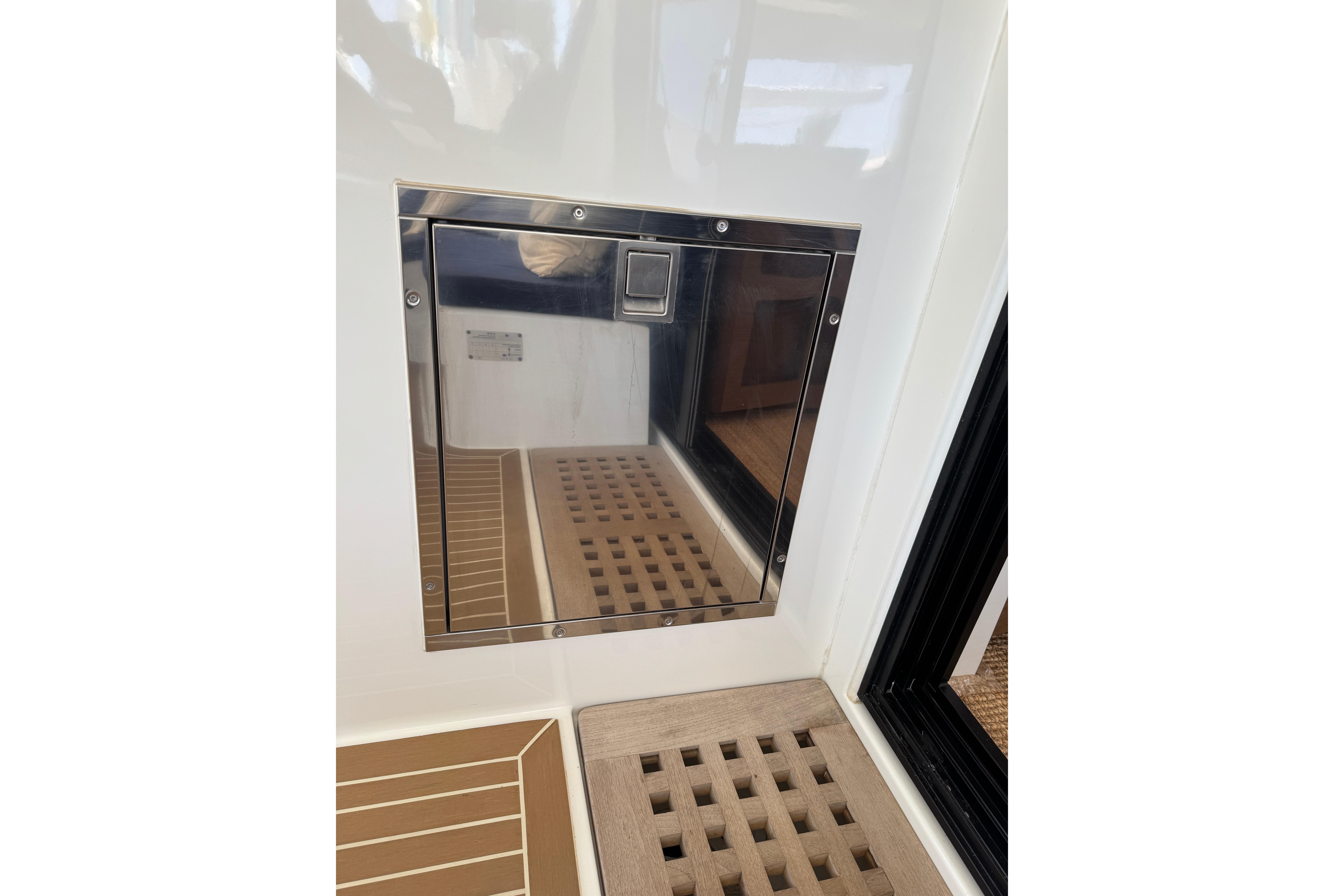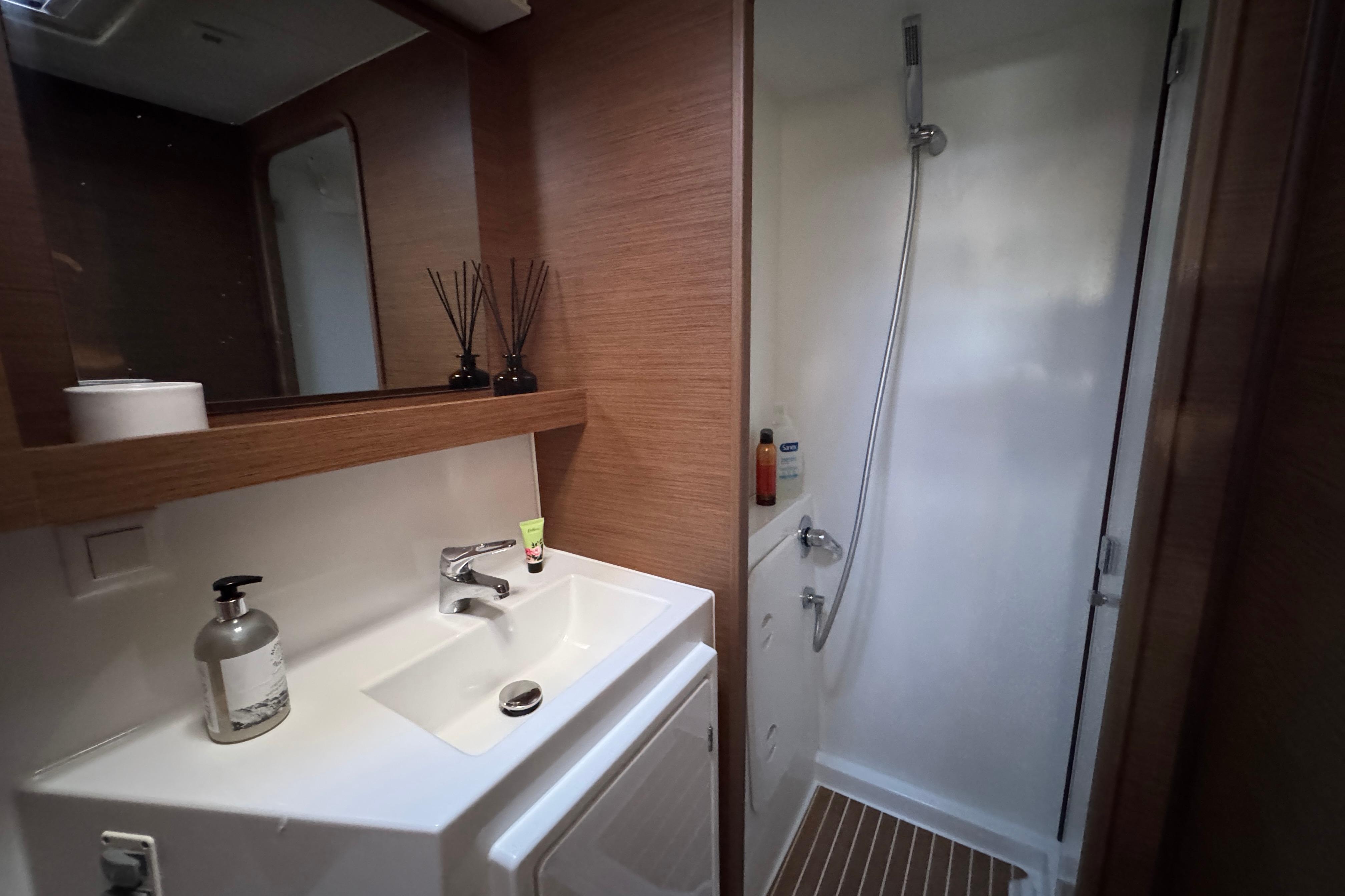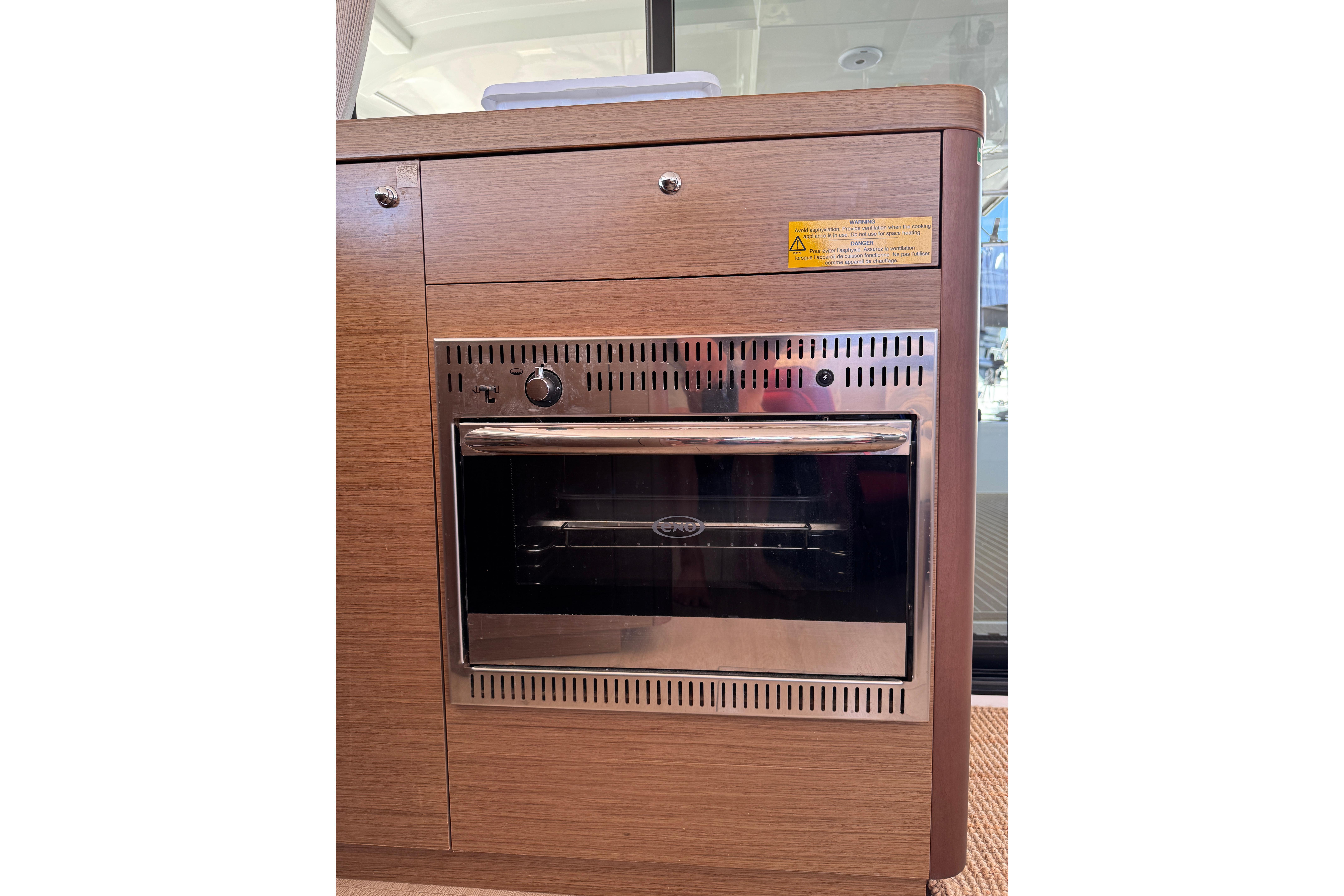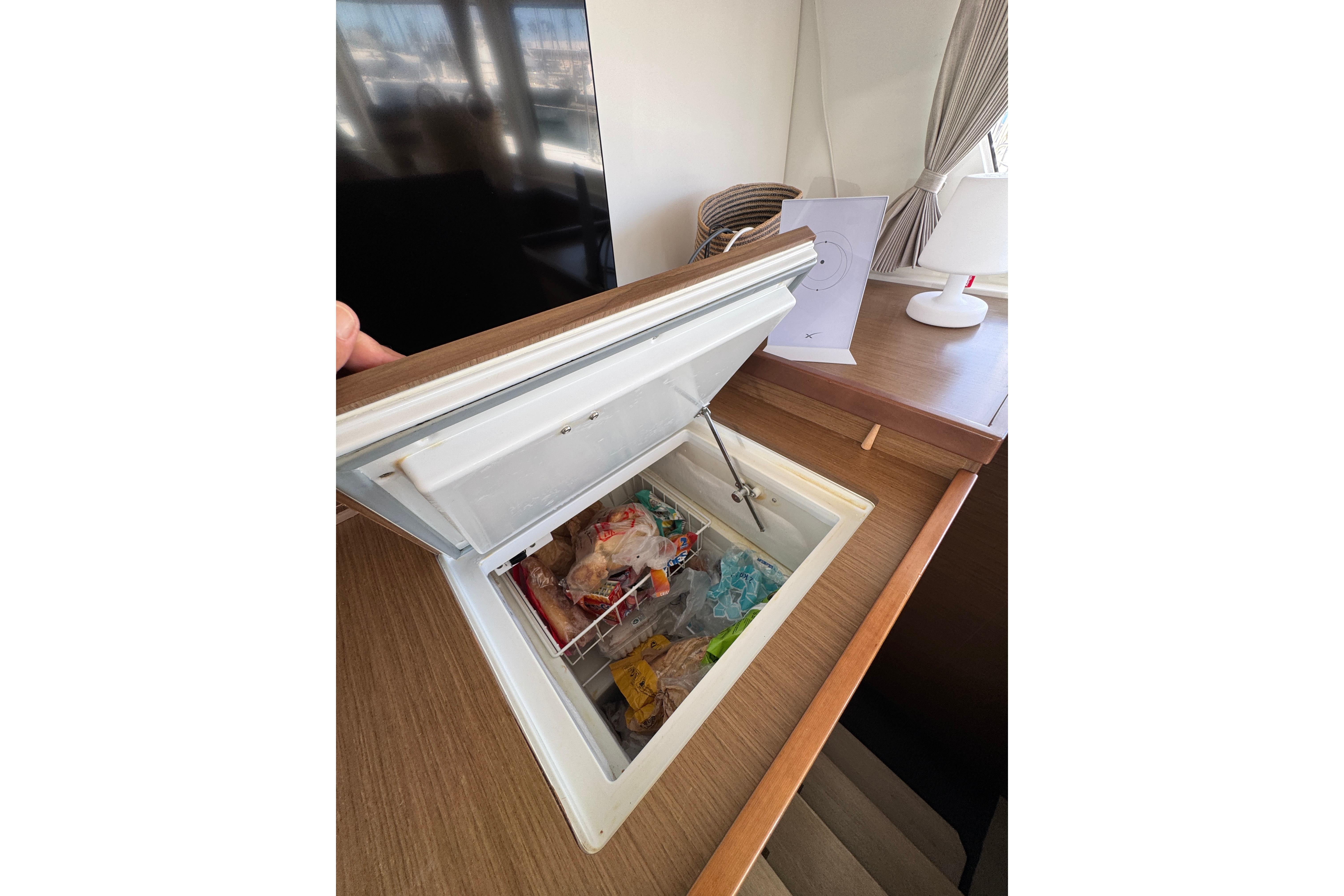 Dessalator watermaker, 100 L/h Refrigeration: 2 × fridges (galley + cockpit), 1 × freezer (galley) Gas stove (3 burners + oven) Washing machine (Candy Smart) Rigid bimini with side enclosures Full exterior cushions (anthracite) Owner’s suite with desk, wardrobes, private bathroom Fans in cabins (2024) 3 electric toilets, switchable fresh/salt water Slatted bed bases