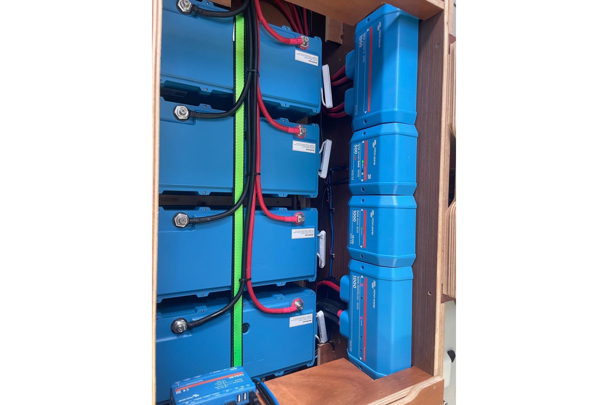 4 × Victron LiFePO 12.8V / 300 Ah lithium batteries?1,200 Ah / 15 kWh total Victron Quattro 5000 W inverter/charger Victron Cerbo GX with GX Touch 70 display Victron Lynx Smart BMS, Lynx Distributor, Lynx Power In Solar: 3 × 350 W (1050 W total) with Victron MPPT controller Alternators: 2 × 125 A (engine-driven) Shore power: 220V with differential breaker Lighting: Full LED