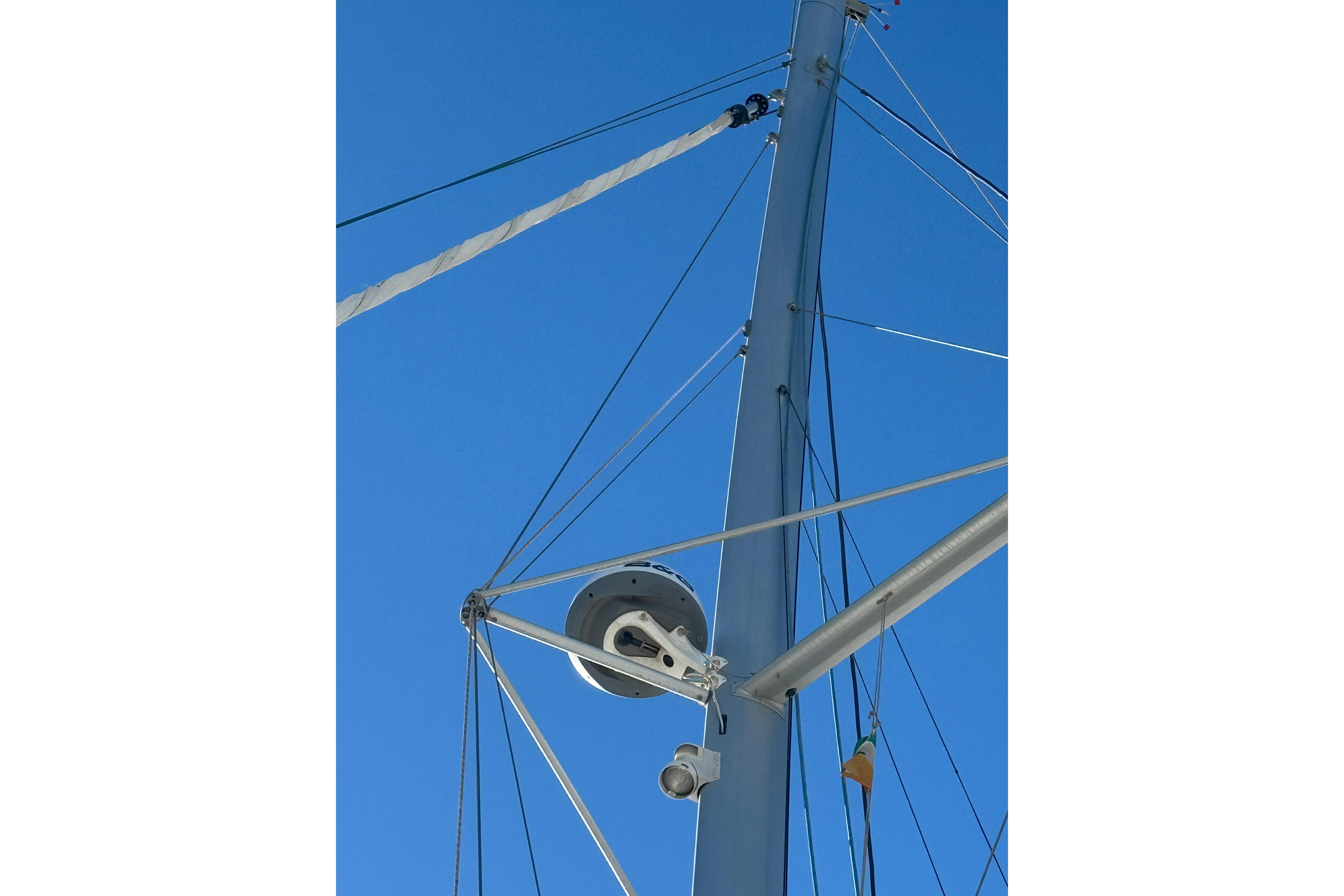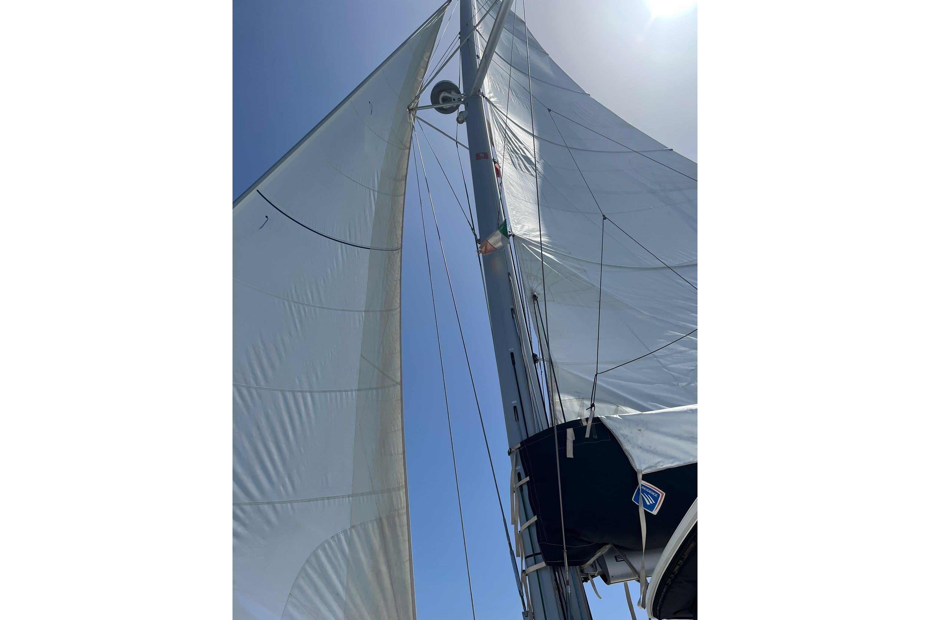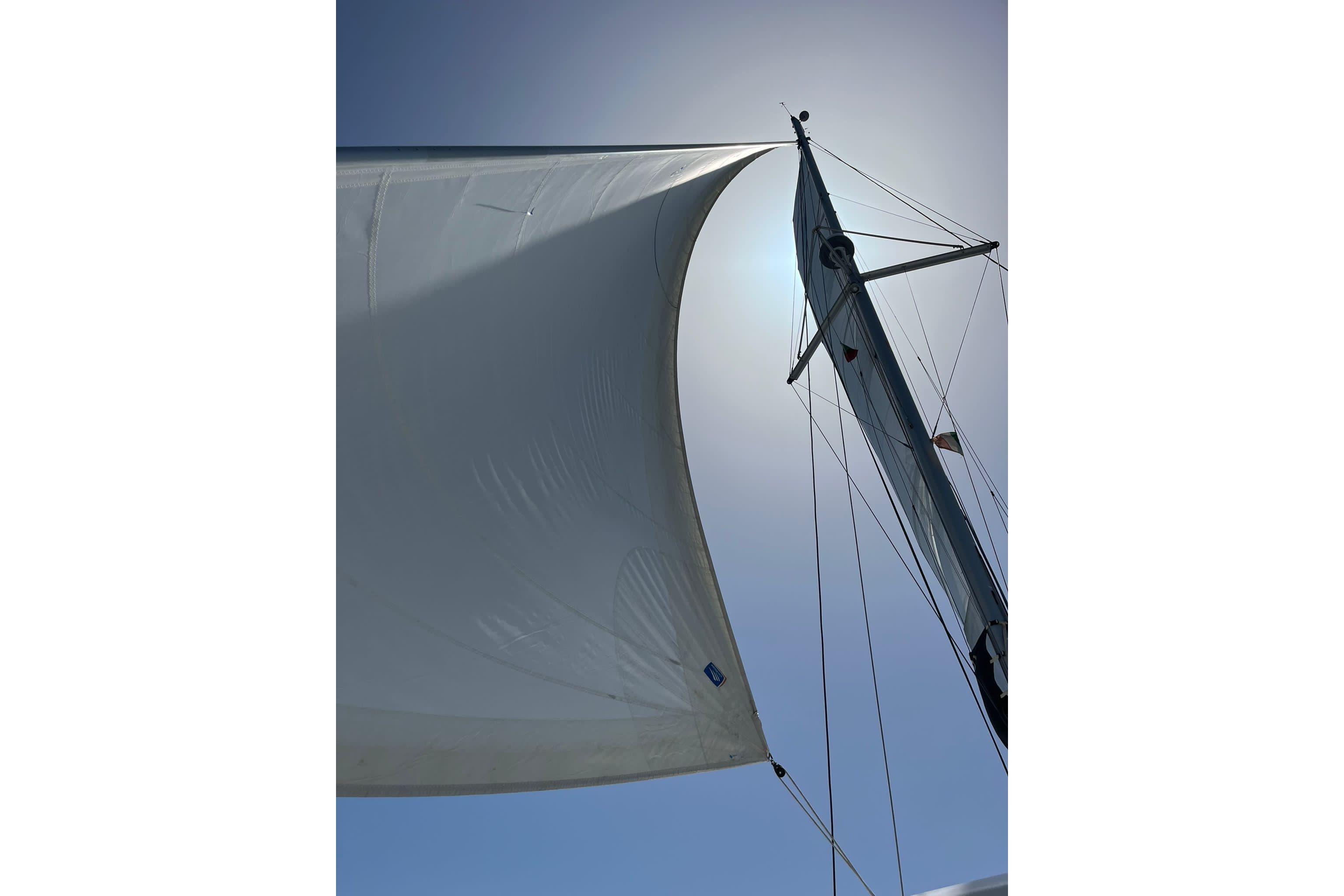 Fully battened mainsail, Incidence, square top (55 m²) Genoa on Facnor furling system (59 m²) Asymmetric gennaker 95 m² (2022) Harken / Lewmar winches (incl. electric main halyard winch)