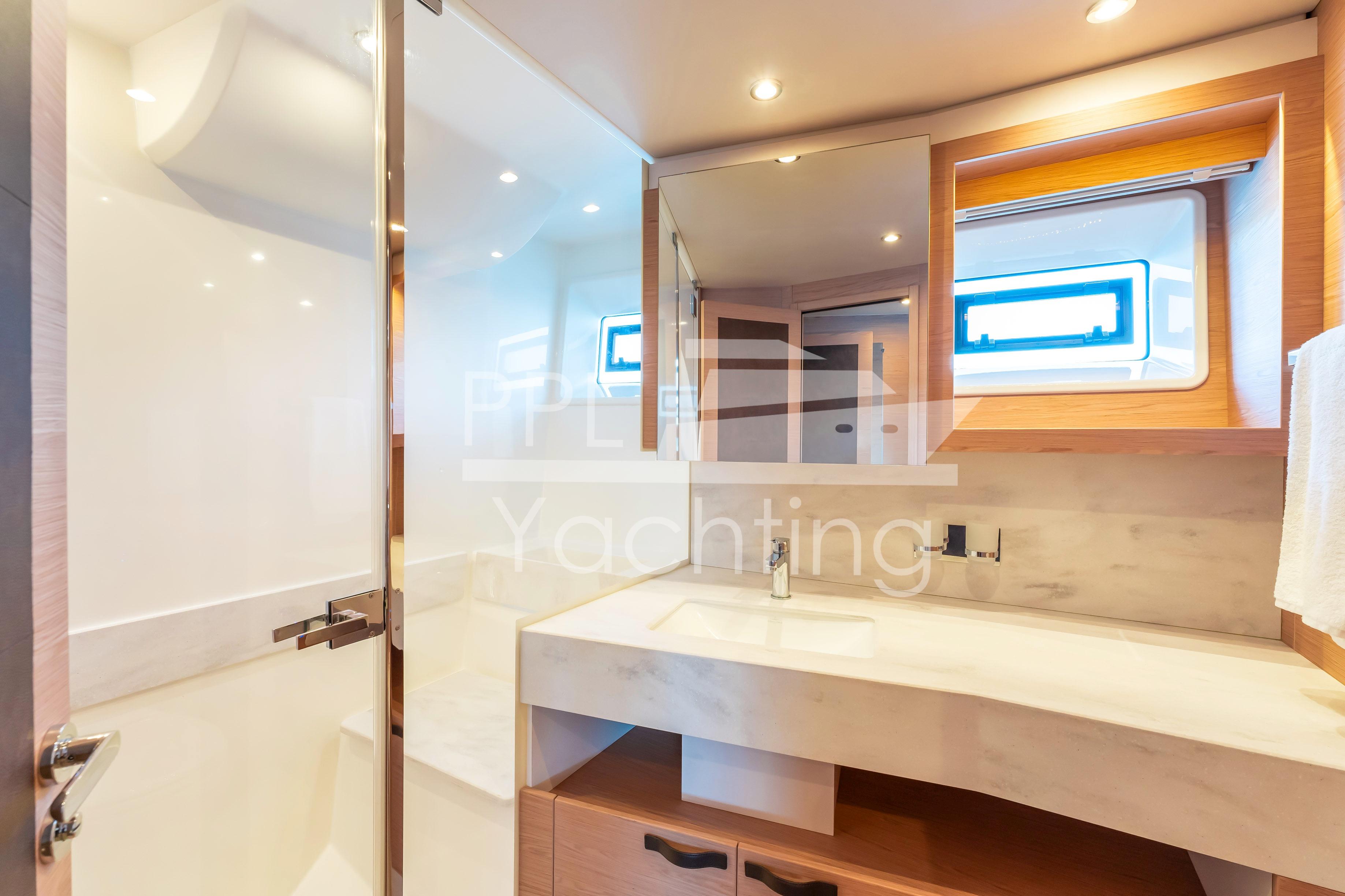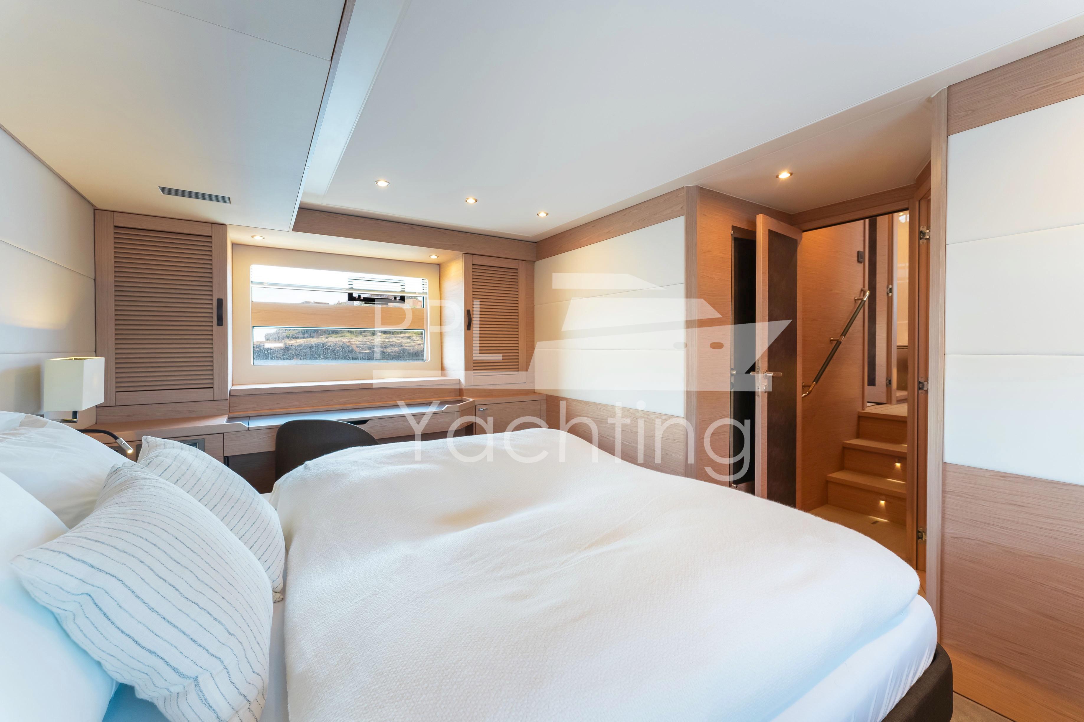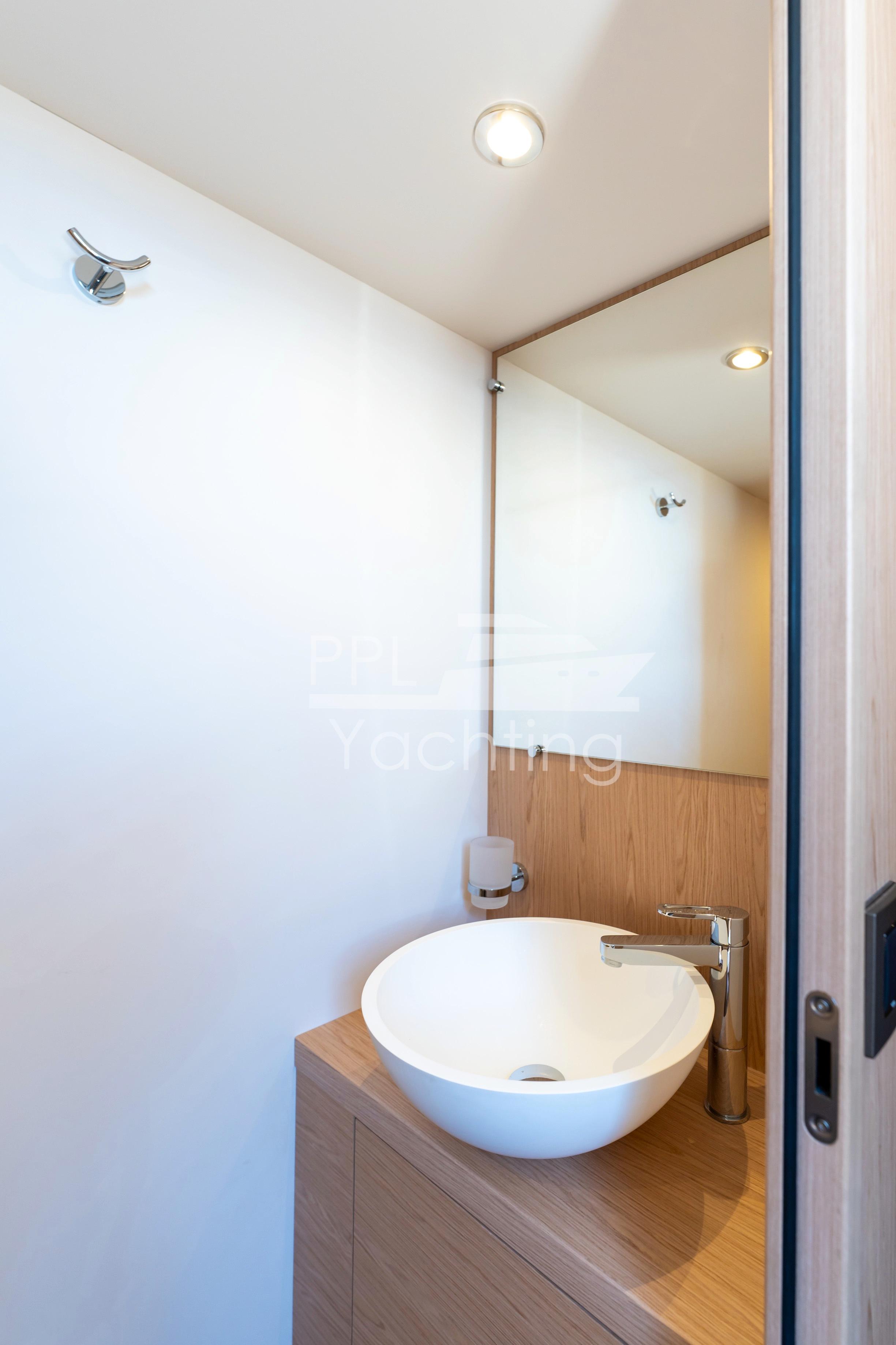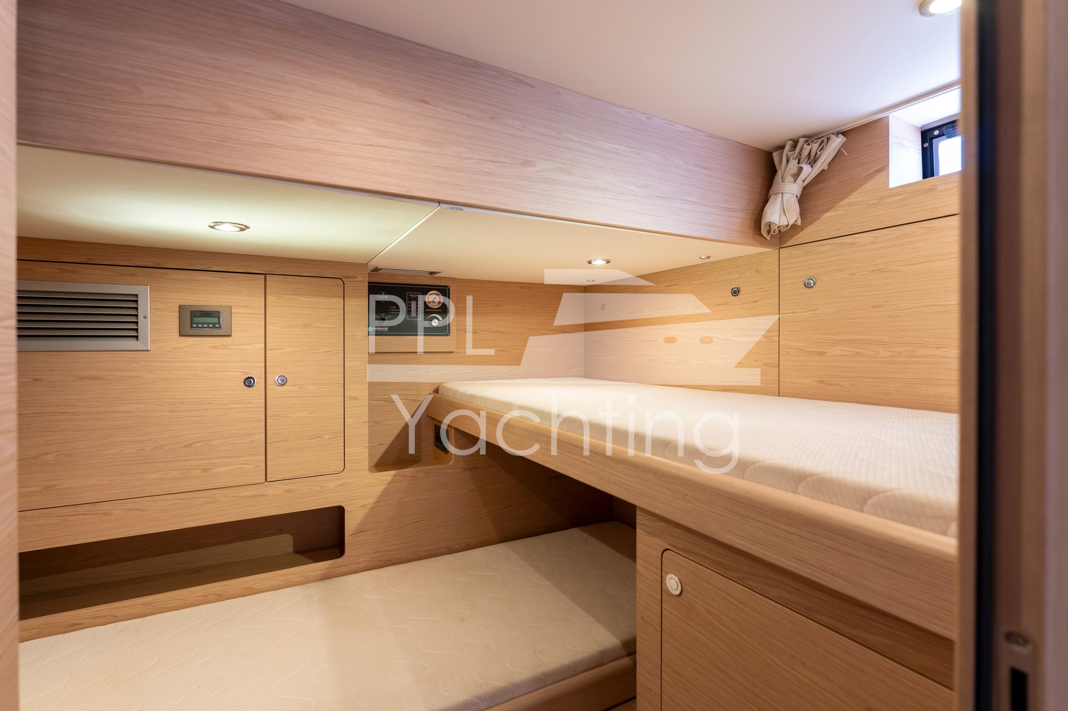Below deck 2 cabins (master and VIP) with a large double bed and each with an en-suite bathroom as well as a third cabin with two single beds and access to a third, en-suite bathroom. The crew (up to two people) is accommodated in the stern area. From there she has access to her own bathroom and also directly to the engine compartment.