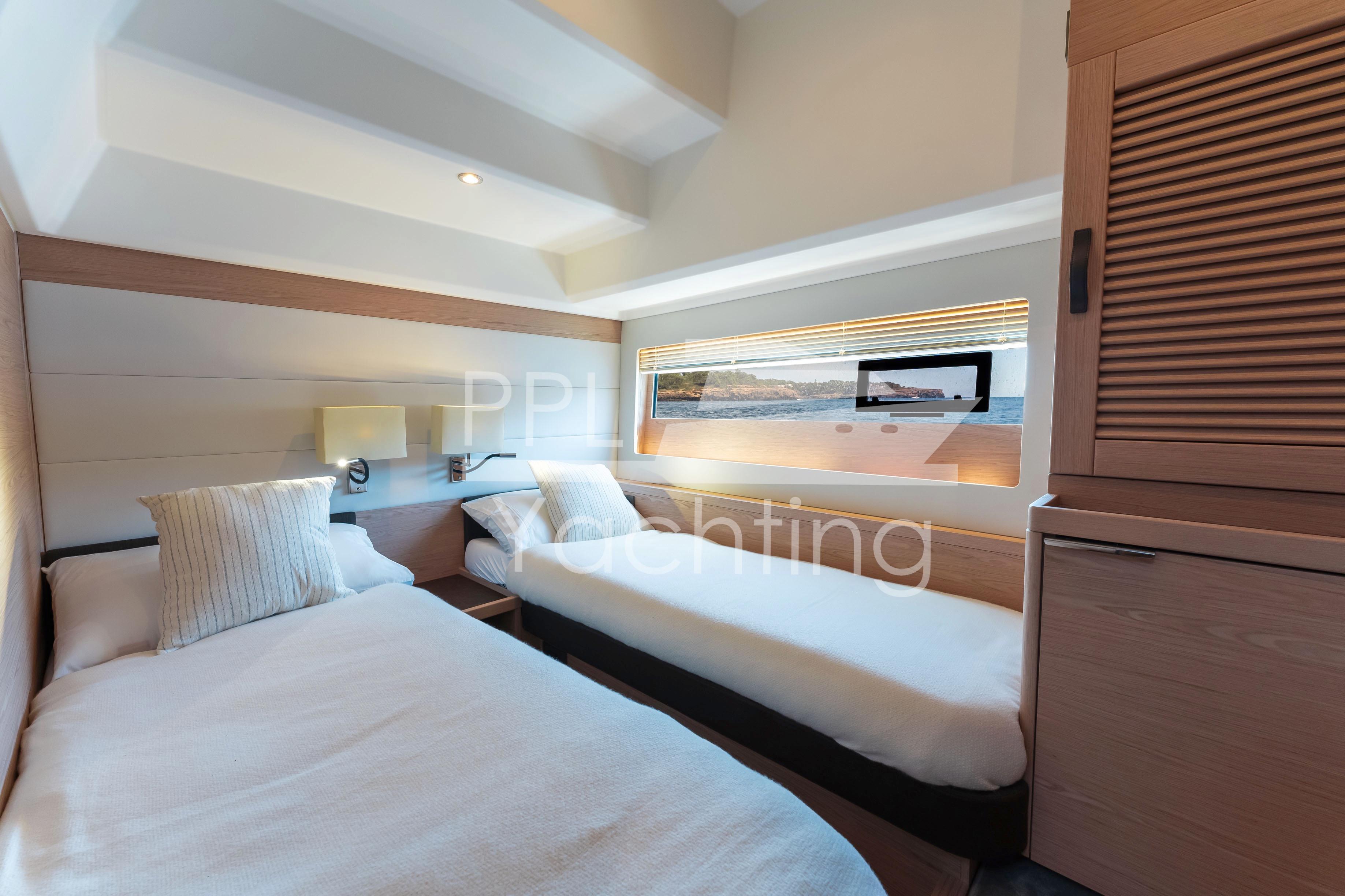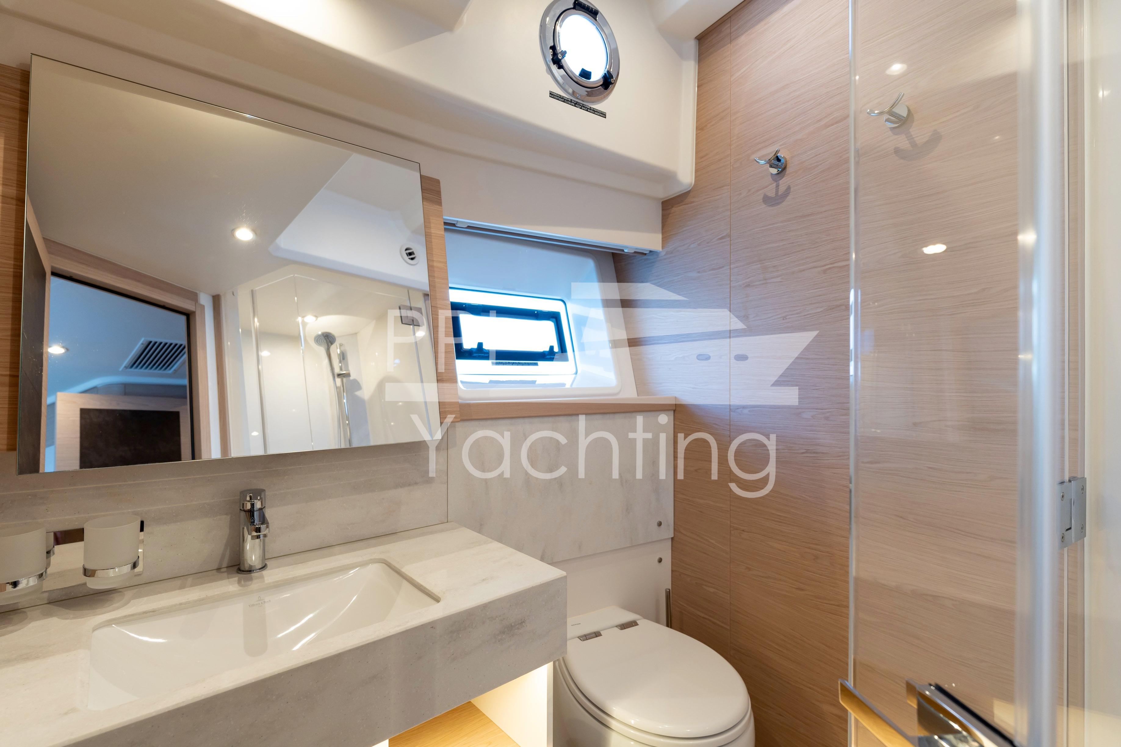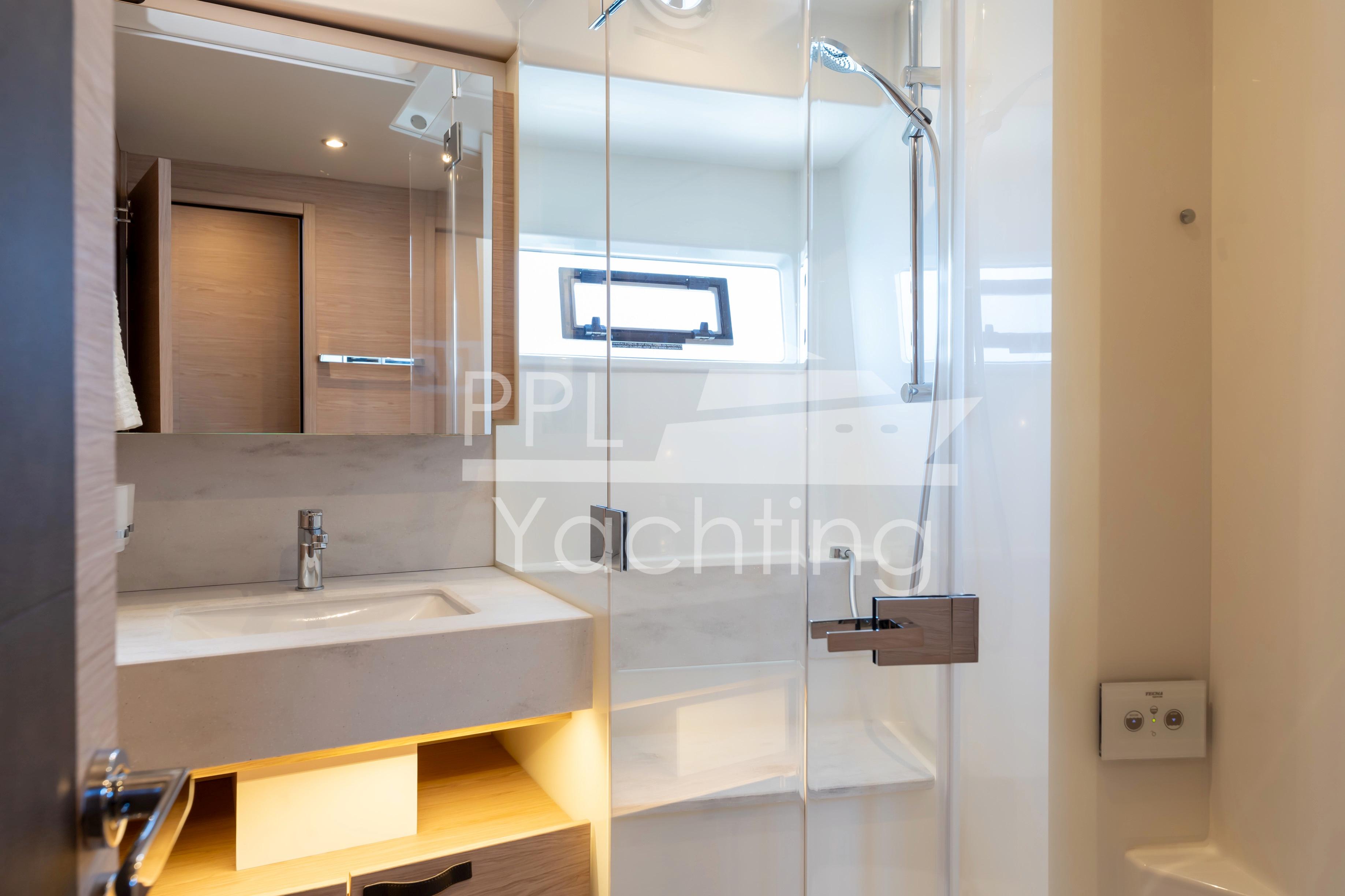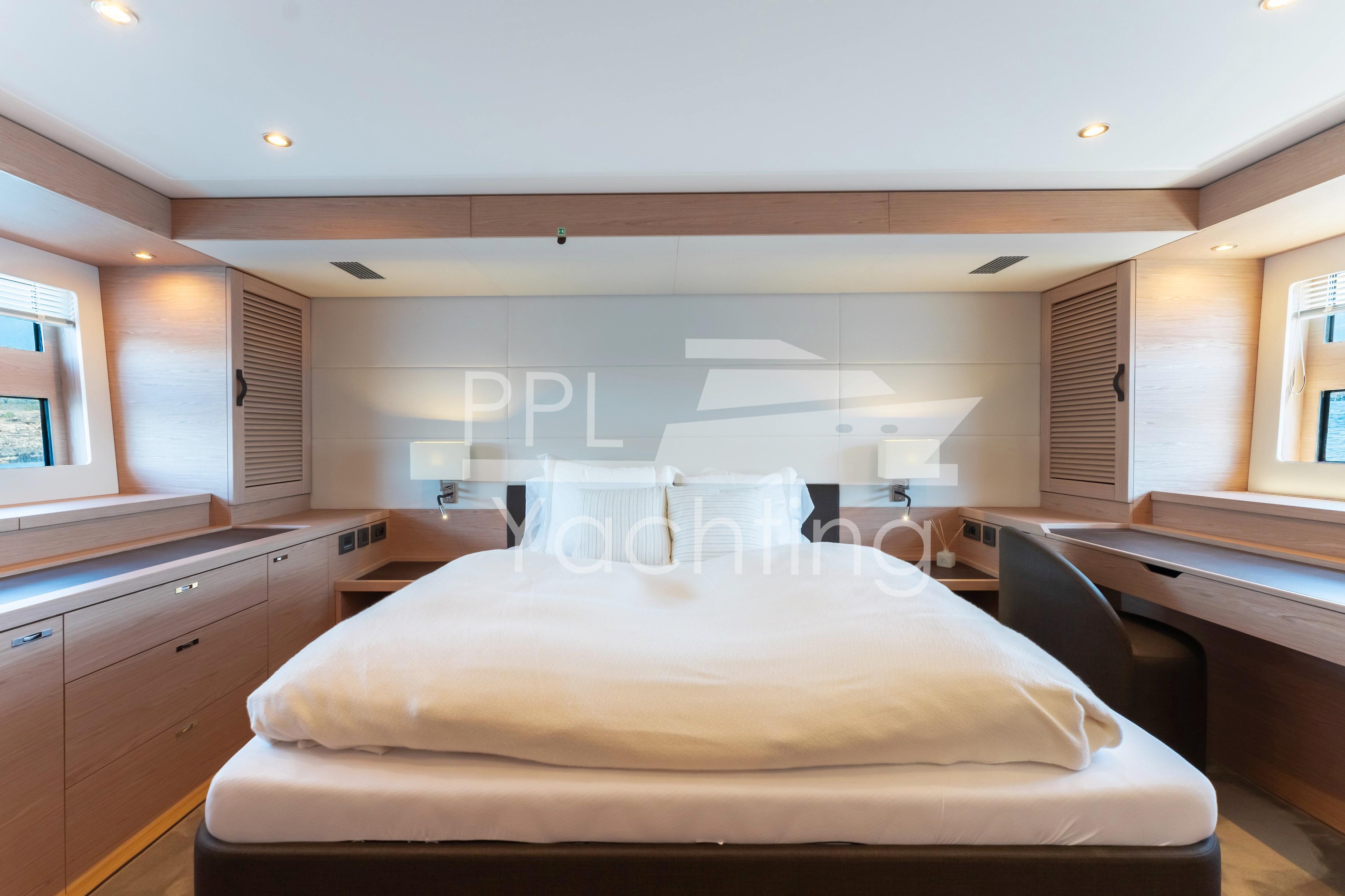 Below deck 2 cabins (master and VIP) with a large double bed and each with an en-suite bathroom as well as a third cabin with two single beds and access to a third, en-suite bathroom. The crew (up to two people) is accommodated in the stern area. From there she has access to her own bathroom and also directly to the engine compartment.
