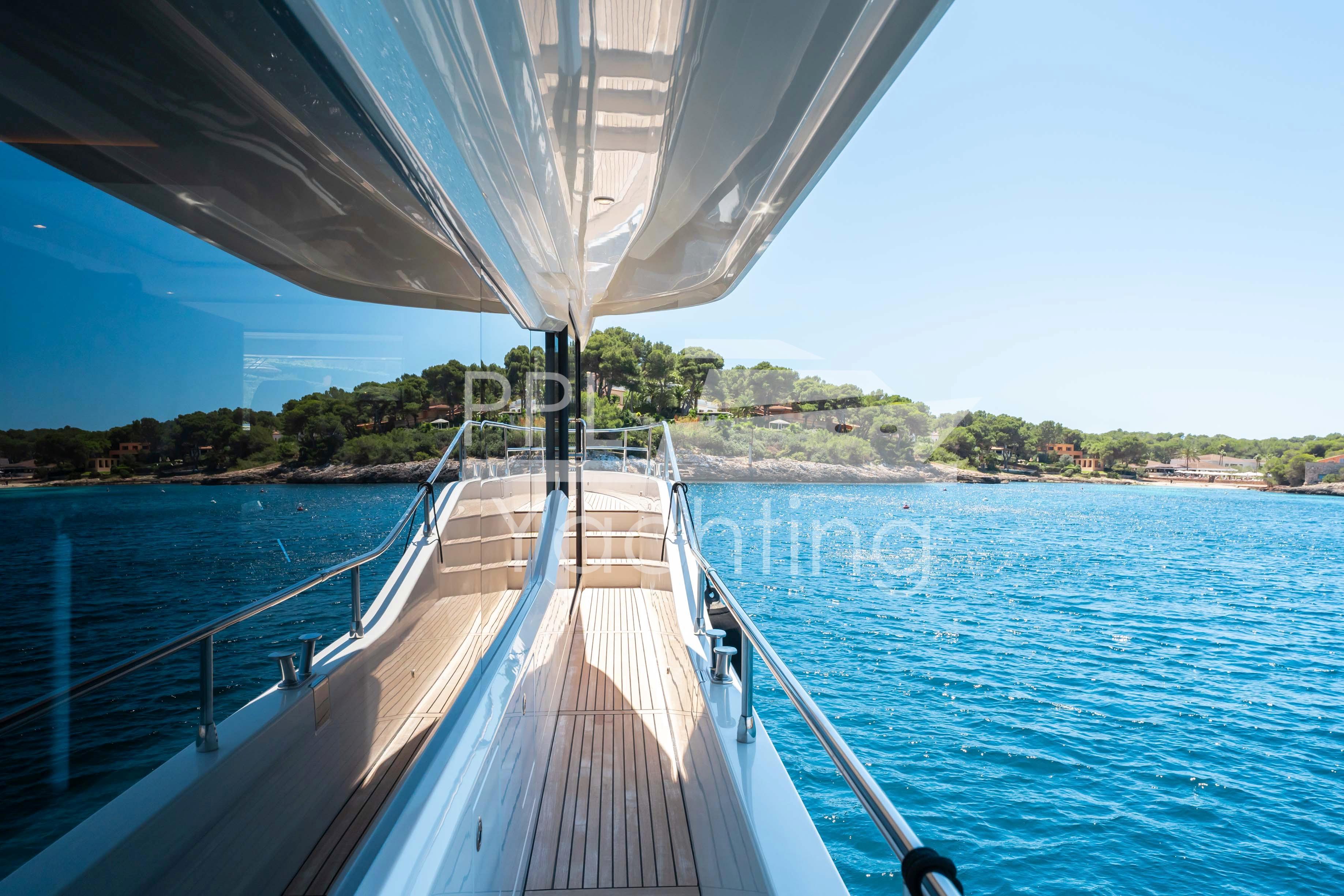 This yacht was completely laid with teak, the spacious cockpit area has, in addition to the seating area with teak table and the (air-conditioned) crew cabin at the stern, which for this GT62 was also designed as storage space for diving bottles, an electro-hydraulic bathing platform (400kg - load capacity) and a teak-laid gangway. On a total of 3 decks this 62 offers
