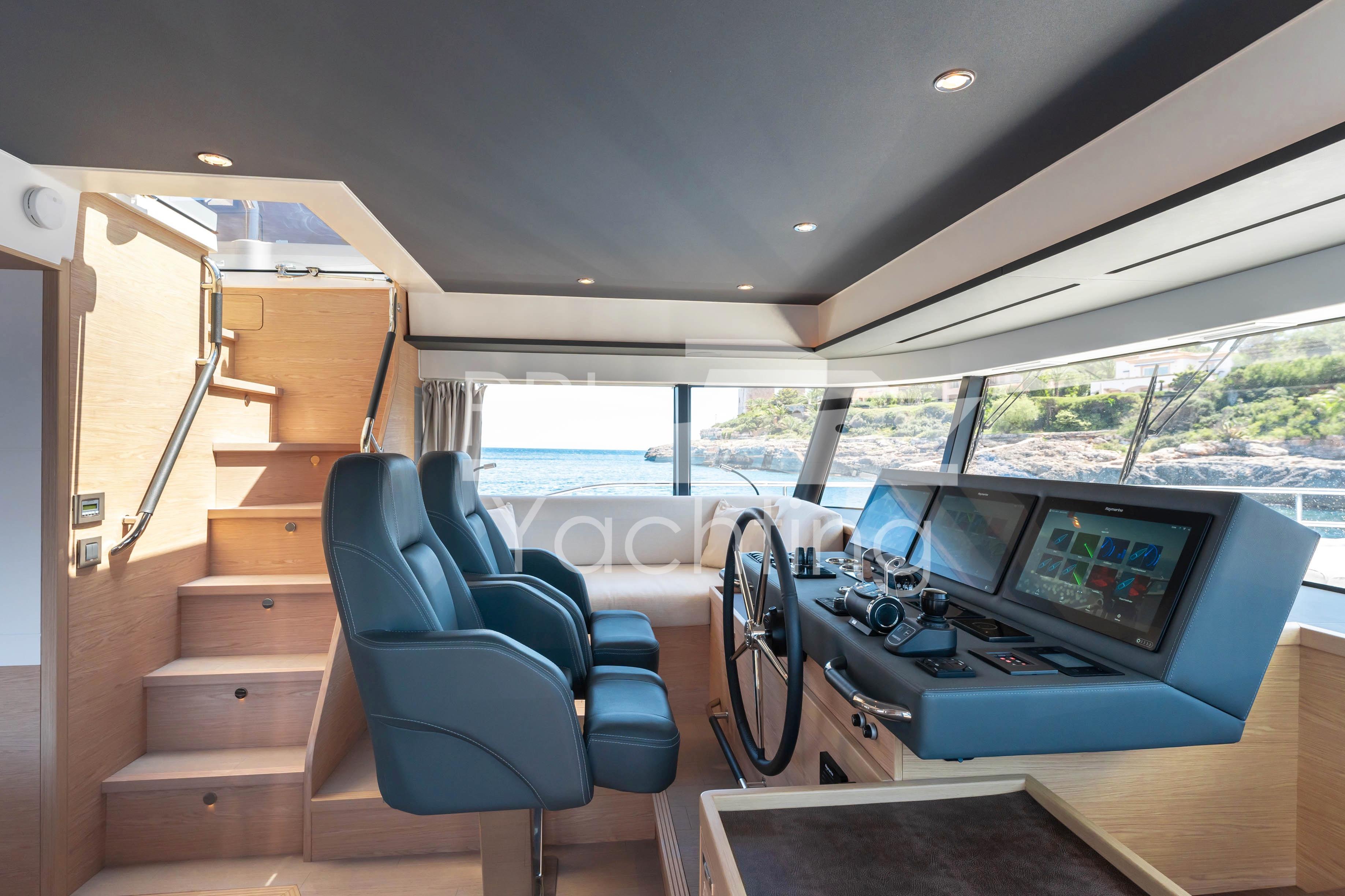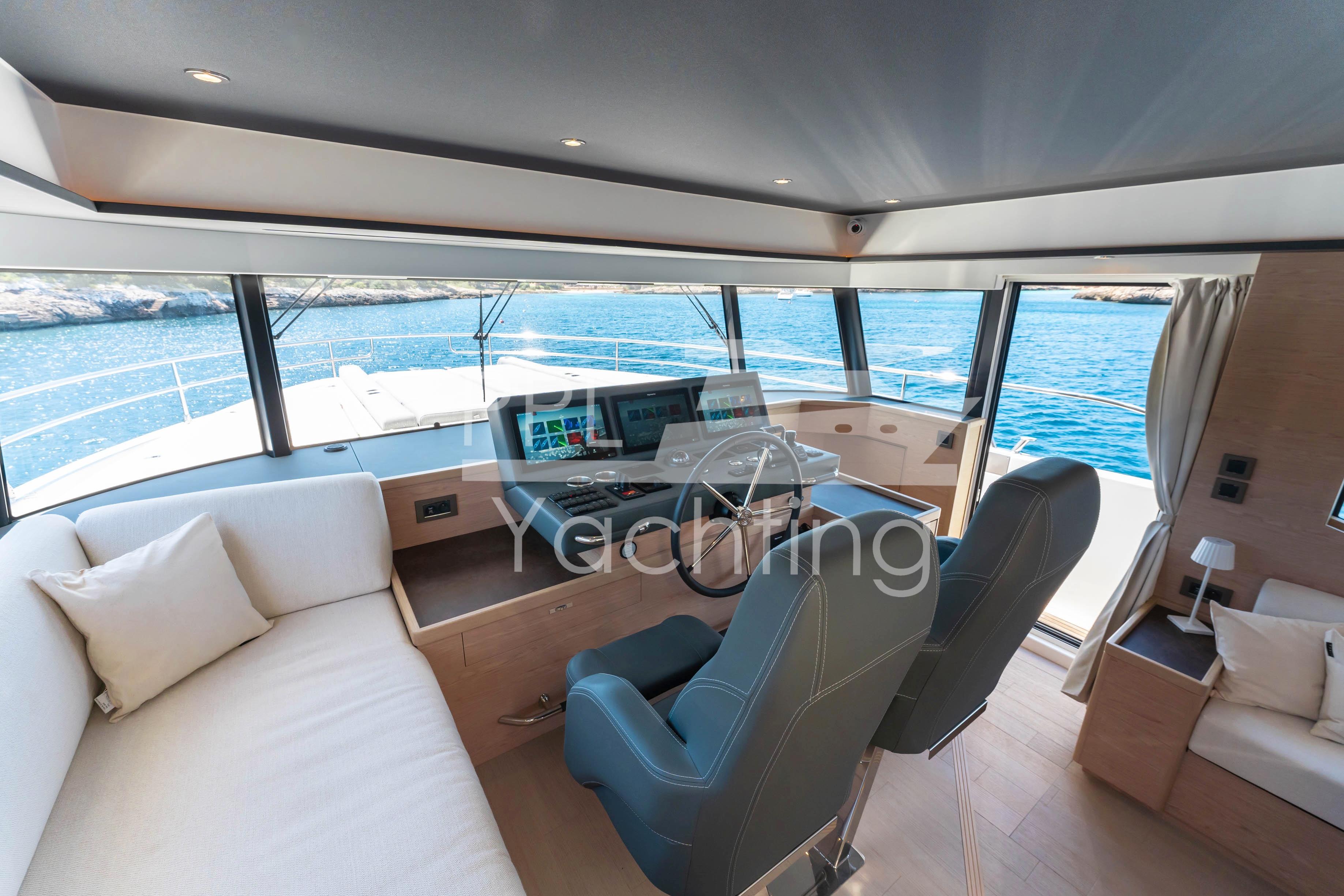 Gyro stabilization system (SeaKeeper NG18) available – Increased comfort not only due to the long list of extra equipment, such as the tropical air conditioning in all cabins, including the fully equipped crew cabin at the stern, the fresh water maker, the air compressor, the reversing- and engine room cameras, the 3rd maneuvering station at the stern or the 400kg crane on the flybridge, but also due to the installed MAN maneuvering joystick, which enables one to always keep the flagship of the Beneteau / Monte Carlo shipyard in control - even in difficult weather conditions.