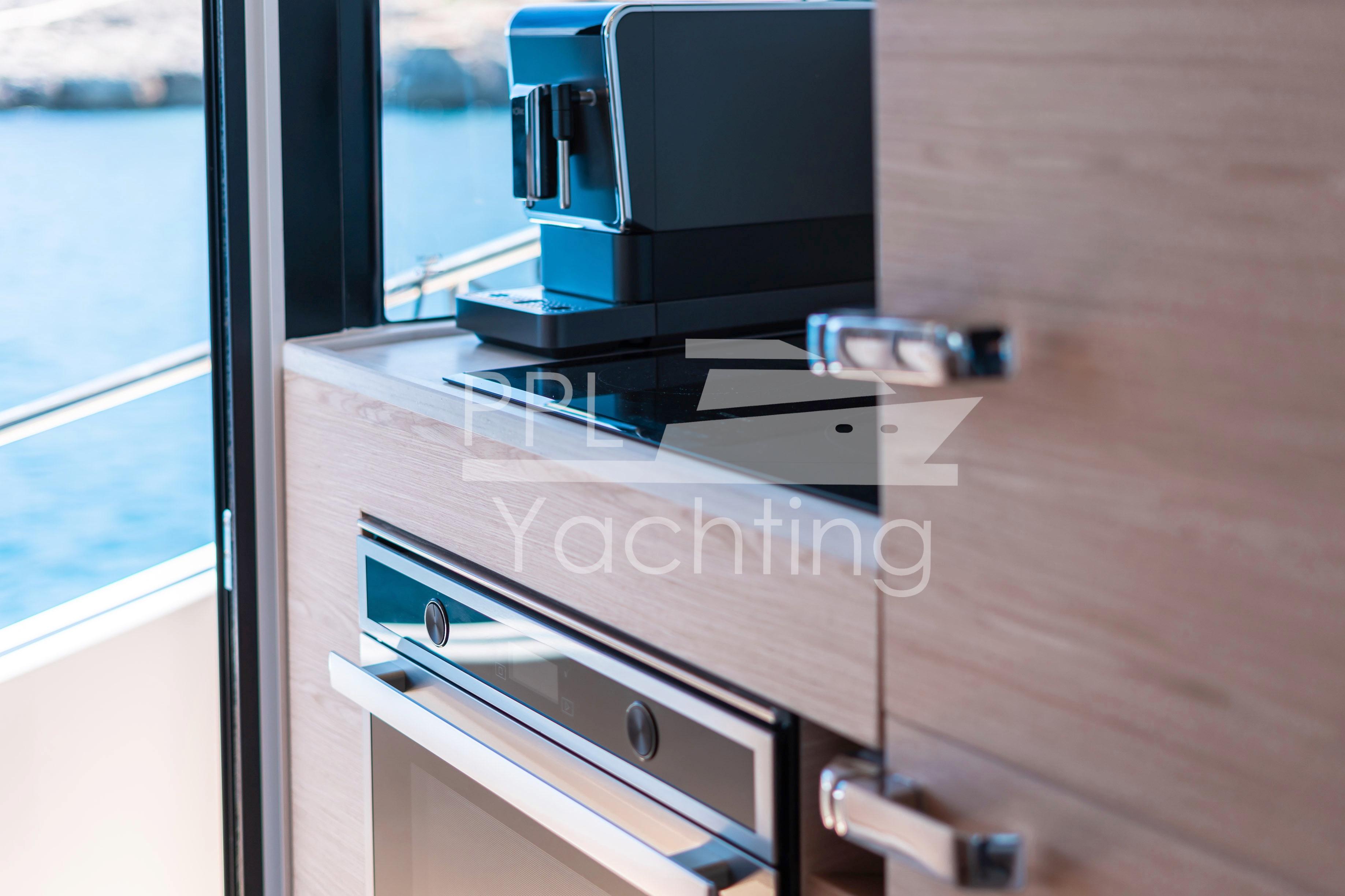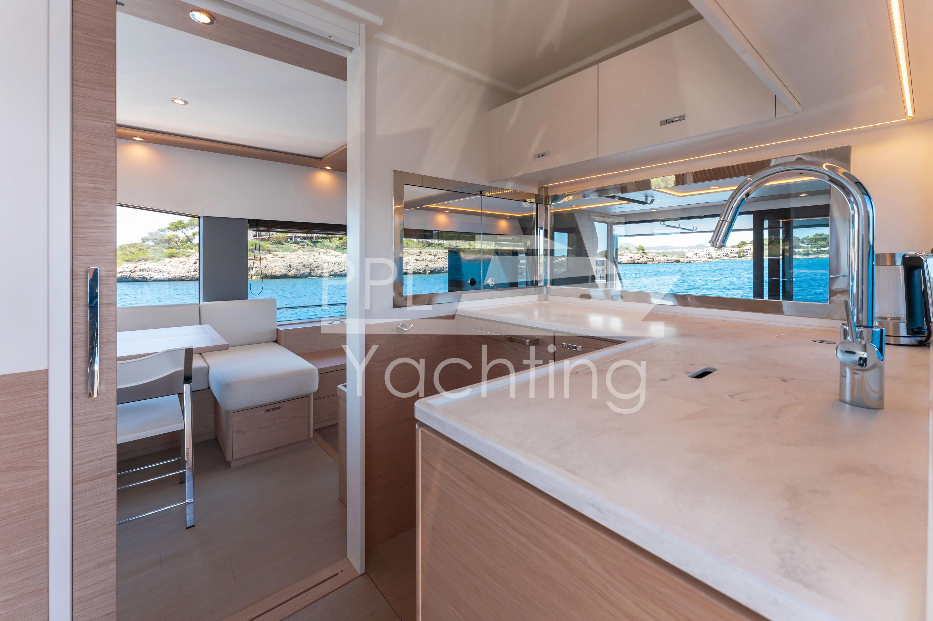 On deck level towards the entrance area there is a bright and spacious saloon with electrically operated TV furniture (Smart TV) and an additional wine cooler for easy access to drinks, as well as a separate seating area opposite the fully equipped kitchen, that is separated from the living area and dinette. From both, the kitchen and centrally located helm station, you can easily reach the deck/foredeck via a sliding door equipped with fly screen, where you will find the generously designed bow sun pad with bench in front and - if required - the easy-to-assemble canvas/bimini to enjoy the beautiful summer evenings.