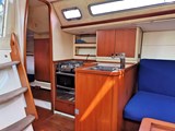 Saloon: Teak folding leaf table, 4 berths with folding backrests converting to bunks.