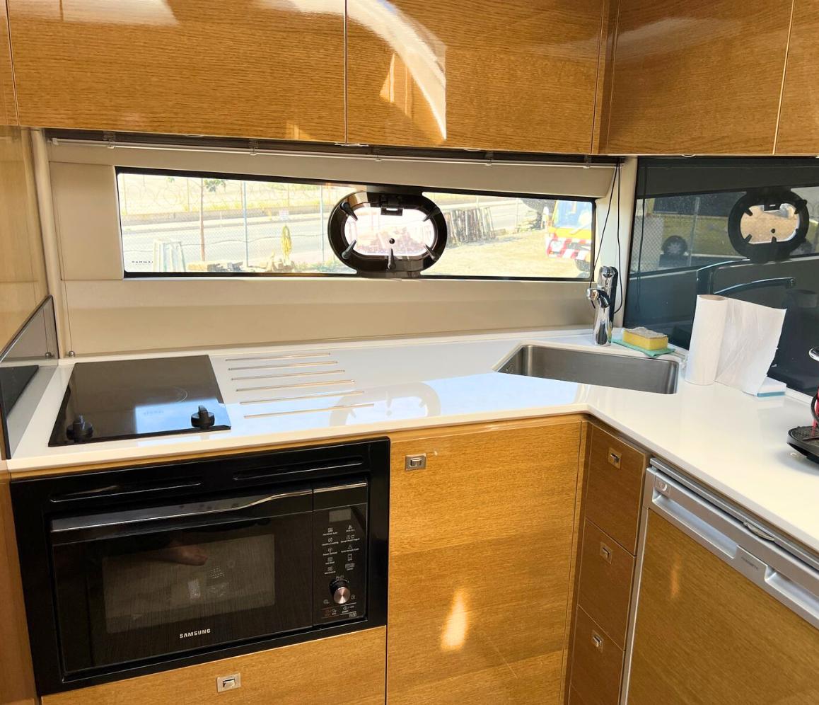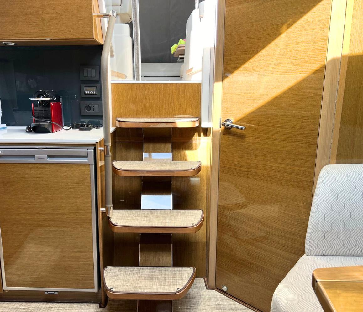 The saloon is bright and welcoming, thanks to large windows and the open layout. The well-equipped galley is compact yet functional, and the main seating area transitions seamlessly into the cockpit. With the electric sliding roof, the cockpit transforms between open-air relaxation and a sheltered, optionally air-conditioned space.