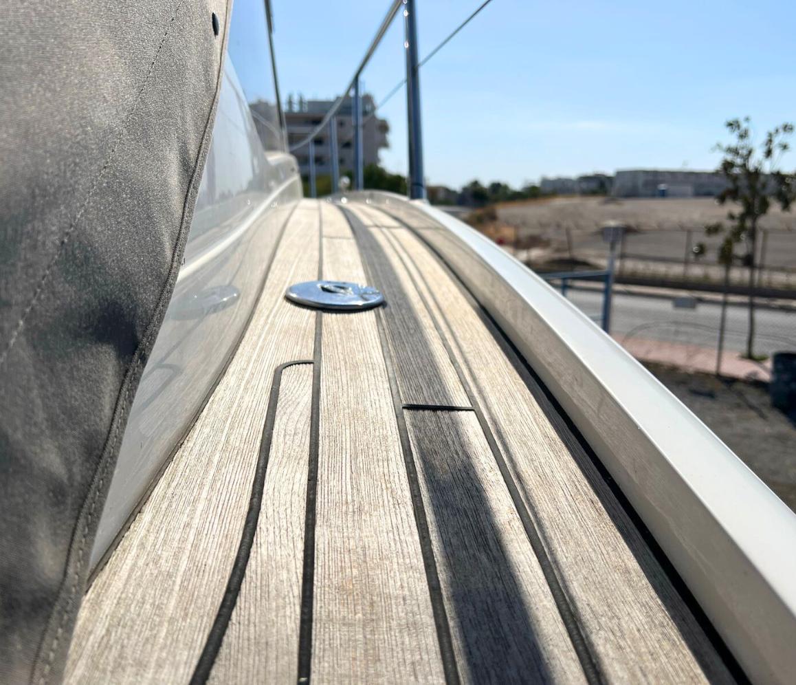 The interior welcomes up to four guests in two cabins, with a bright, modern saloon and a well-appointed galley. Outdoors, the full teak deck, hydraulic swim platform, and wetbar with BBQ invite you to relax and entertain with ease.