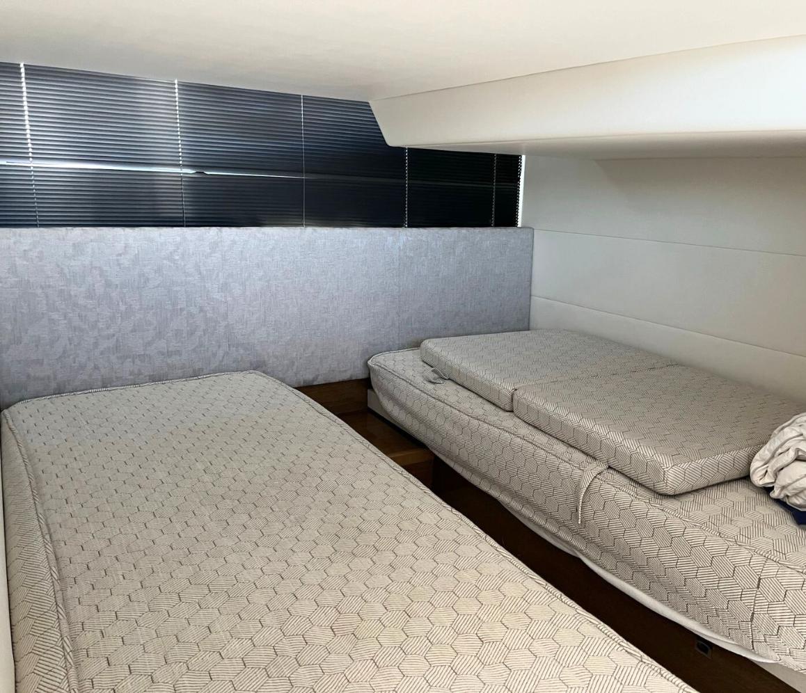 The aft guest cabin includes two single beds, additional storage, a small sofa, and a wardrobe. It offers generous headroom and comfort, even for extended stays, and is ideal for either adults or children.