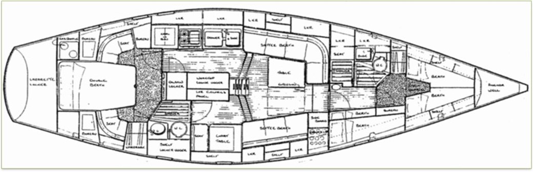 V-Berth with Insert, Shelves above and Hanging Locker. Lockers under Berths