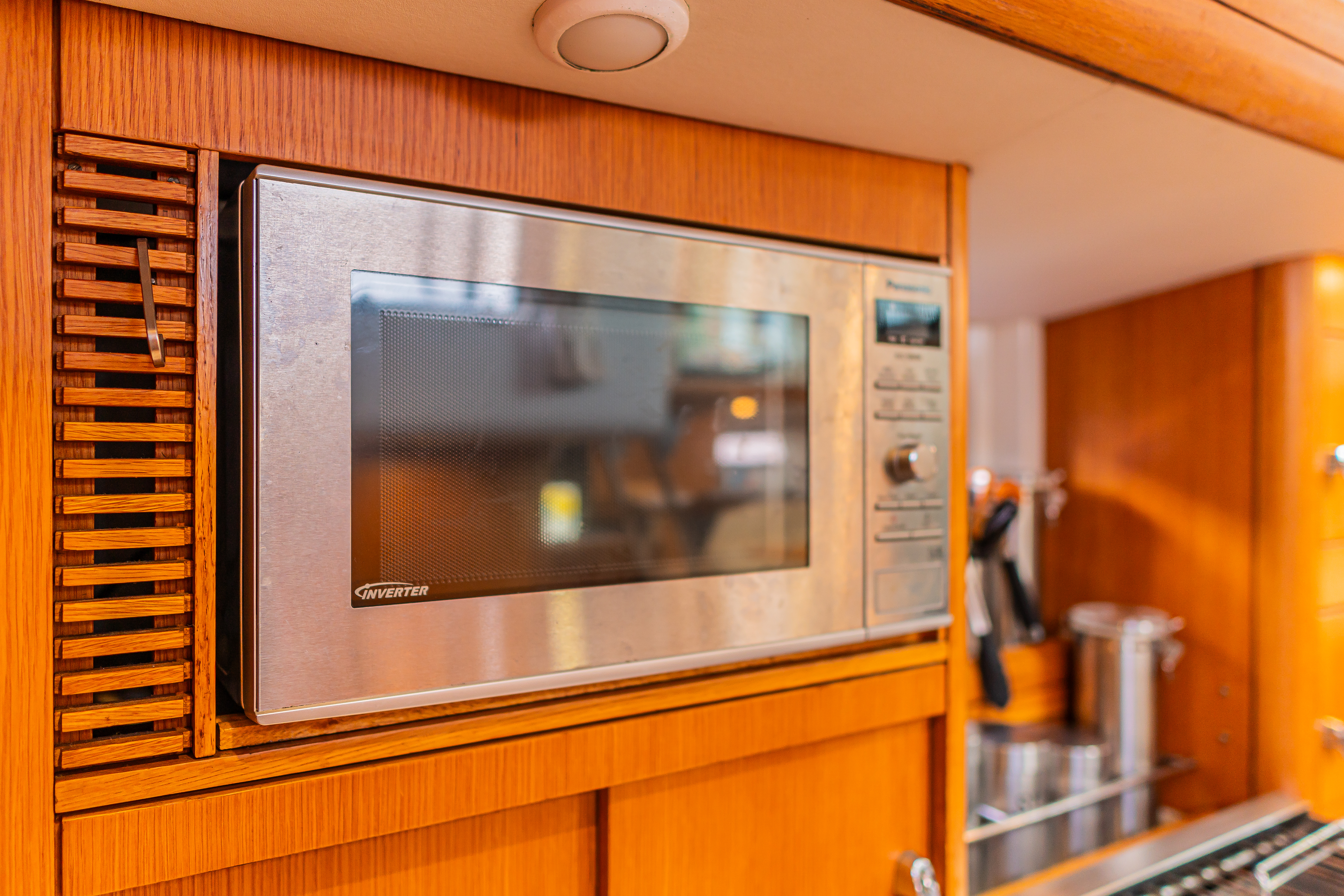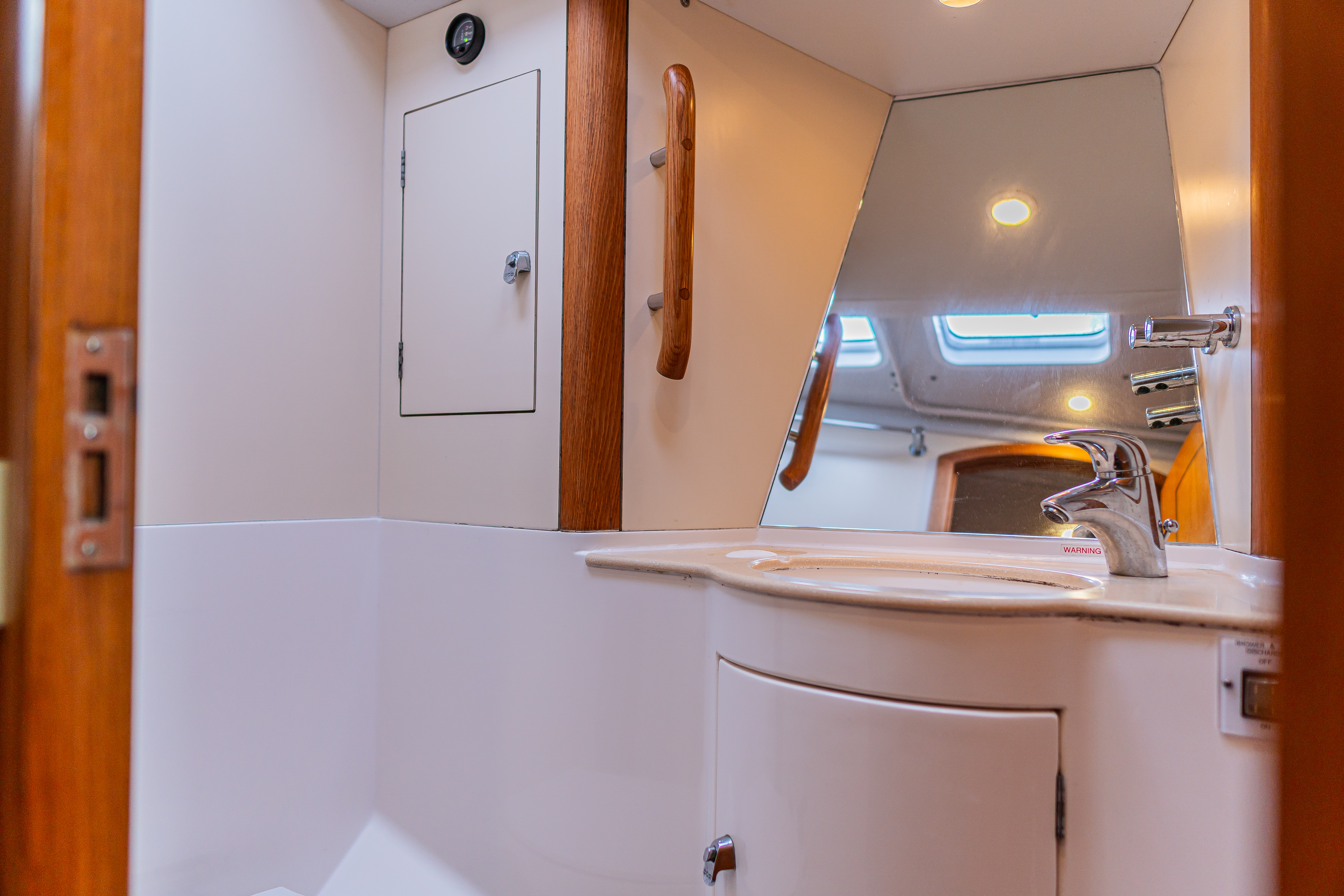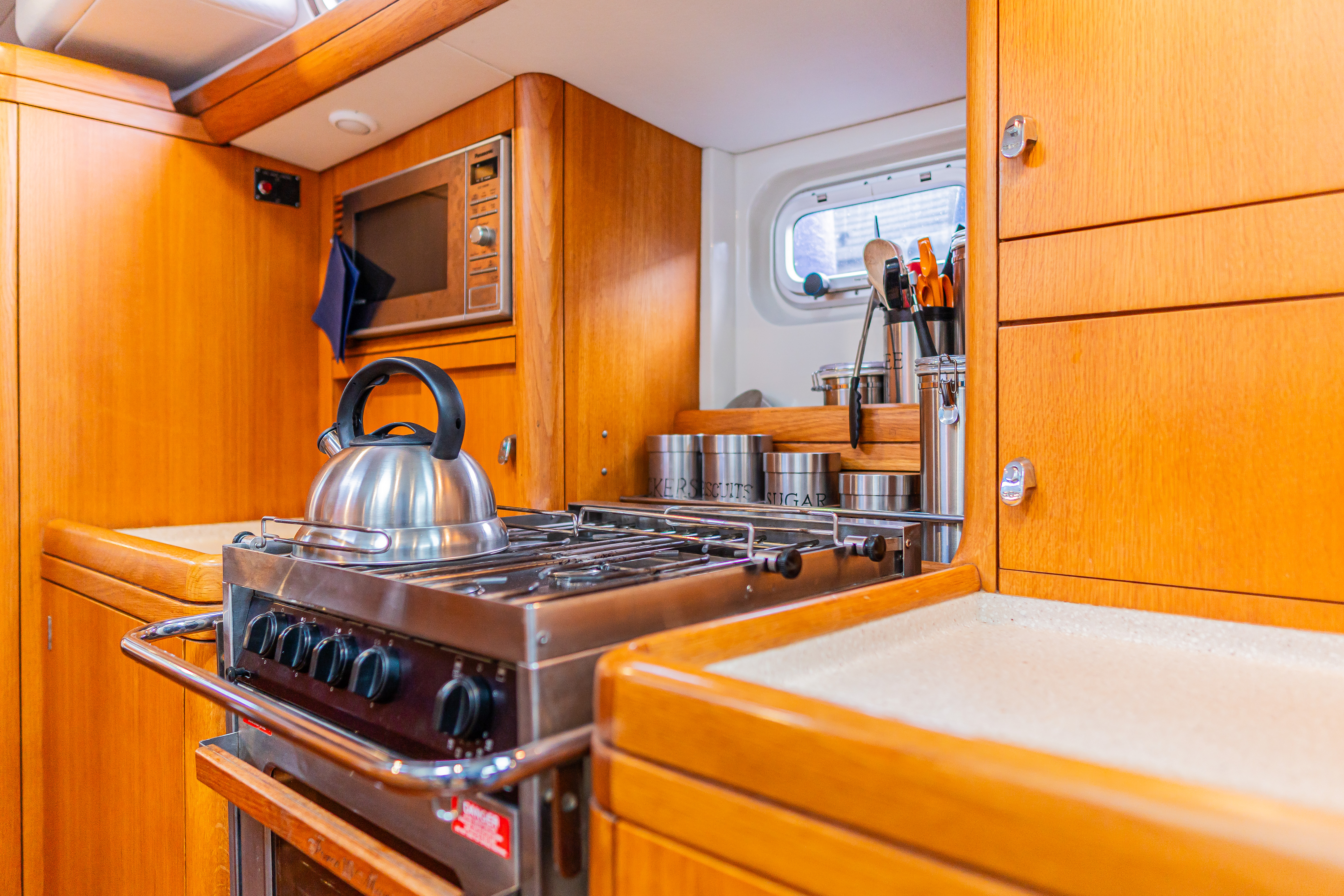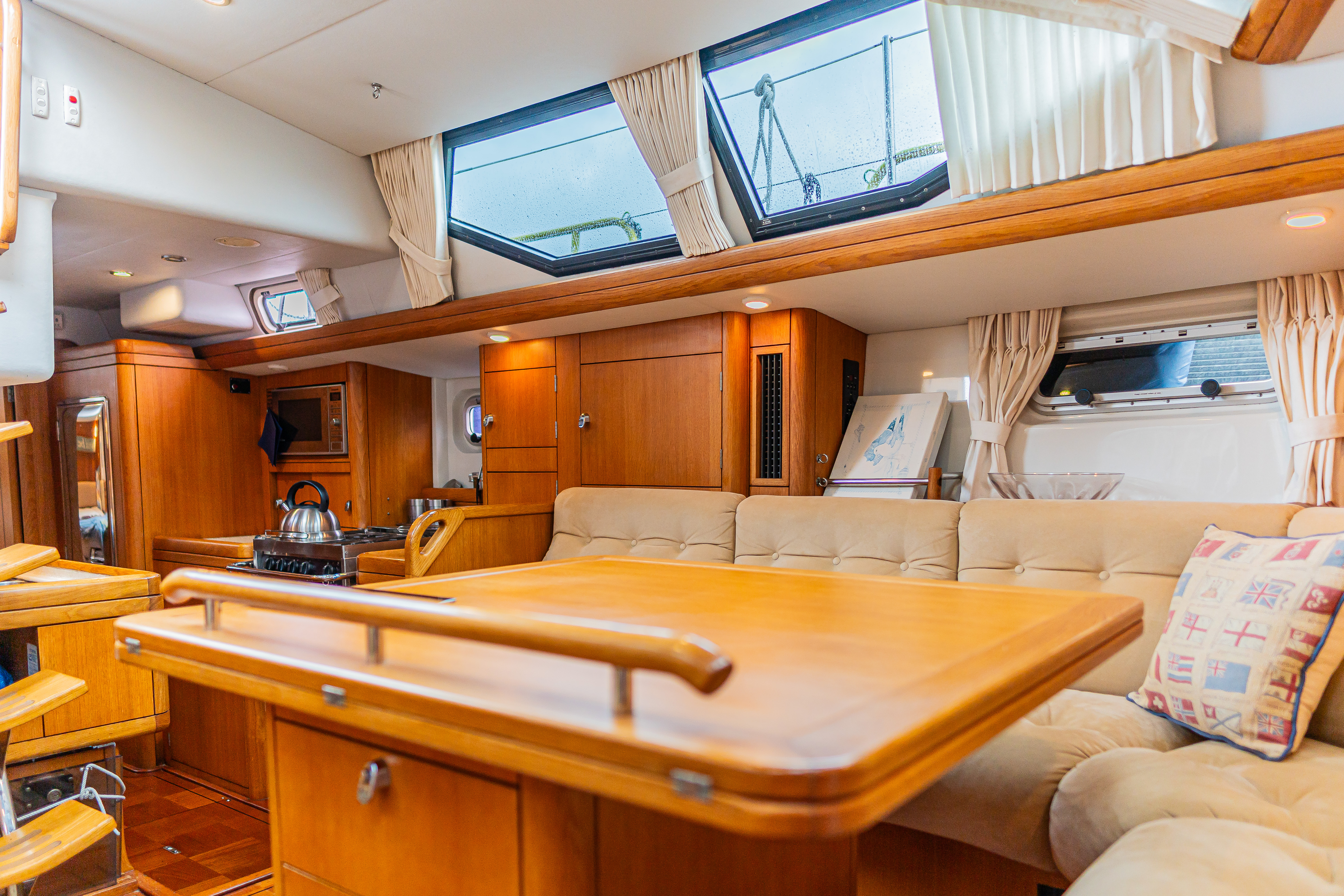 Accessible via the door inboard of the chart table, connects the aft to the utility workshop / stowage locker beneath the cockpit. Proves a very handy storage area