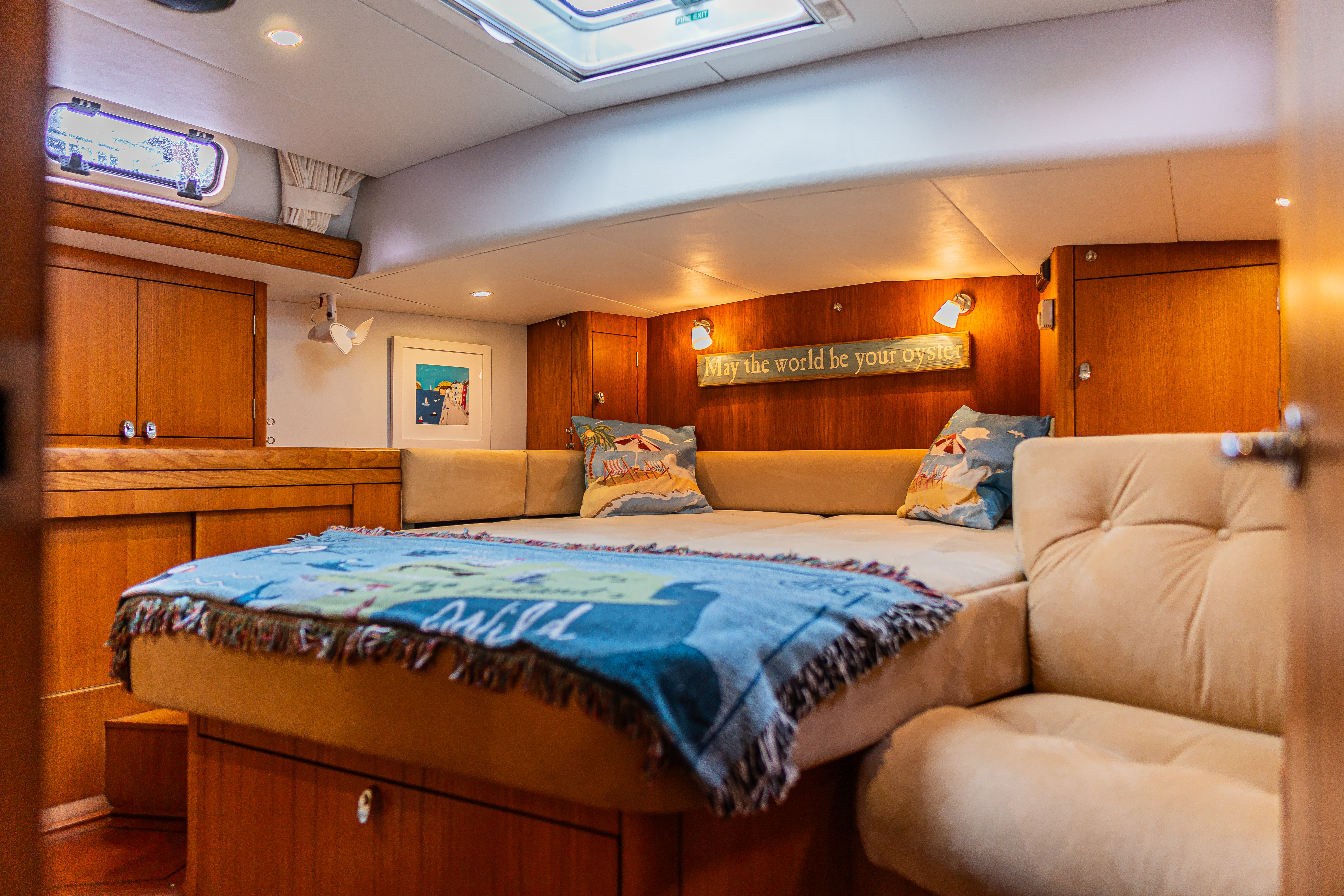 To starboard, a two seater settee which extends beneath the forward counter top into a trotter box, forming a useful sea berth.
