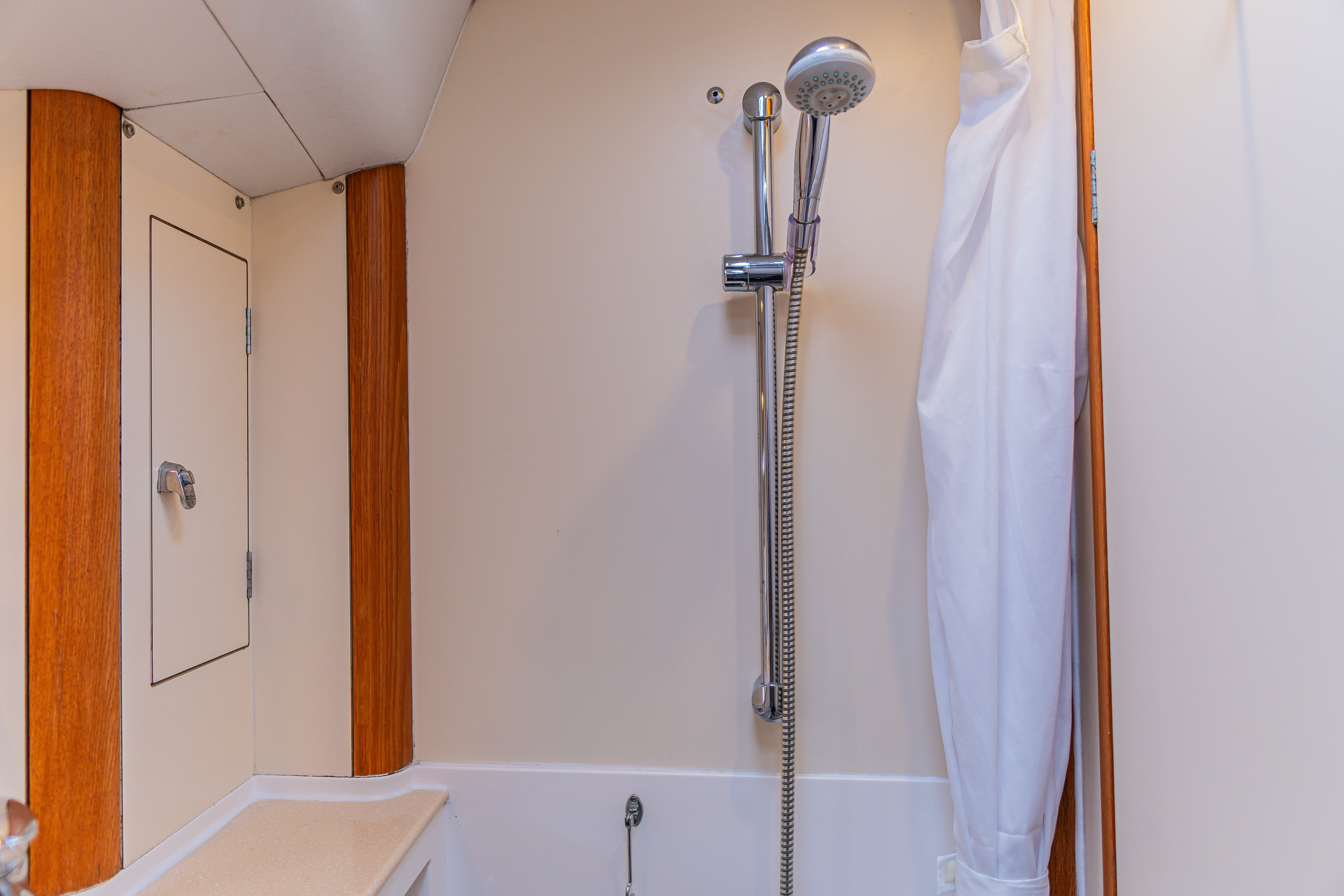 Shower area with teak planked naval grating