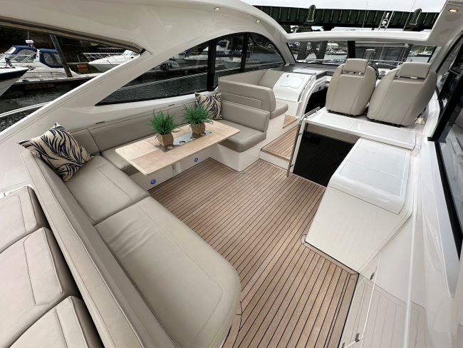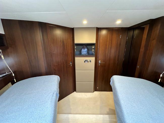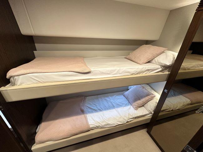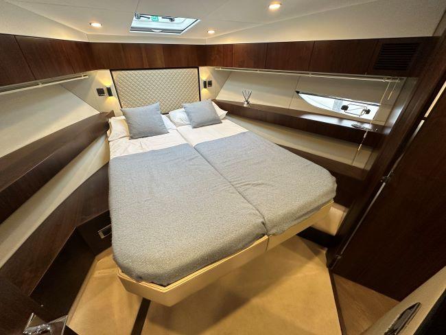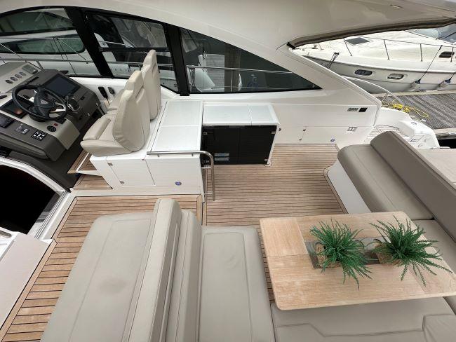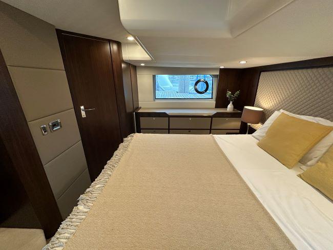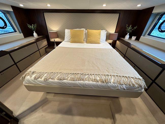 She is finished with spotless satin walnut joinery, complimented further with the leather seating, designer fabrics and cabinetry that Fairline are renowned for.