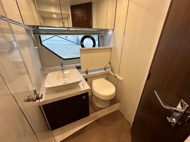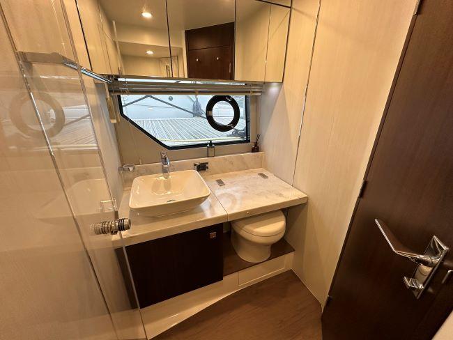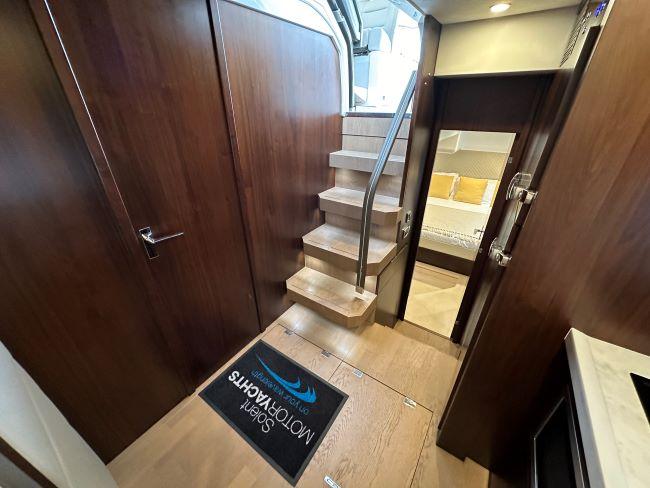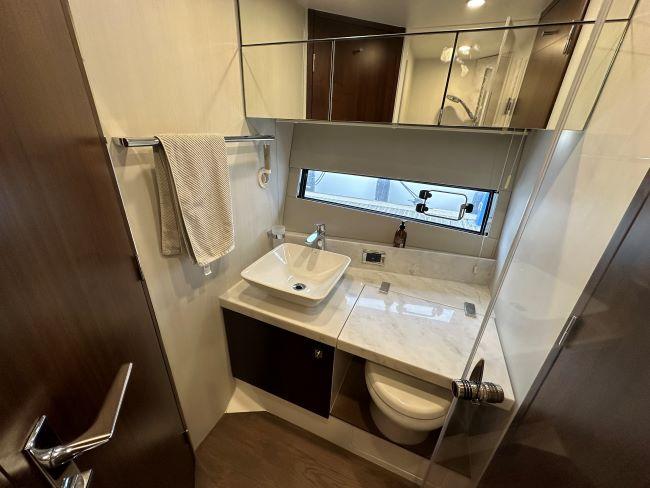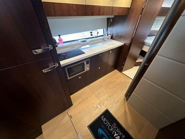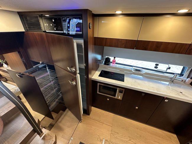 Dropping down into the lower deck you find the fully equipped galley which comprises of storage for custom Fairline cutlery and crockery and all the essential requirements including combination microwave/oven/grill, large refrigerator and separate freezer, ceramic hob and dishwasher and plenty of storage