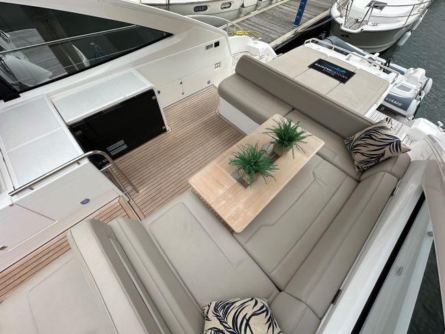 Large cockpit seating to port with triple aft sun pad (over tender garage), wet bar to starboard with BBQ, icemaker, fridge, sink, Fusion remote and storage
