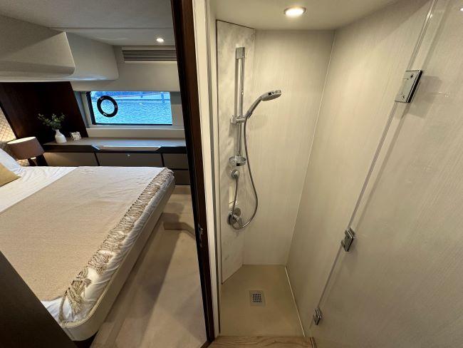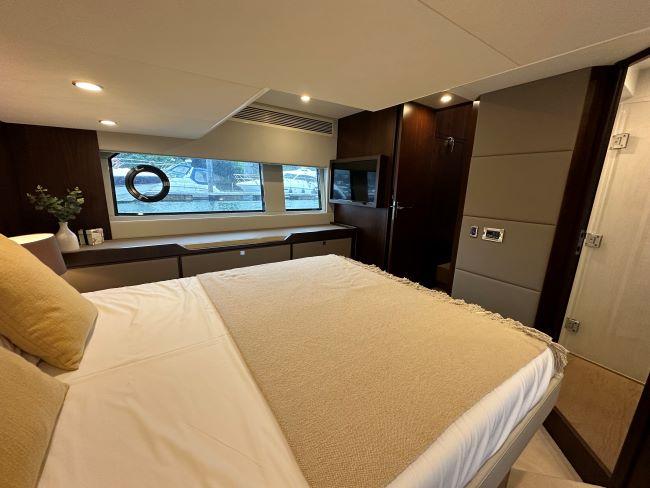 Full width master midship cabin with large central island berth, sofa to starboard, plenty of storage throughout and a spacious en-suite head and separate shower cubicle
