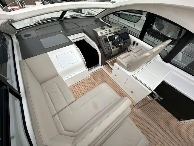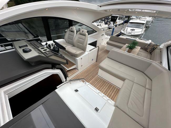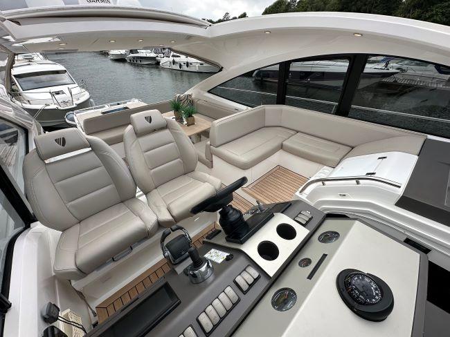 Co-pilot chez lounge to port with twin helm seats to starboard with all the engine and navigational aids required.