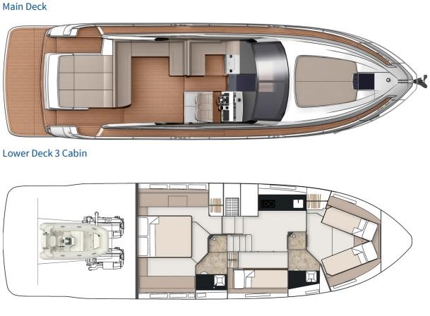 There’s space, and lots of it. Beautifully considered sociable areas, luxurious and stunning in their simplicity. The cabin layout features a fabulous mid master with an optional sofa that converts into an additional bed, there’s a forward double cabin that can convert to a V-berth and the option of a third cabin in lieu of a dinette. The perfectly formed galley enjoys a tall fridge/freezer and pull out larder.