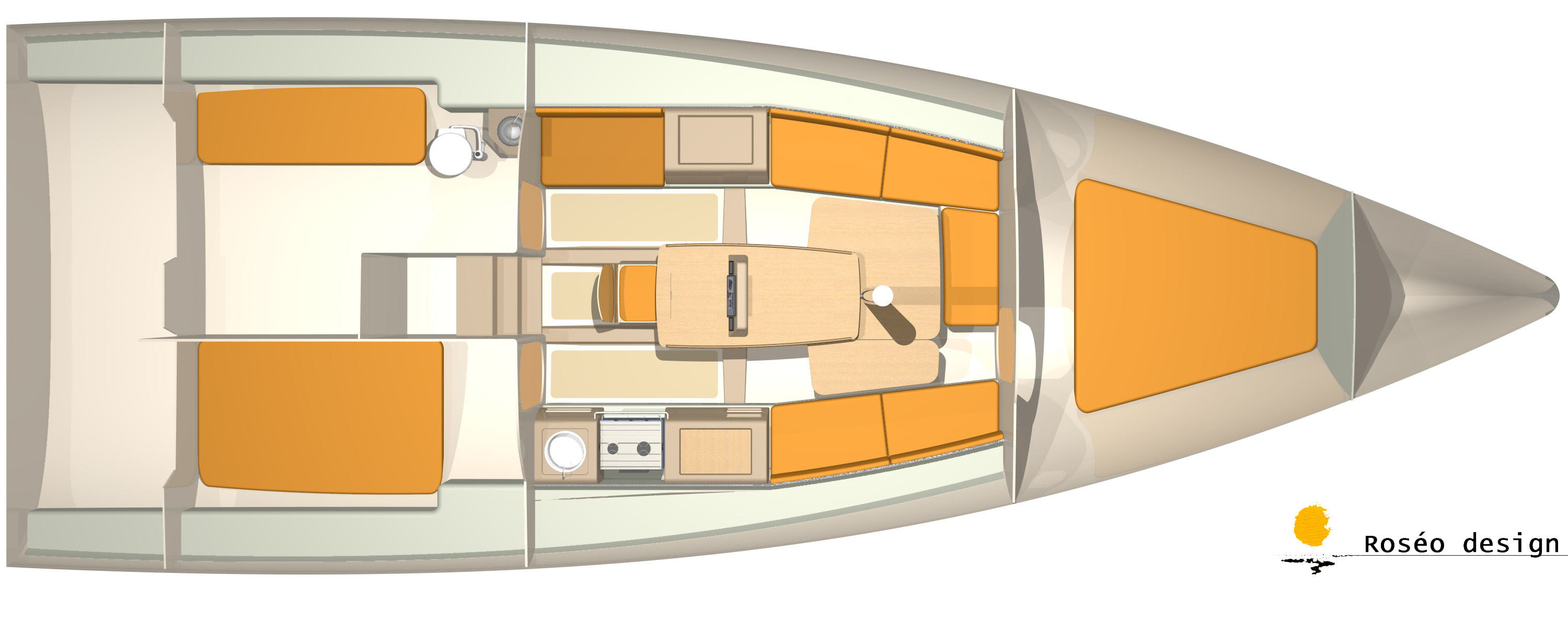 Layout: 1 forward + 2 aft cabins, central nav’ station and galley