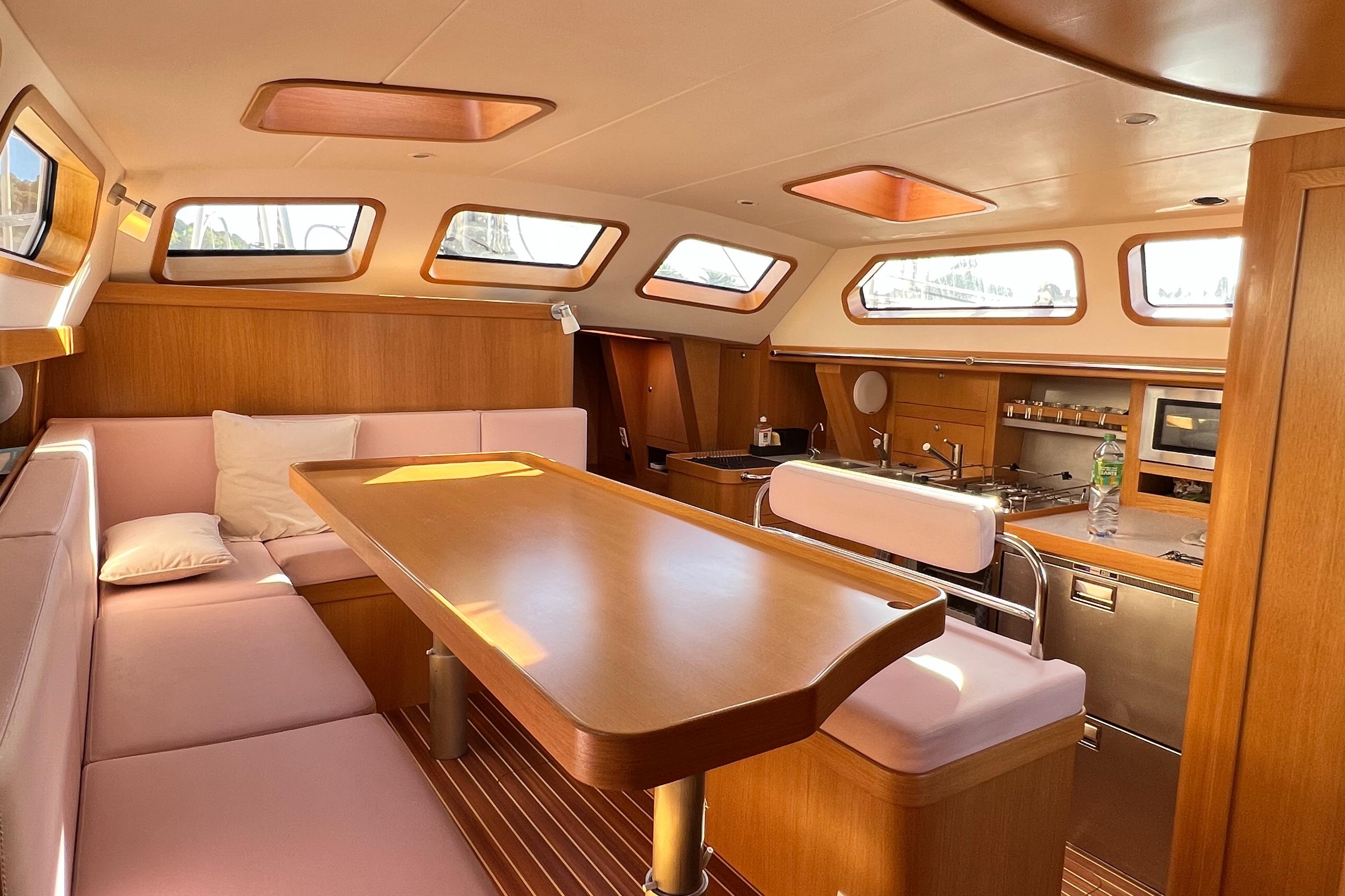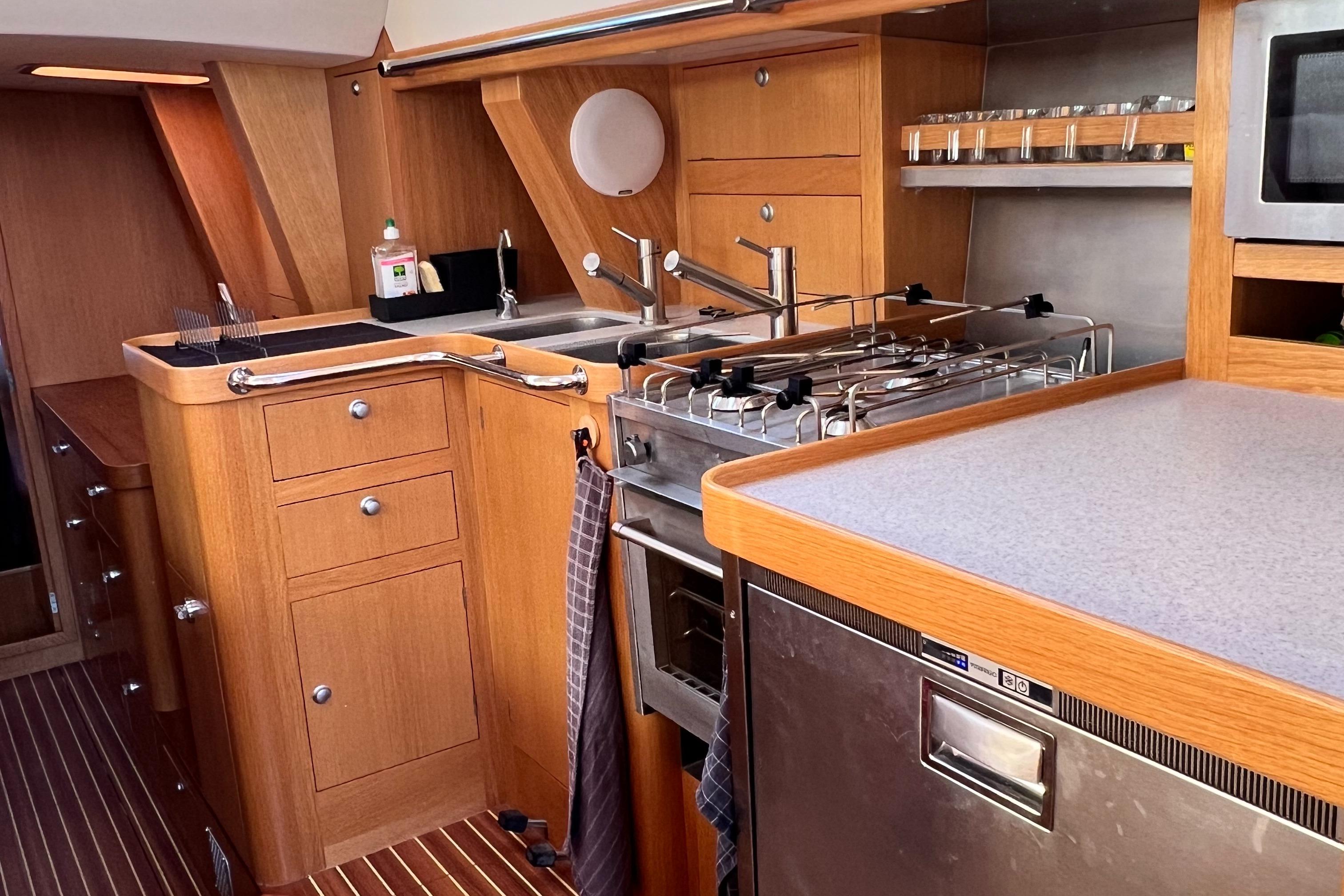 Cuisine en coursive, établi massif, accès direct depuis cockpit via doghouse étanche