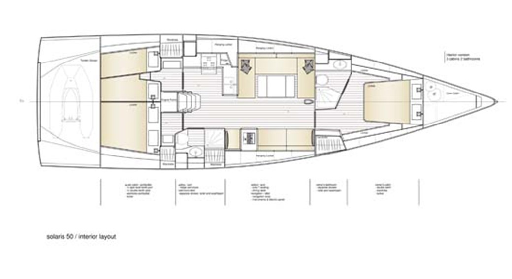 A vendre Solaris 50 de 2017, version 3 cabines avec carre convertible. Equipement complet pour régate avec mat, bôme et pataras en carbone. Jeu de voiles très complet, détail complet dans inventaire.