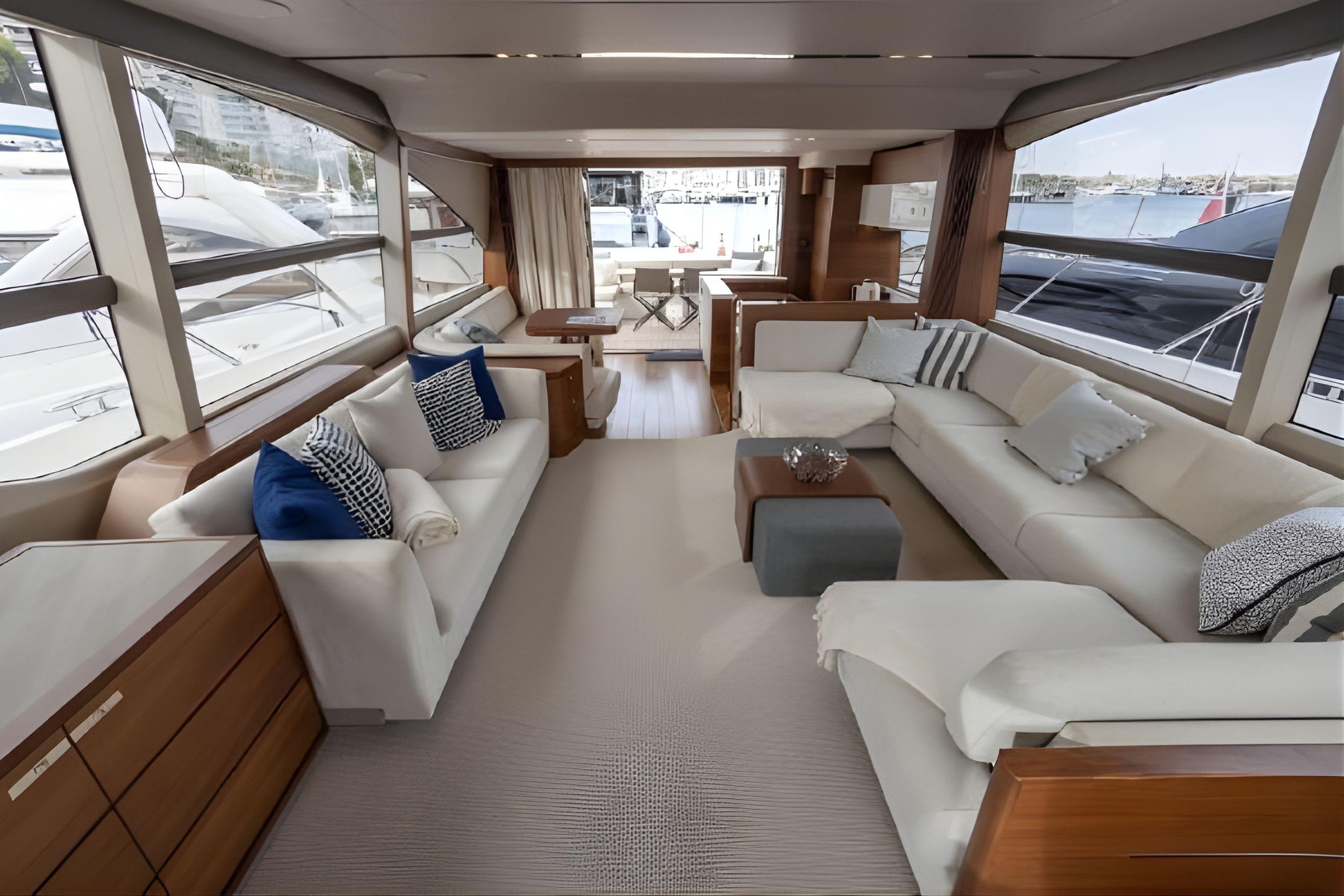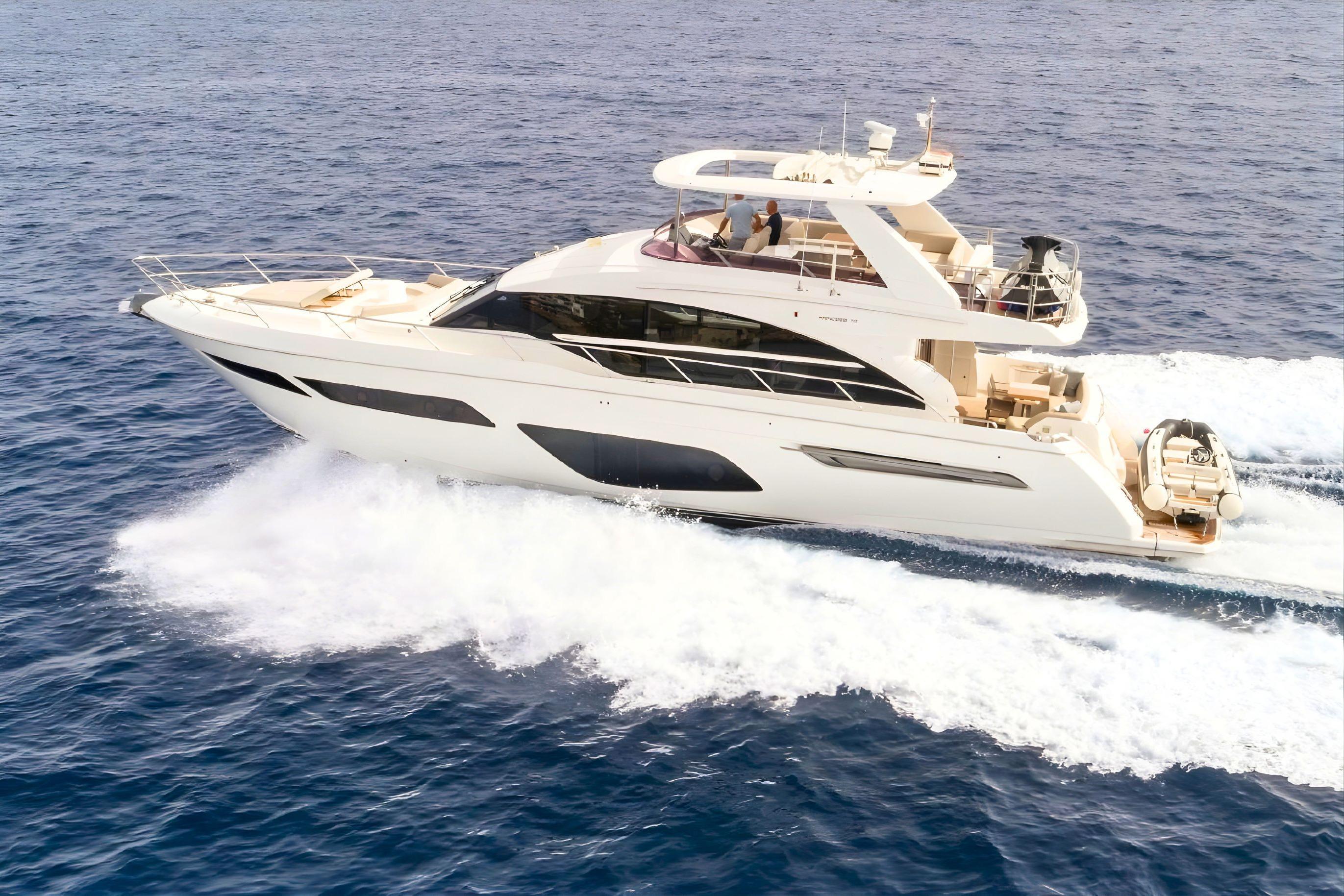 Princess F70 is a fully equipped, turn-key motor yacht, perfectly suited for long days and extended cruising at sea. Her elegant white exterior, macadamia-toned upholstery, leathers and satin wood finishes create a timeless yet modern style. She accommodates 8 guests in an ensuite Master, a VIP, and two convertible Twin cabins, plus a separate crew cabin for two. Powered by twin MAN V12 1400HP, she cruises effortlessly at 27 knots, offering a spacious and contemporary layout ideal for both cruising and entertaining.