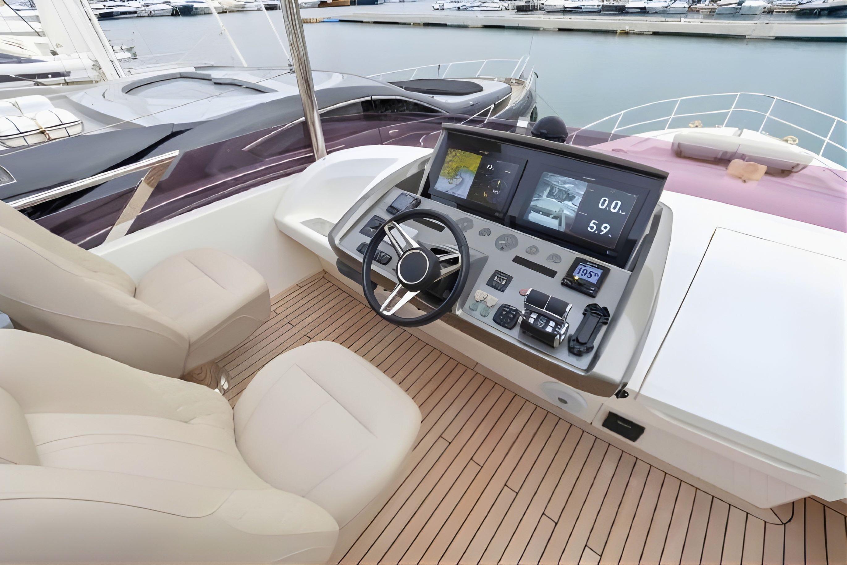 Exceptional interior and exterior living across main salon, cockpit, bow, & flybridge Retractable hardtop on the flybridge Equipped with gyroscopic Seakeeper 16 stabilizer Capable of carrying both a tender and a jet ski