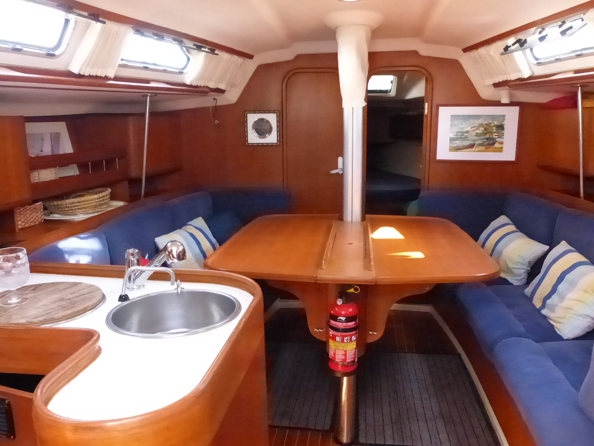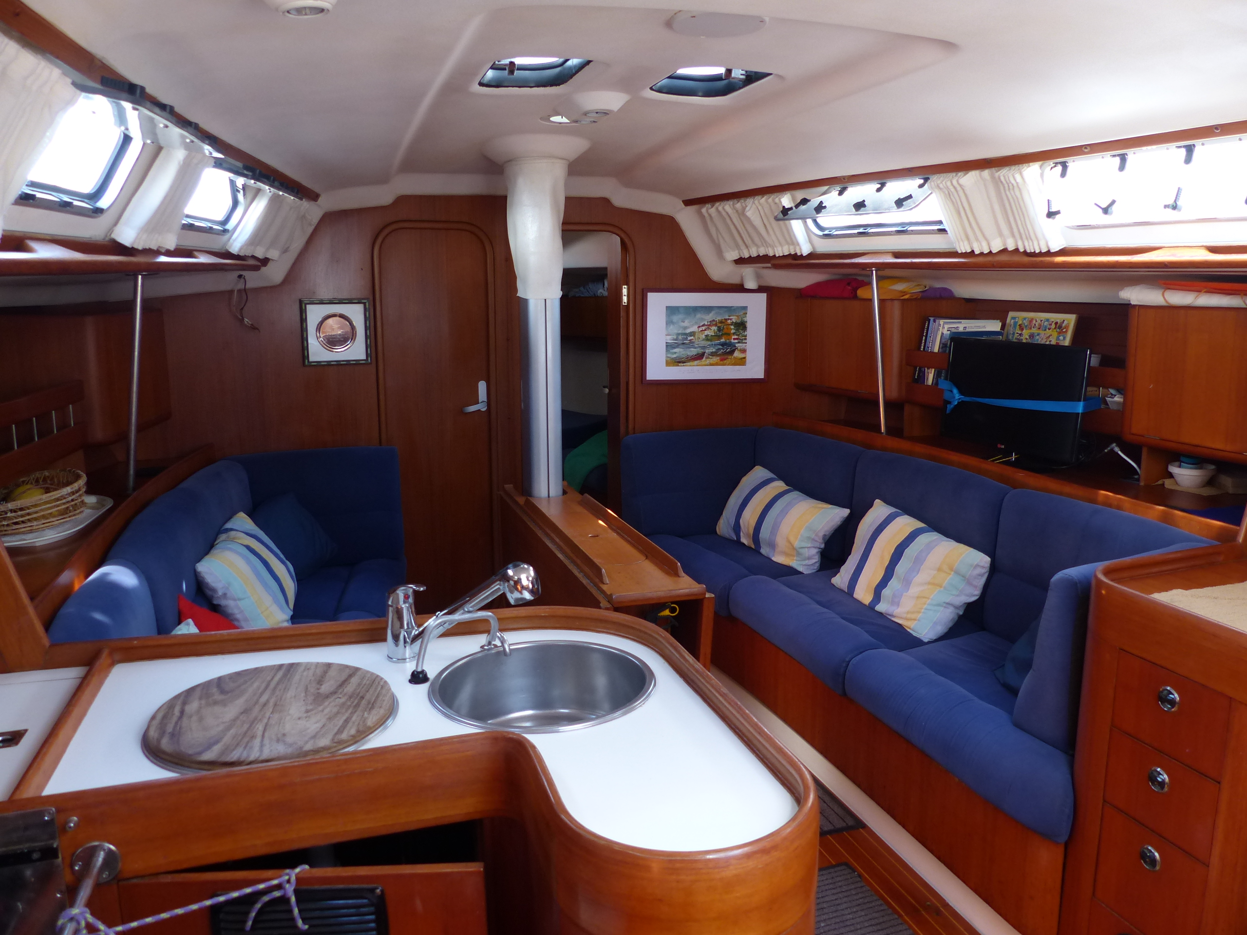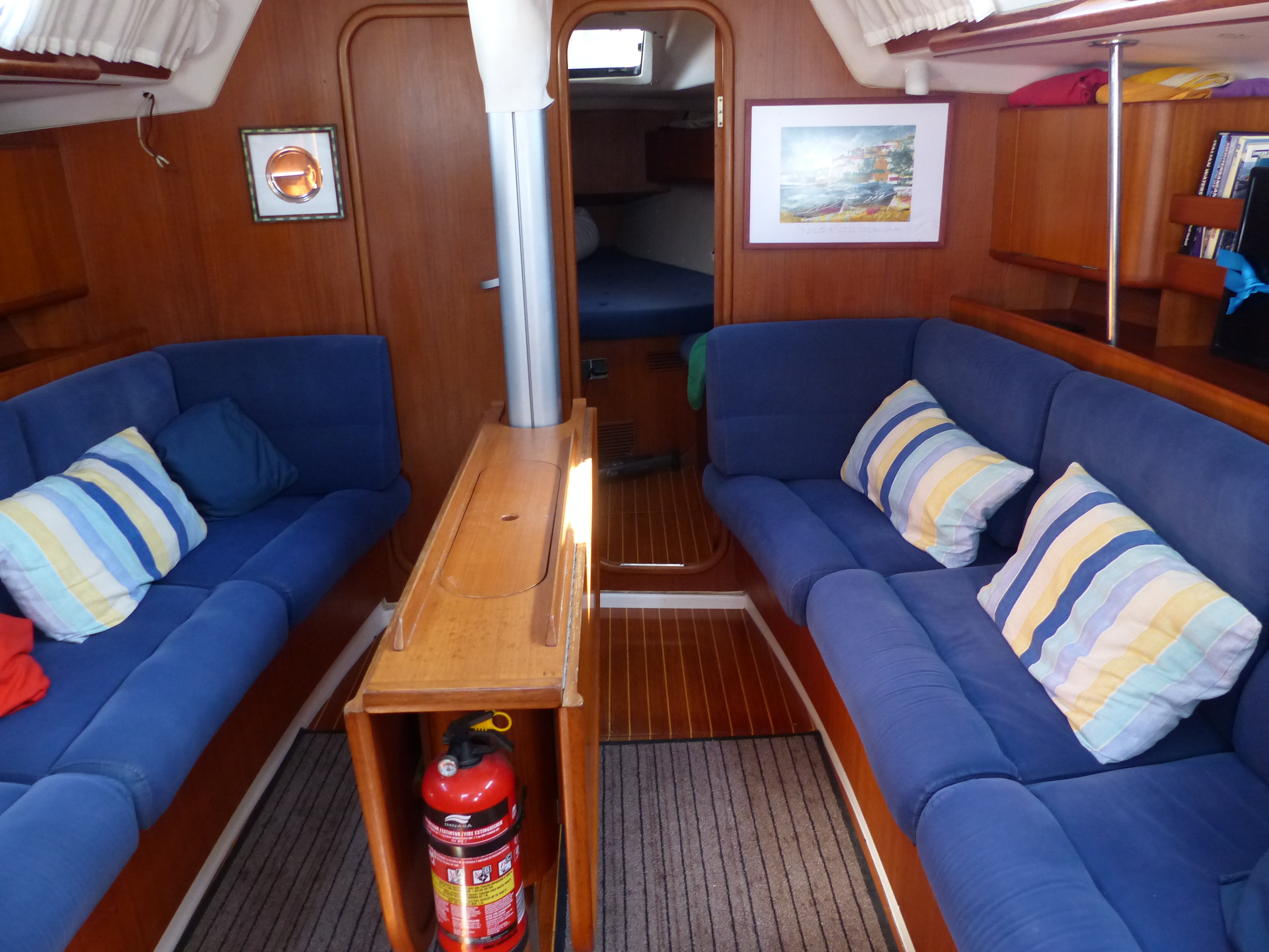 Two sofas, one to pot and one to starboard with a fold away table in the middle