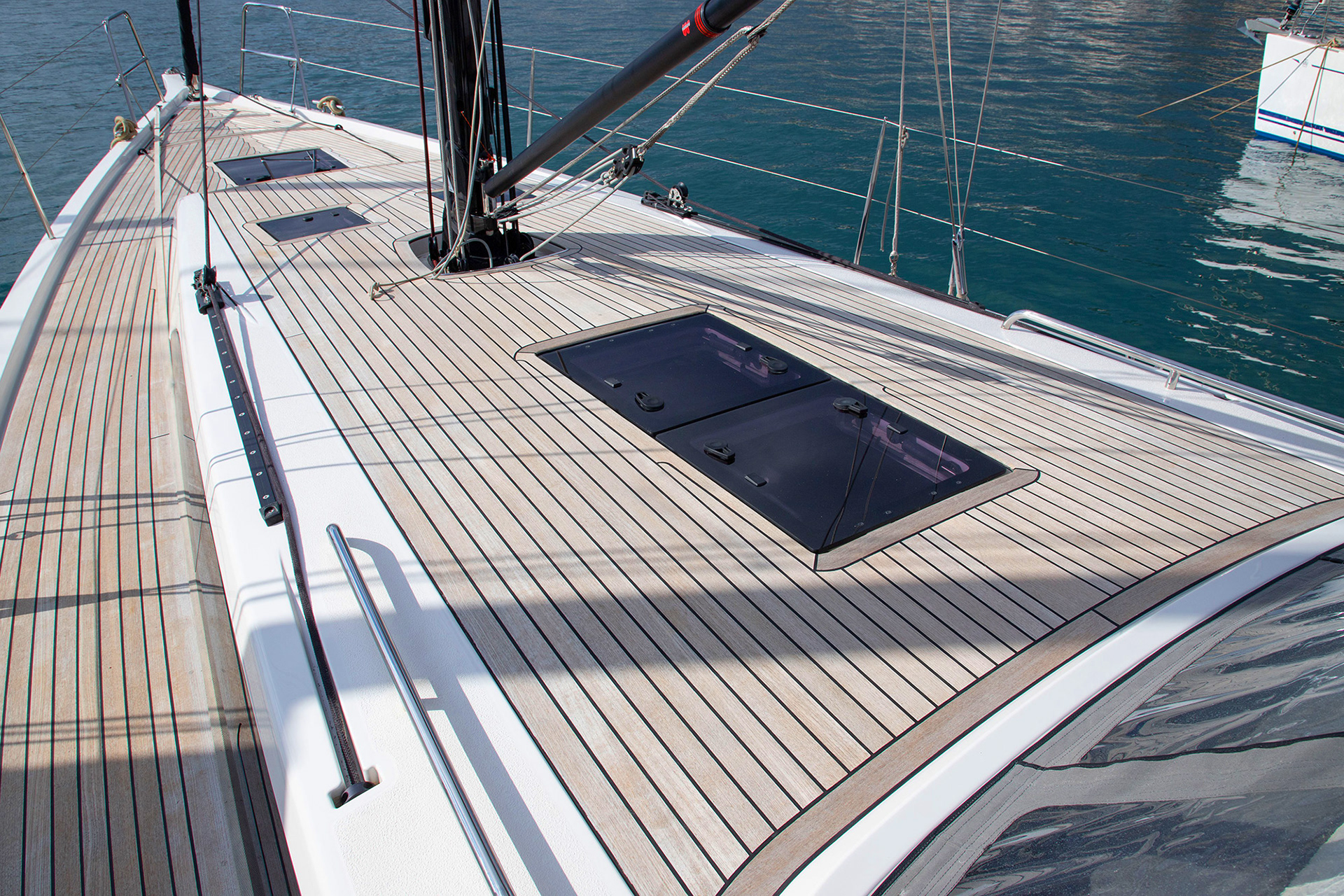 • The deck uses a polyester resin system and the skins are primarily biaxial glass layers with strategically positioned local unidirectional reinforcements for strength.